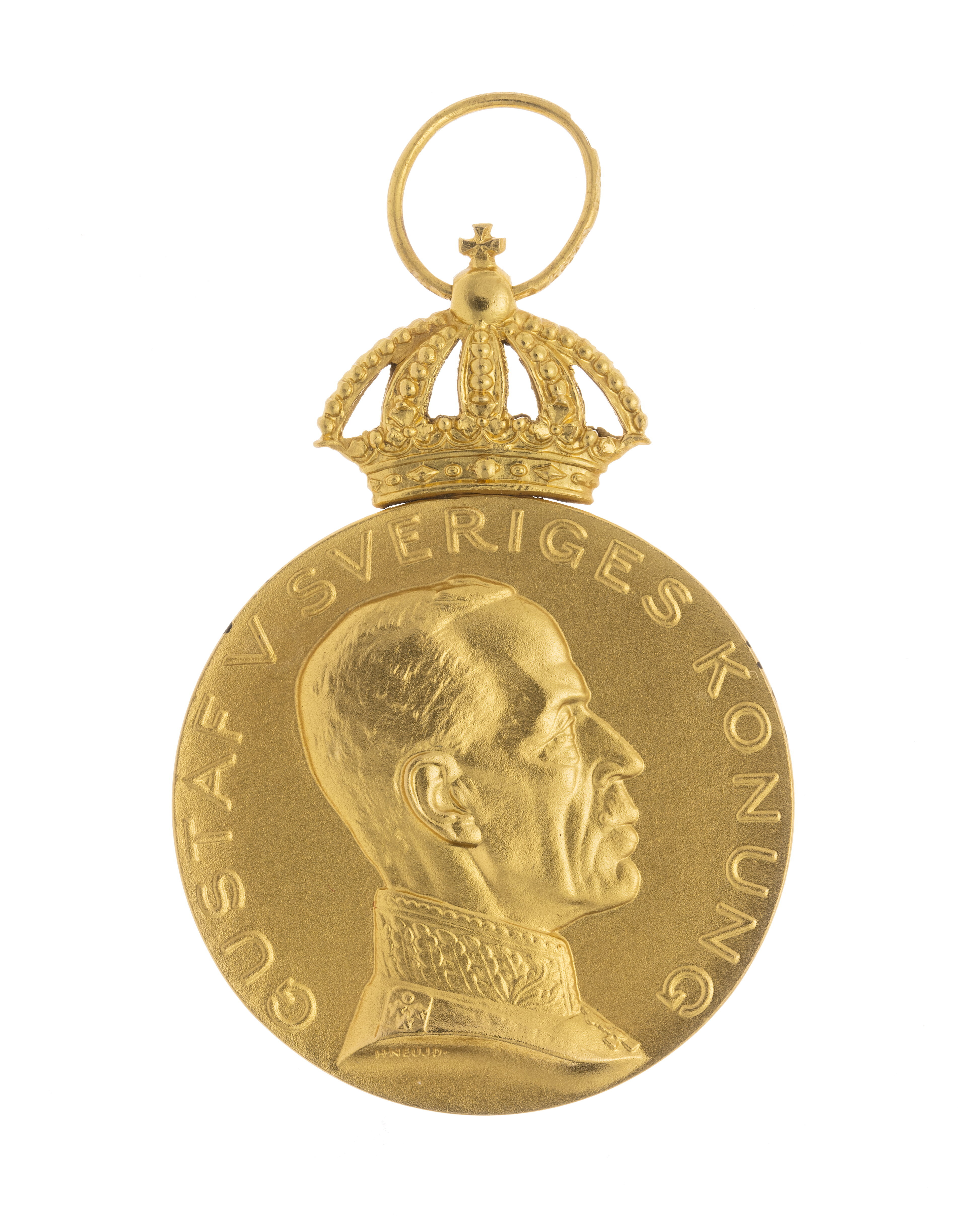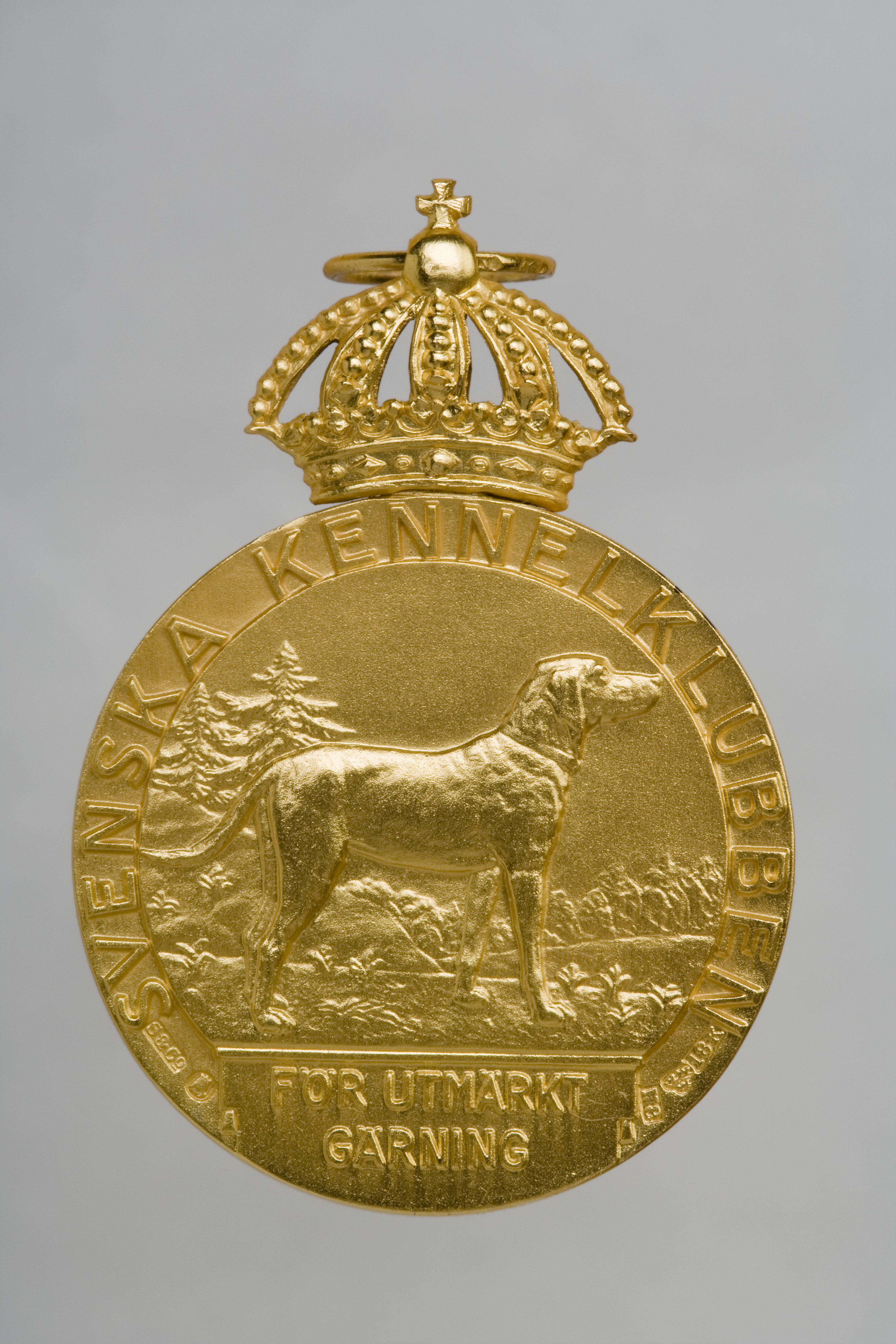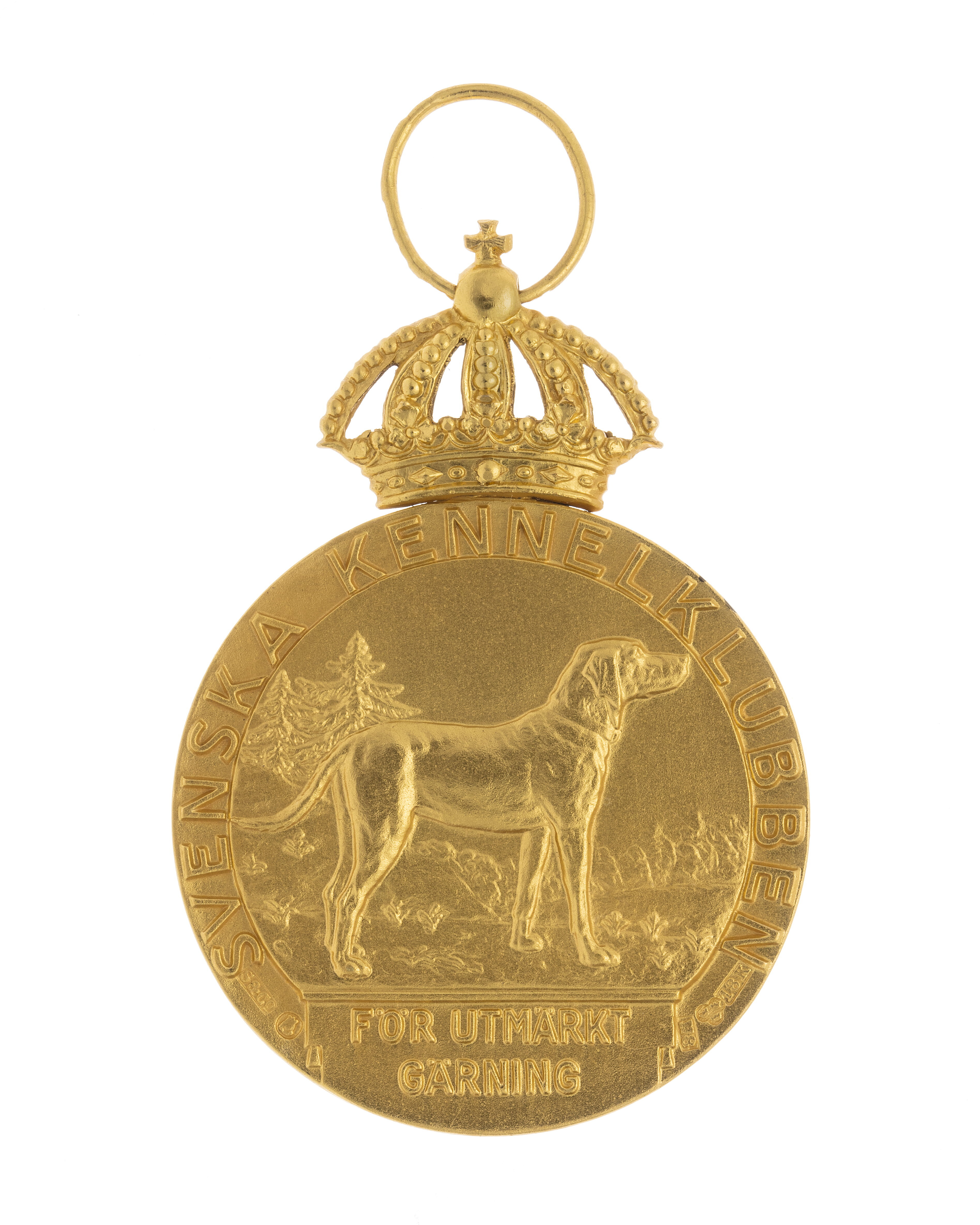Krönt guldmedalj, åtsida: Gustaf V, halsbild, profil h, generalsuniform, signatur vid avsnittet: "H. NEUJD", omskrift: "GUSTAV V SVERIGES KONUNG". Frånsida: reliefbild, hund (hamiltonstövare?) i landskap, därnedanför platta med relieftext: "FÖR UTMÄRKT // GÄRNING", omskrift, relieftext:"SVENSKA KENNELKLUBBEN", vid nederkanten stämplar: S&CO, S:t Erik, N8, tre kronor, 18 K, (Sporrong & Co, Stockholm 1939). Igenom äpplet draget ring av guld stämplad: CFC, tre kronor, 18 K, S:t Erik, N 8 (C.F.Carlman, Stockholm 1939).