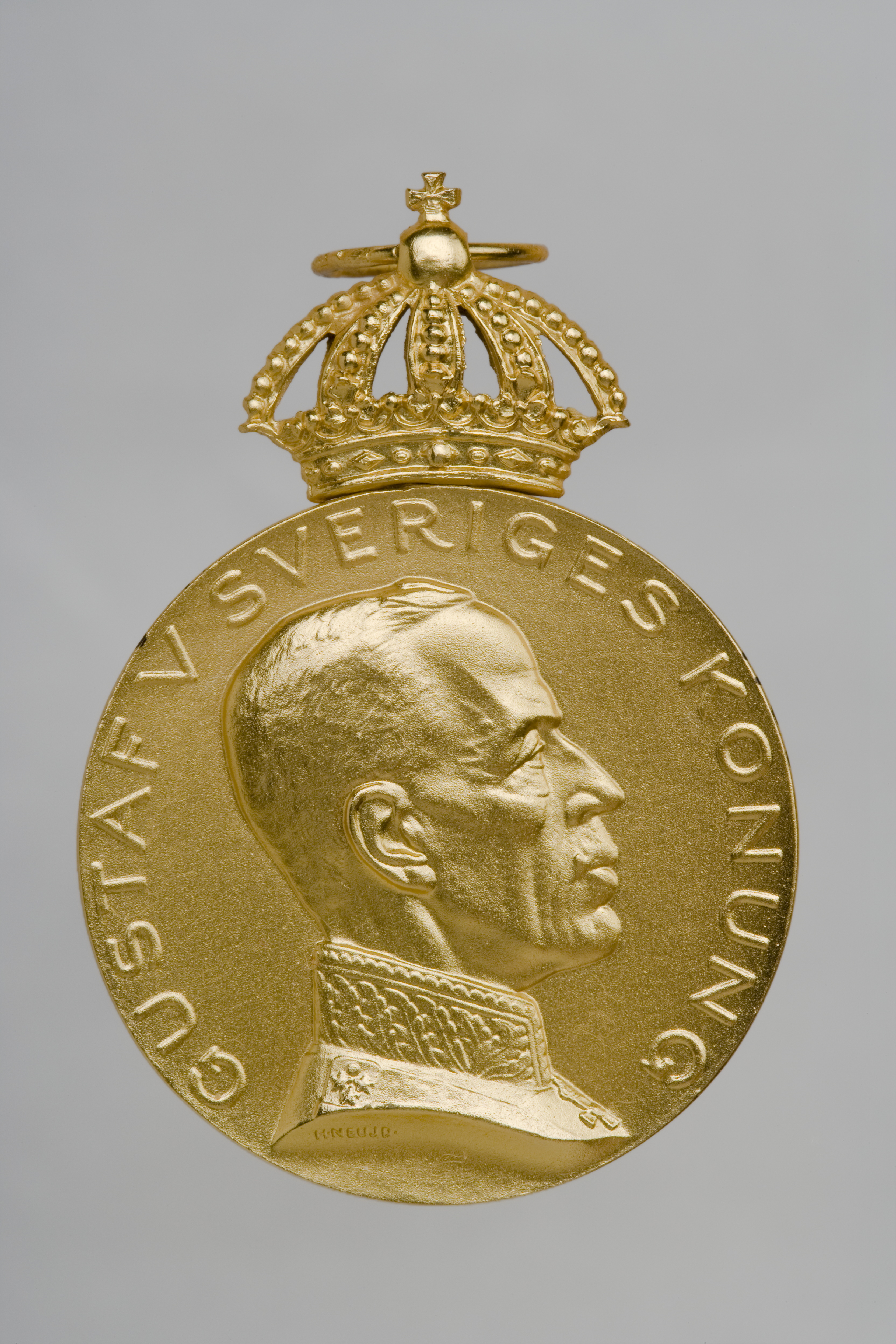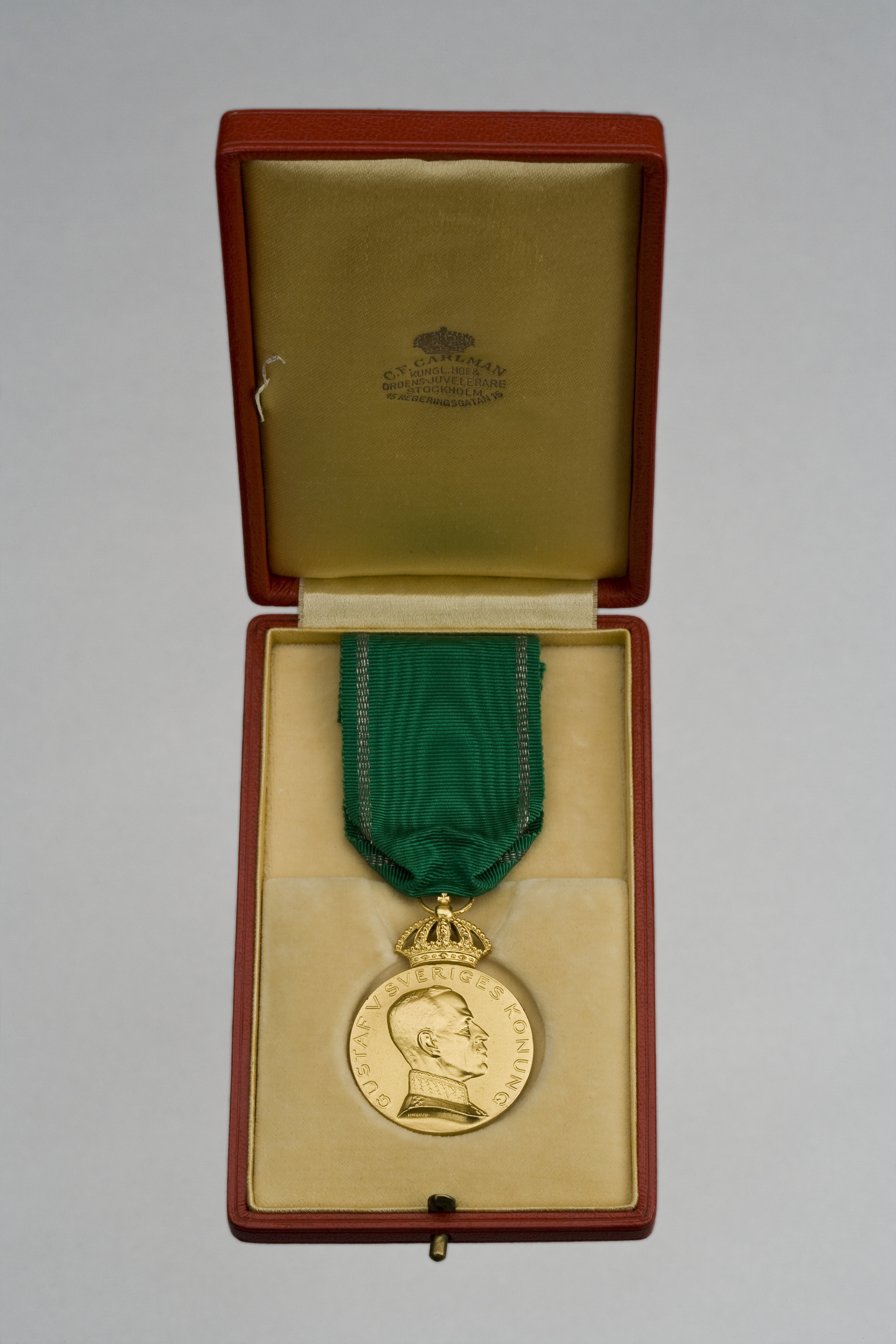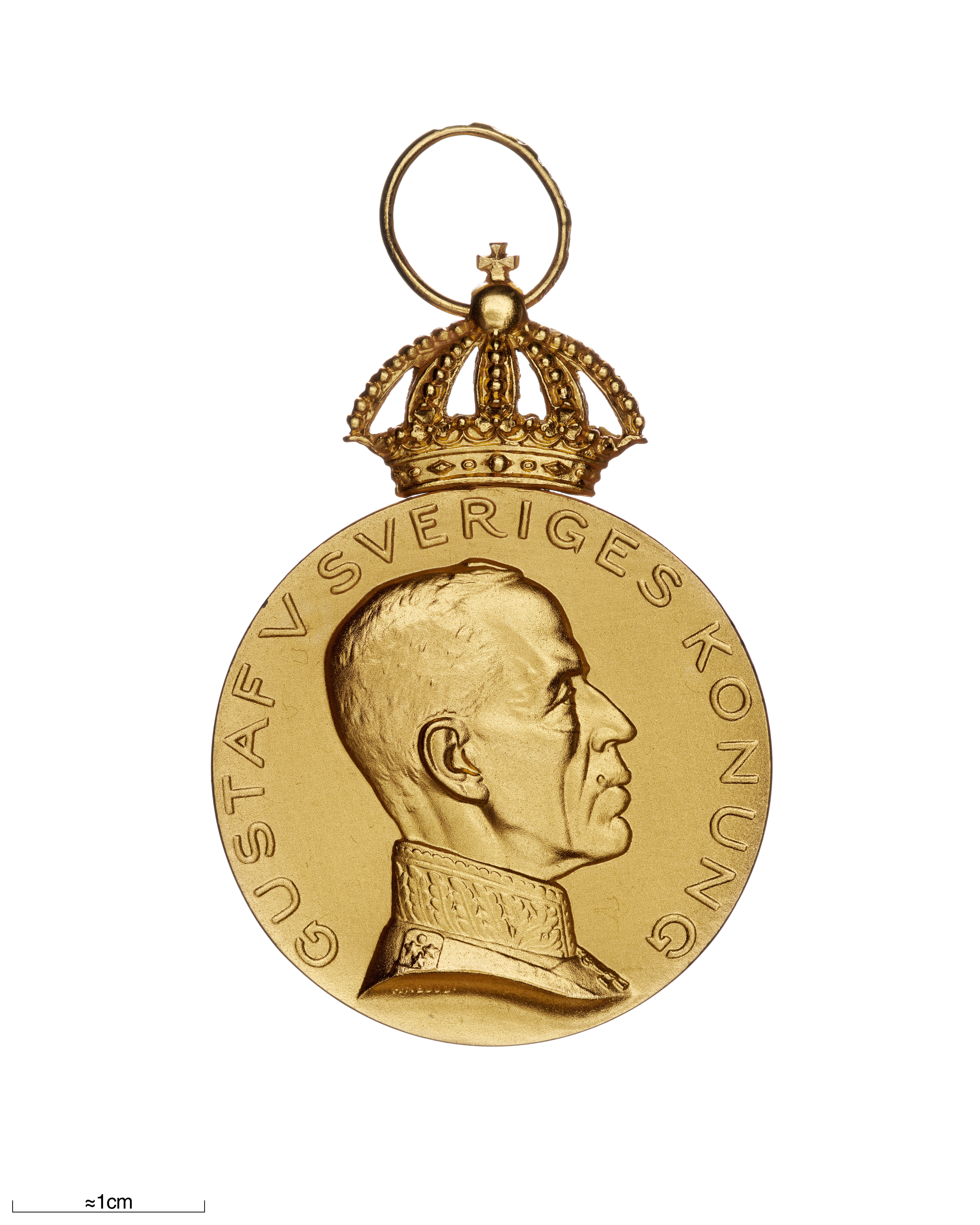 Krönt guldmedalj, åtsida: Gustaf V, halsbild, profil h, generalsuniform, signatur vid avsnittet: "H. NEUJD", omskrift: "GUSTAV V SVERIGES KONUNG". Frånsida: reliefbild, hund (hamiltonstövare?) i landskap, därnedanför platta med relieftext: "FÖR UTMÄRKT // GÄRNING", omskrift, relieftext:"SVENSKA KENNELKLUBBEN", vid nederkanten stämplar: S&CO, S:t Erik, N8, tre kronor, 18 K, (Sporrong & Co, Stockholm 1939). Igenom äpplet draget ring av guld stämplad: CFC, tre kronor, 18 K, S:t Erik, N 8 (C.F.Carlman, Stockholm 1939).