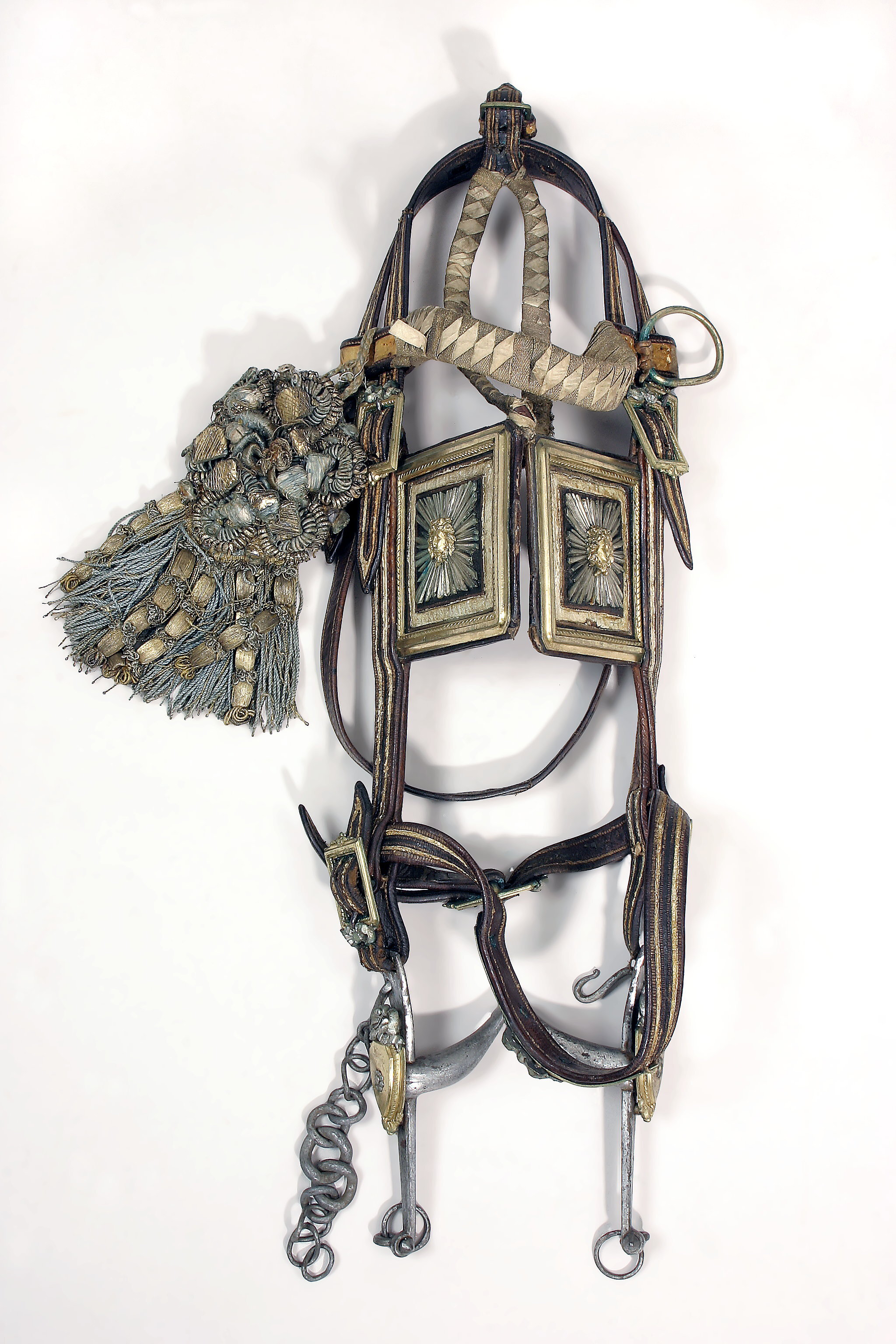 Stångbett av förtennat stål, duvhalsformigt rörligt bett. Sköldformad buckla av förgylld, gjuten mässing, med rosett upptill, försilvrad, fastnitad. Lekare med tygelring. Upptill kindkedja och krok samt rektangulärt hål för sidostycket. Huvudlag av läder med dekorsömmar samt imålade vita ränder. Mellan ränderna mittfält av svart läder. På nosbandet ett långsmalt, fastnitat bleck av förgylld mässing med försilvrade nithuvuden och rosett. Sidostyckenas bredd 24 mm, upptill och nedtill fästade med rektangulära söljor av förgylld gjuten mässing. På söljorna fastnitade rosetter. Sidostycken övergår i nackrem, vilken är delad. Den andra hälften är utdragen och övergår i käkrem, vilken har en likadan, samt en plan rektangulär, förgylld sölja med växtornamentik. Fästade på sidostyckena och stjärnremmen är två rektangulära skygglappar, 125 x 115 mm. Dessa är kantade av gjutna profilerade ramar, förgyllda. Mittbild med Medusahuvud, förgyllt, omgivet av försilvrade strålar på svart läderplatta. Mellan ram och mittbild ett 8 mm brett vitfärgat band. På huvudlagets högra sidan en rosett i form av runduddad kokard, blått silke, snörmakeriarbeten, guldfolie och guldtråd. Nedtill frans med fem rader pomponger, linne- guldtrådssnoddar. Pannband och stjärnrem inlindade i flätat blekt ljusblått siden- och guldband. På pannbandets v. sida är en förgylld ring fastsurrad.
