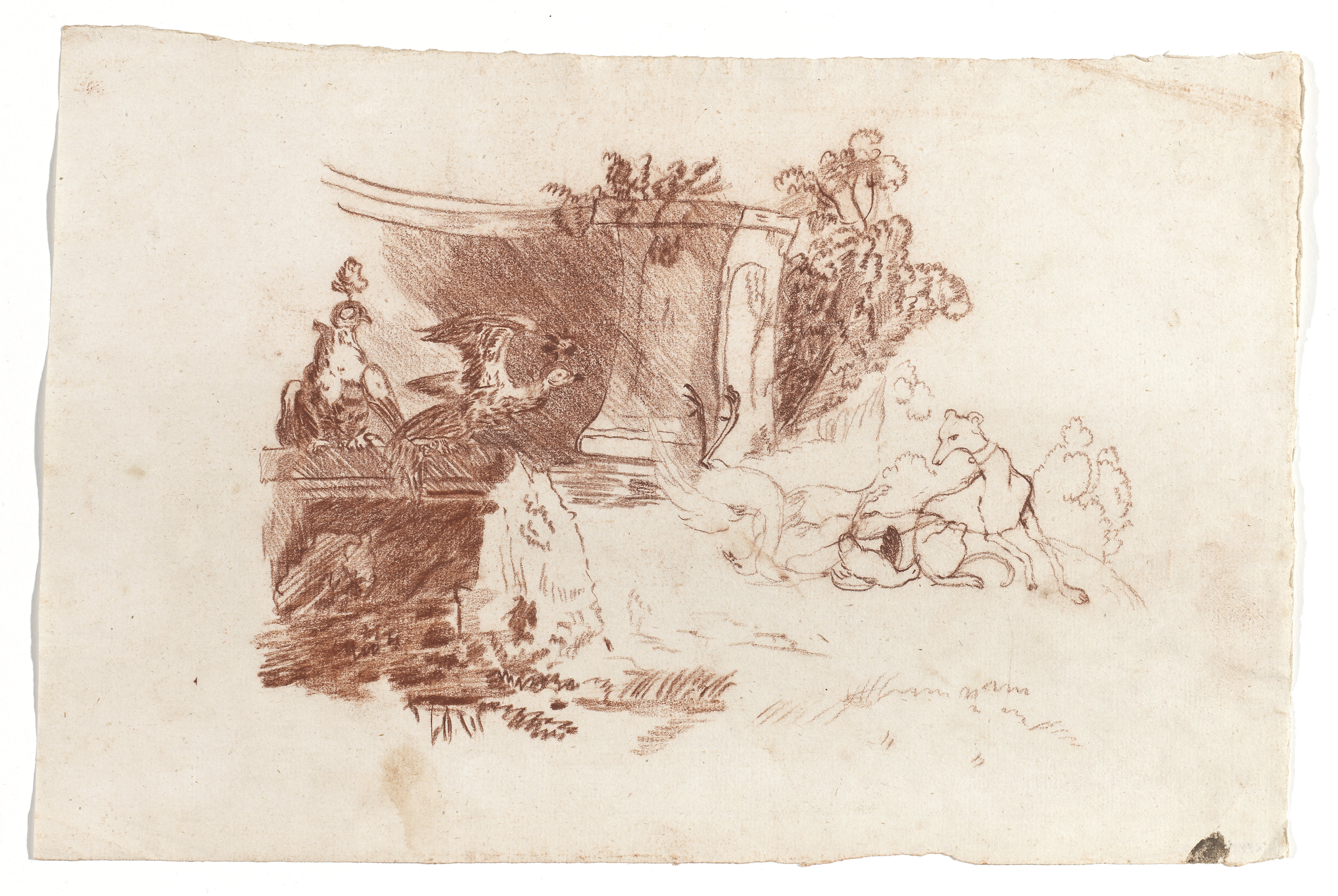 Ritstudie föreställande fåglar, 3 döda, och en hund, med skulpturpiedestal samt fragment av dito. Rödkrita på papper.