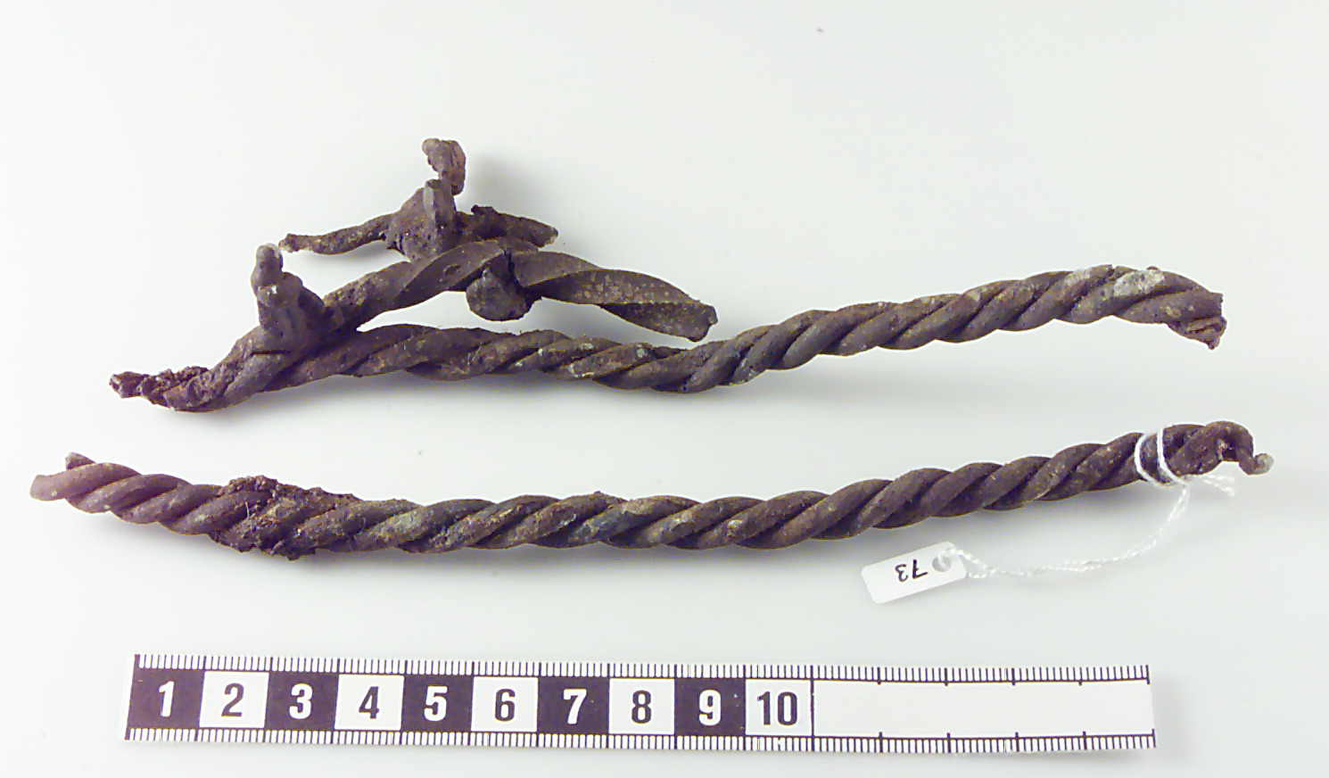 En ten av tre mindre tvinnade tenar och den andra smälta med ten av tre tvinnade tenar, en kvadratisk torderad ten samt vidhängande smälta.