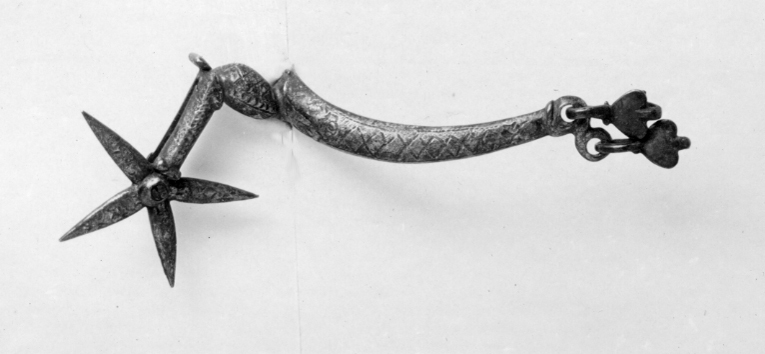 Sporre av stål med påslaget silver och guld och yttäckande, punsad ornering. U-formade skänklar, något uppåtböjda med dubbla ringformade hållare i ändarna, den ena med två hjärtformade hakar, den andra med en hjärtformad hake och en stor genombruten remsölja av försilvrad och förgylld mässing. Söljan med kraftigt utdragna sidor, formad till en spets. Hals vinkelformigt nedåtböjd, delen närmast skänklarna spolformig. Klinga stor femuddig.