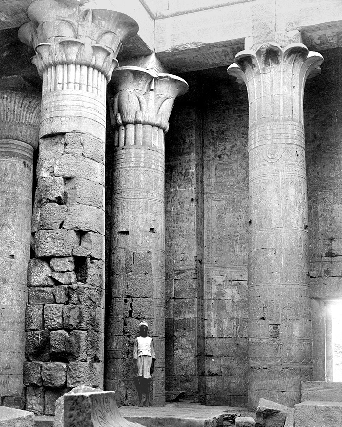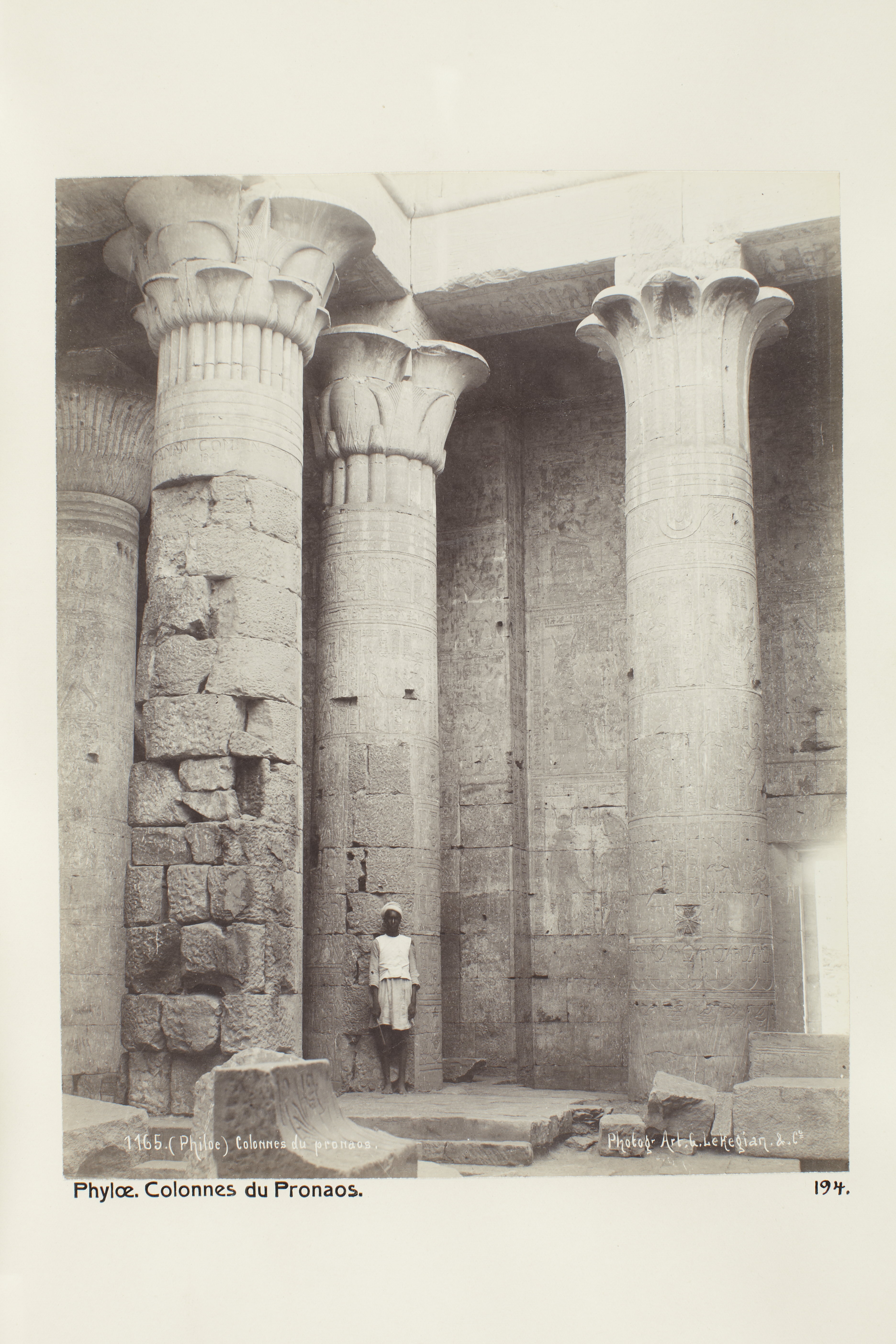 Portalens kolonner i templet på ön File (Philae) utanför Assuan, Egypten. Text på fotografiet: Phylae. Colonnes du pronaos. Fotografierna LXVI:M.01.- 201. kommer från resan till Egypten och Sudan som Wilhelmina och Walther von Hallwyl gjorde vintern 1900-1901. De lämnade Sverige den 5 november 1900 och fortsatte från Egypten till Palestina den 28 mars 1901. Med på resan var döttrarna Ellen med maken Henric de Maré och Irma med maken Wilhelm von Geijer. Wilhelminas sällskapsdam, fröken Ida Uhse reste också med. Under en del av resan anslöt sig ledamoten av Internationella domstolen i Kairo, assessorn Otto Conrad Waldemar Cedercrantz med makan Anna Elisabeth. Vid resan uppför Nilen hade Walther von Hallwyl hyrt ångfartyget Columbia med besättning. Båtresan startade i Kairo 27 december 1900, gick ända till Wadi Halfa varifrån man reste vidare med tåg till Khartum och tillbaka till Wadi Halfa. Båten vände åter i riktning mot Kairo, men det verkar som att sällskapet tog tåg sista biten, från Luxor. Henric och Ellen de Maré samt fru Cedercrantz lämnade båten redan då de passerade Luxor första gången. Resten av sällskapet återvände till Kairo den 1 mars. Fotografierna LXVI:M.01.-120. togs av resenärerna själva, de största av Ellen de Maré, de mellersta av Wilhelmina von Hallwyl och de minsta av Wilhelm von Geijer. Resten köptes av professionella fotografer i Kairo, de flesta från Studio Photogr. Artistique G. Lekegian & Cie. Alla uppgifter kommer från Ida Uhses reseanteckningar. Inköpt hos studio Photogr. Artistique G. Lekegian & Co.
