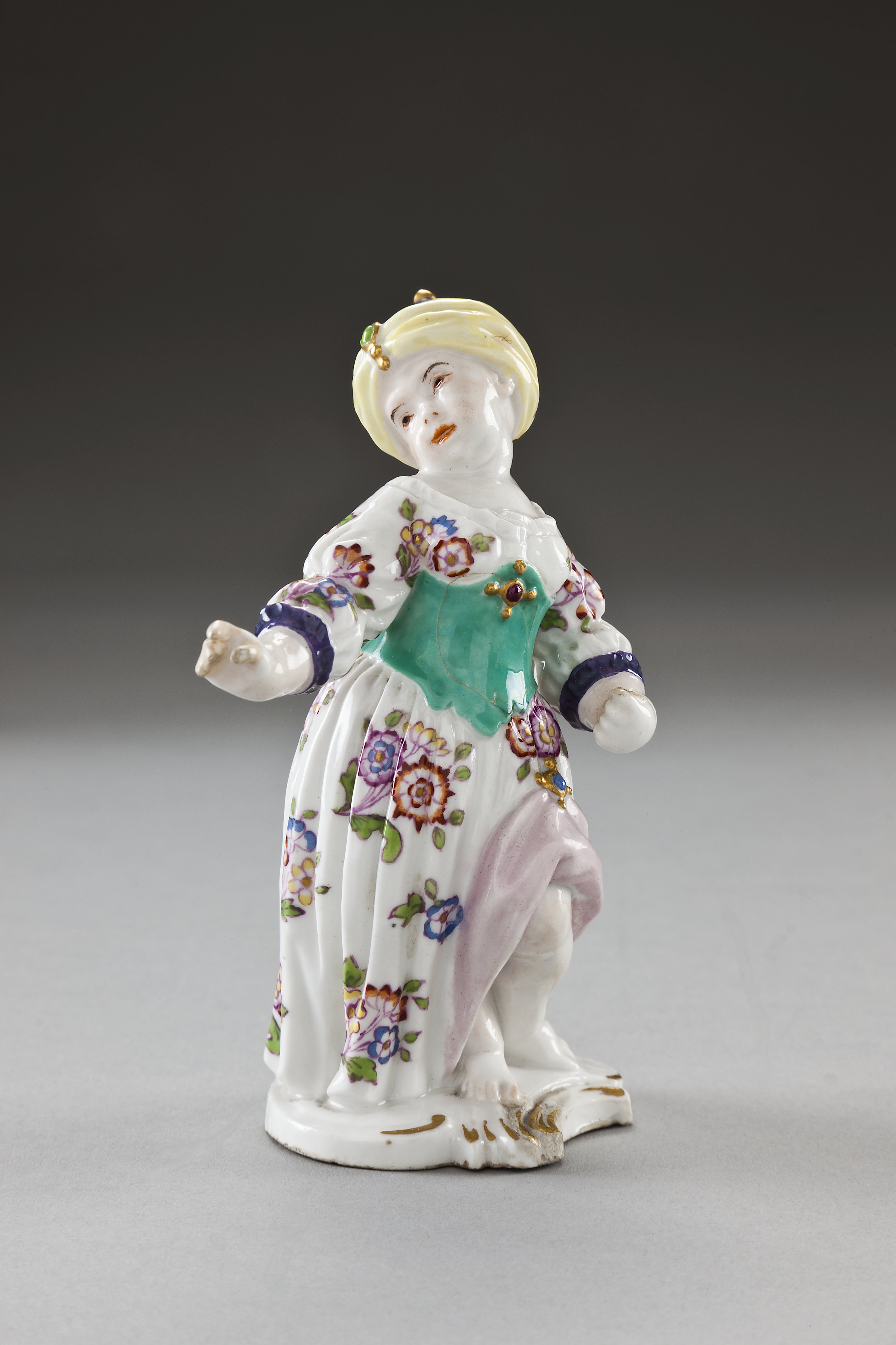 Stående turkisk flicka iklädd guld turbandliknande huvudbonad, och vit mönstrad klänning. På rund fotplatta. Dekor i färger och guld på glasyren. Målningen i Meissens stil, sannolikt ej utförd samtidigt med figuren. Pendang till XII:P.a.a.01