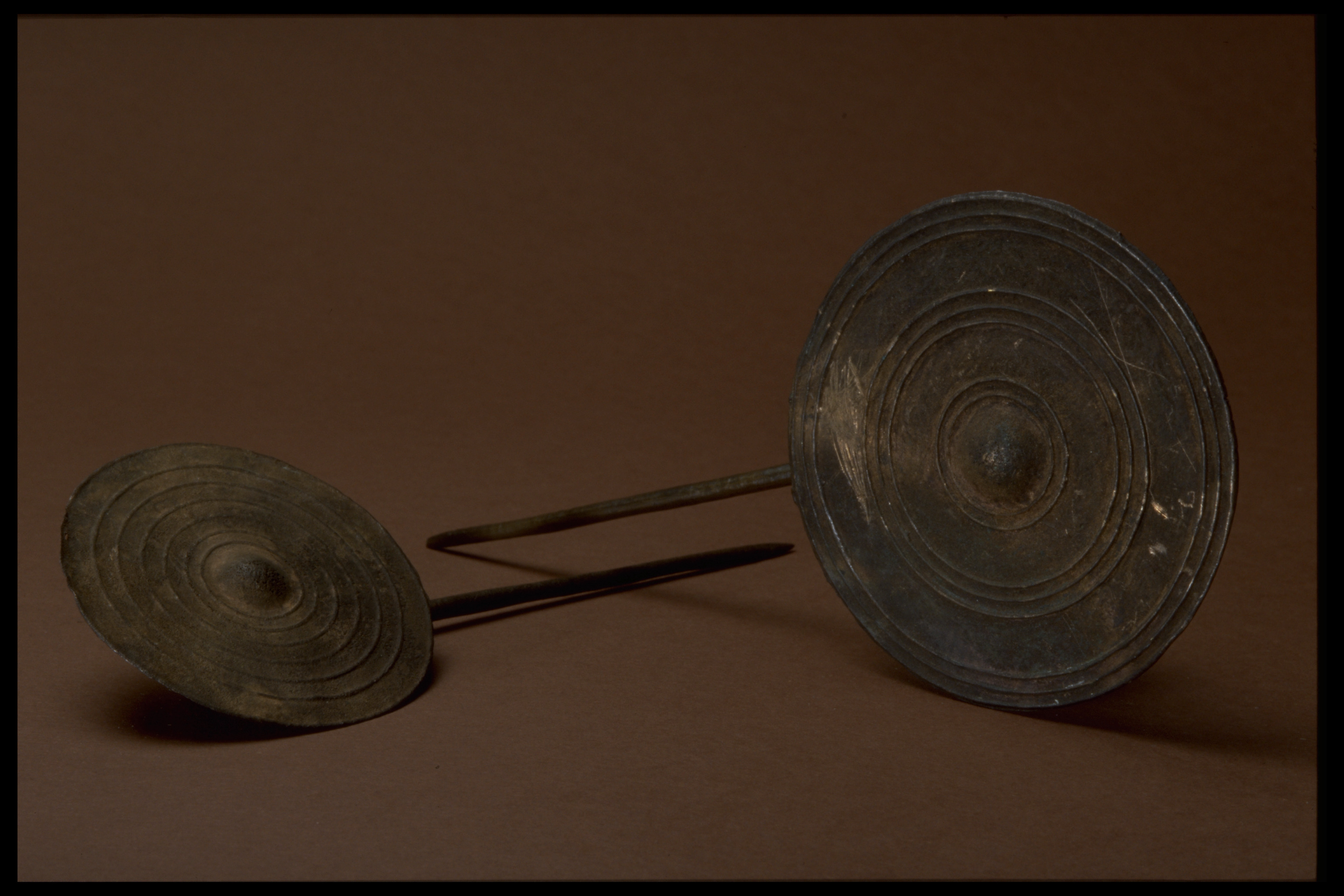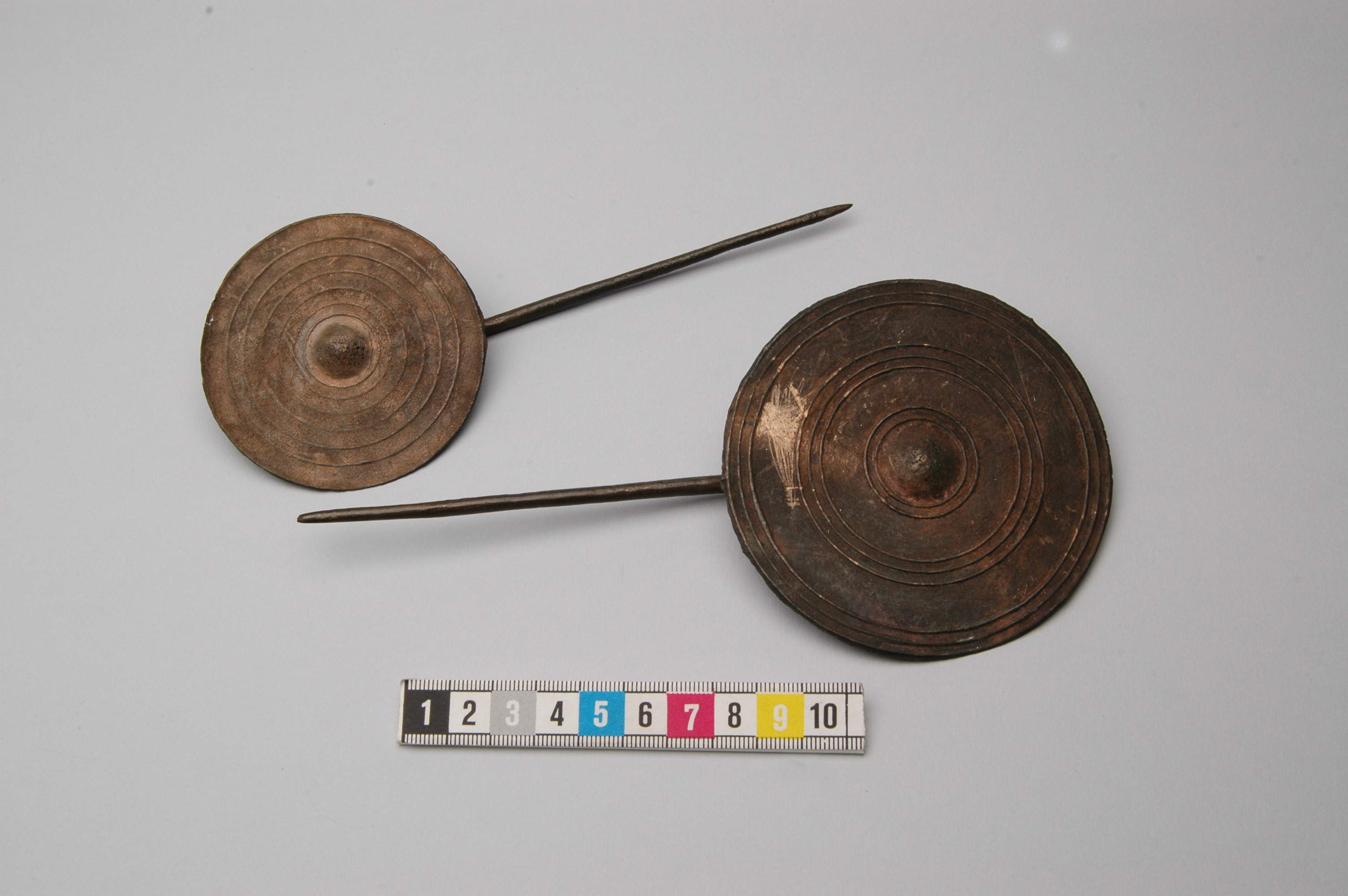 Två skivnålar av brons med stora skivformiga, vertikalt ställda huvuden. Den ena skivan är ornerad om två, tre och tre upphöjda koncentriska ränder omkring en upphöjd mittpunkt. Den andra skivan har sex upphöjda ränder omkring en upphöjd mittpunkt. På baksidan ses smala, upphöjda ränder. bildade i radiellt anbragta rännor, varigenom den smälta metallens utrinnande i den tunna formen underlättades.