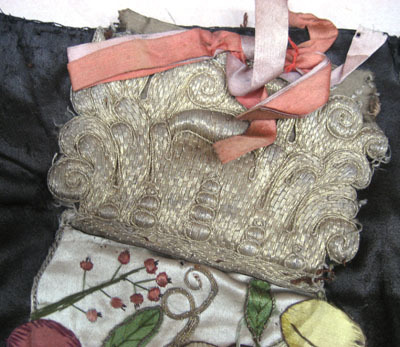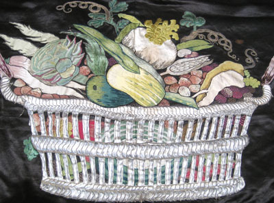Rektangelformad gardin av svart atlassiden sydd i fyra stycken, varav två smalare i ytterkant. Kappan är kantad nedtill med frans av silkesgarn i grönt, blått, rosa, vitt och gult, bredd: 45 mm, och på sidorna, bredd: 25 mm. Dekor i applikationsbroderi i form av en vit gallerskål i mitten, fylld med frukt som päron, squash, rättika, bönor, salladshuvud, melon, jordgubbar mm. Skålen hänger i rosa sidenband samt har målade skuggningar i grått. Nedanför löper en blomsterslinga med blommor som tulpan, akleja, påsklilja mm som slingrar sig runt ett rött sidenband. På sidorna vita spiralformade kolonner med växtslingor med frukt, som päron, äpple, plommon, jordgubbar, körsbär mm. Kolonnerna har ett klassiskt fundament i perspektiv samt ett korintiskt kapitäl i guldtråd. Rosa rosett fäst på kapitälet till höger. Broderiet är av siden, silke, silver- och guldtråd samt är färgstarkt i rött, gult, grönt, vitt, rosa, blått, lila och brunt. Överkanten är förstärkt av ett längsgående, ofärgat linneband. Längs överkanten är 11 små hällor fästa, av ofärgat linne, bredd: 13 mm. Ofodrad. Samhör med nnr 19533-19543.