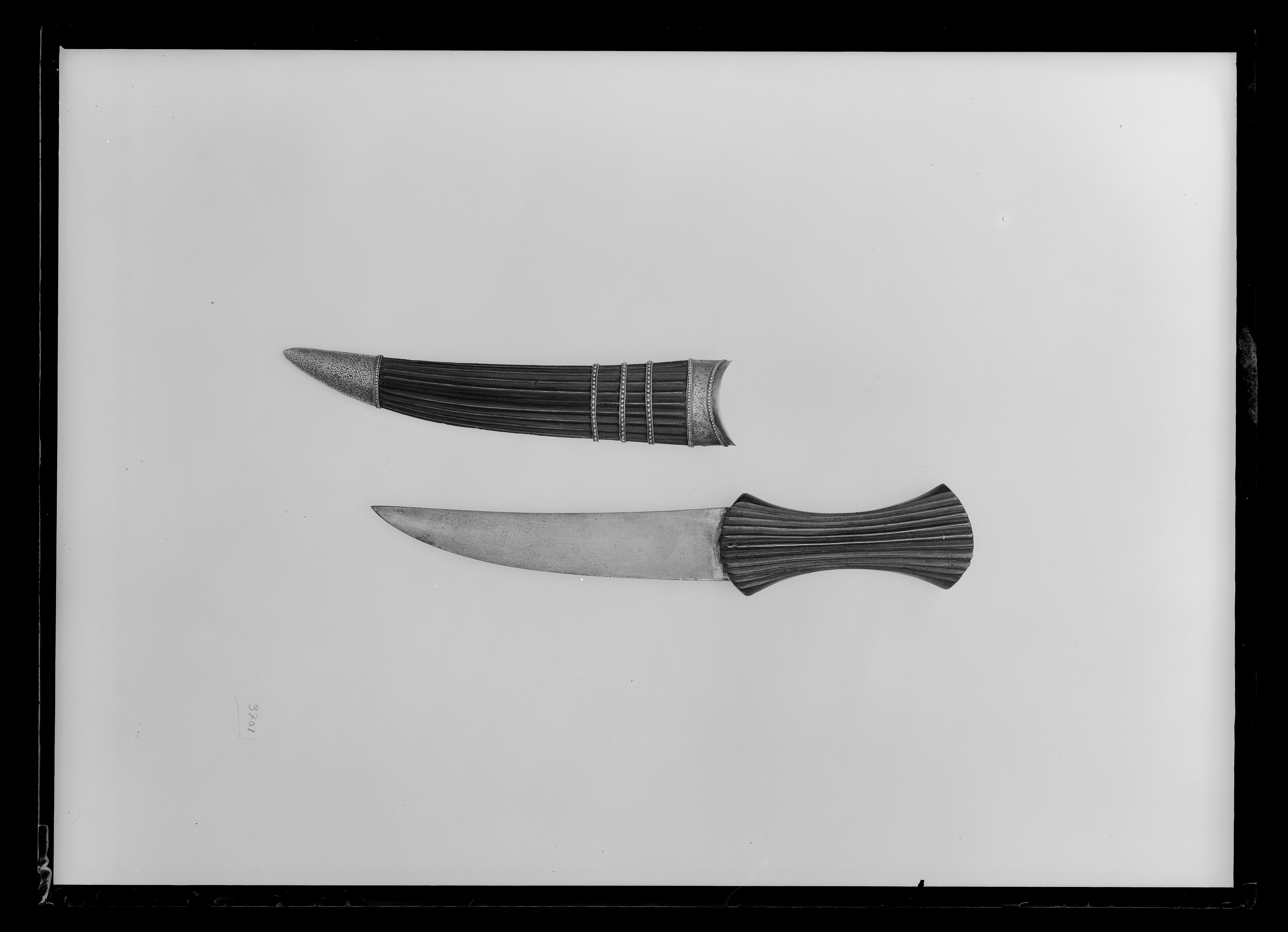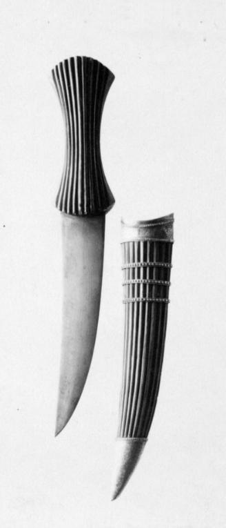 Timglasformat fäste med spetsovalt tvärsnitt av mörkt trä. På utsidan räfflat i längsriktningen och inlagt med smala tvinnade mässingstrådar mellan räfflorna. På baksidan två räfflor längs mitten. Klinga av damaskerat stål 33 mm bred vid fästet, svagt böjd, tvåeggad utan mittås. MN prot 1877-04-23 skänkt till Nationalmuseum och Livrustkammaren av kammarherren m.m. greve Axel Bielke (1800-1877) enligt testamente 1876-02-04. Från Bielkes Stockholmsvåning, nr 18 i förteckningen. (nr 53 i förteckningen över vapnen från Tureholm).