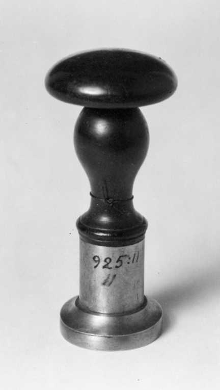 Platta av stål, däri graverat alliansvapen, kartusch krönt med kunglig krona, på kartuschen tre ovala sköldar, två och en, skrafferade färgangivelser, till höger tre kronor, till vänster Preussens örn (ingen färg angiven), nertill kvadrerad sköld av Oldenburg och Delmenhorst, sköldhållare tillbakaseende lejon samt vildman. Kartuschen omgiven av lagergirlang och står på mur, som i sin tur står på mark, nertill avsnitt, slät kantring. Randen något rundad, ovansidan svagt skålad, cylindrisk skaftholk, d: 21 mm. Skaft av ebenholts, svarvat med balusterformig nedre del och svampformig skiva, d: 38,6 mm, välvd översida, skålad undersida.