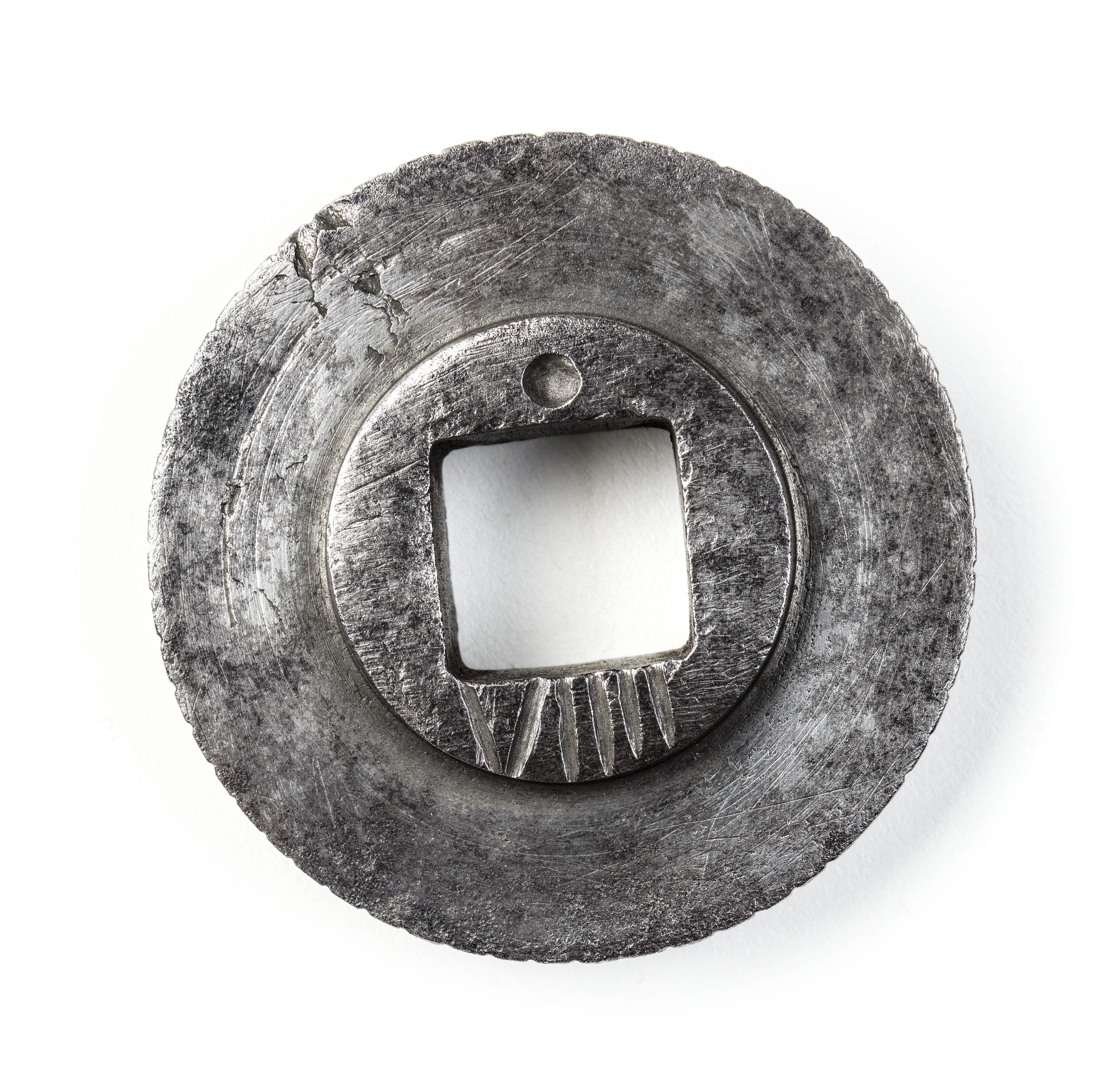 Vals till blyvinda. Längs omkretsen tvärstreck och X. I centrum fyrsidigt hål i en rund förtjockning. Hålet är märkt på ena sidan med en punkt och VIII.
