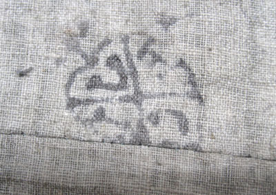 Täcke av blå sidentaft, sytt i tre stycken. Foder i beige linnelärft, i två stycken på tvären. Fodret dessutom skarvat. Svart tryck i kanten vid fodrets mittsöm, i form av ett fyrstyckat, hjärtformat blad med en bokstav i respektive ruta: "V" och troligen "F" samt två oläsliga. Eventuellt en textil fabrikörsstämpel.