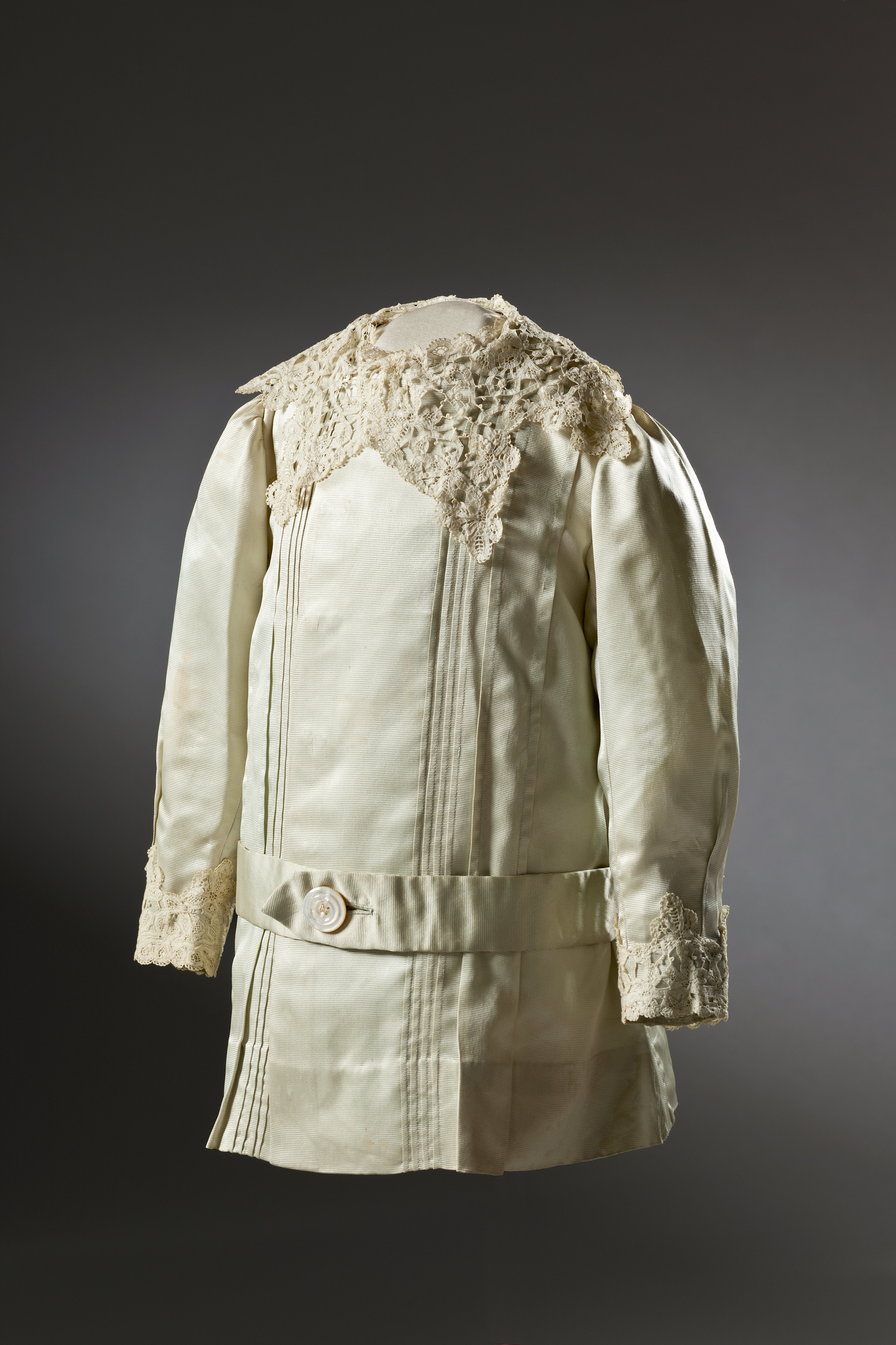 Barnblus av ljusblå sidenrips med rak tillskärning, lång ärm, krage och dold knäppning mitt fram med fem, vita pärlemorknappar, diam. 10 mm, samt en mindre knapp under kragen som knäpps med en sydd träns. Krage, 135 mm bred av gulvit, knypplad spets med spetsiga stora uddar. På båda sidor om knäppningen fyra smala stråveck samt därutanför ett nedsytt motveck, öppet 150 mm från nederkanten. Lika i ryggen. Hellånga isydda ärmar, rynkade på axeln. Påsydd manschett av gulvit spets, 70 mm bred med uddad kant. I sidsömmarna hällor för skärp. 65 mm bred fåll. Klänningen ofodrad. Tillstånd: Tyget fläckigt fram och på höger ärm.
