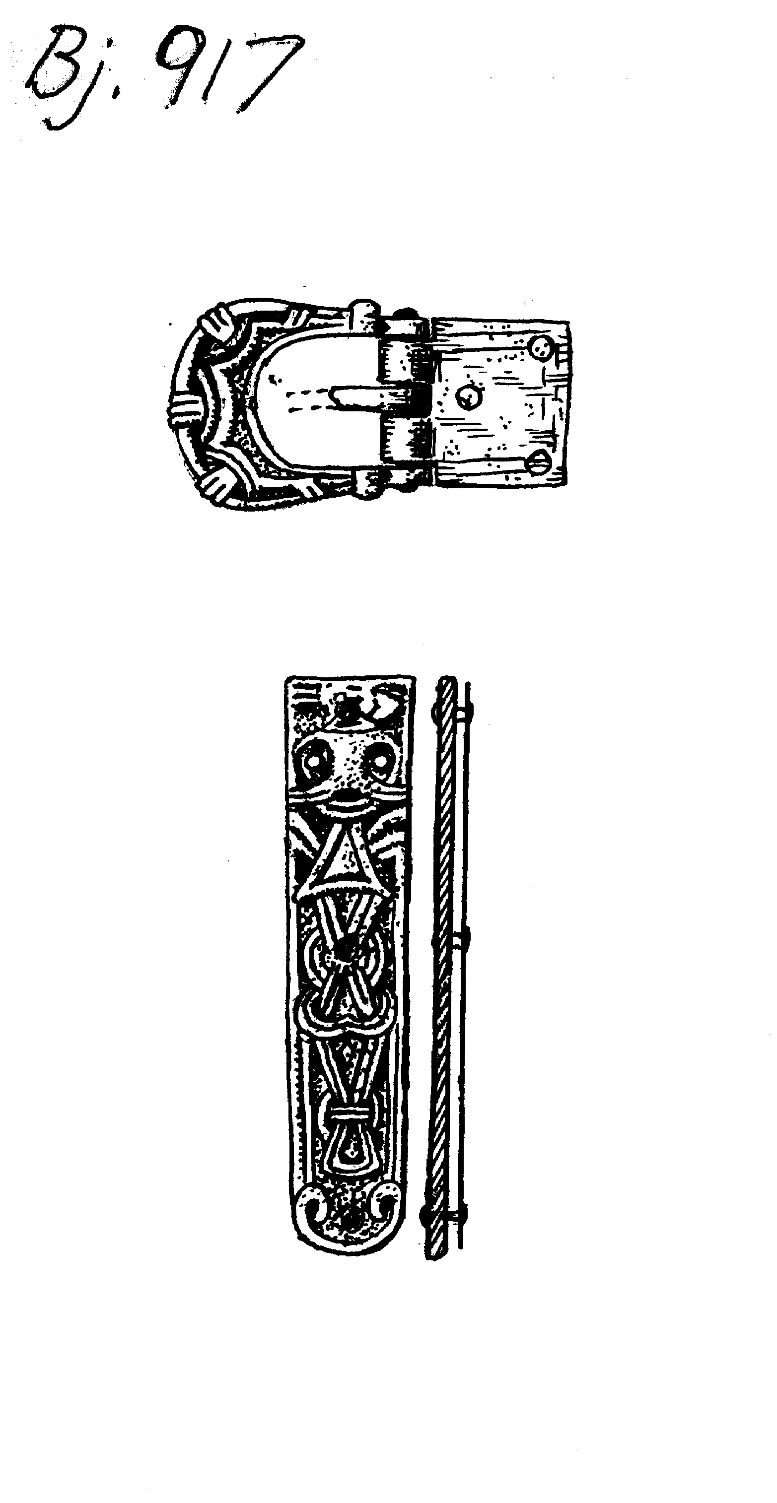Liten bältesölja och remändebeslag av brons i borrestil.