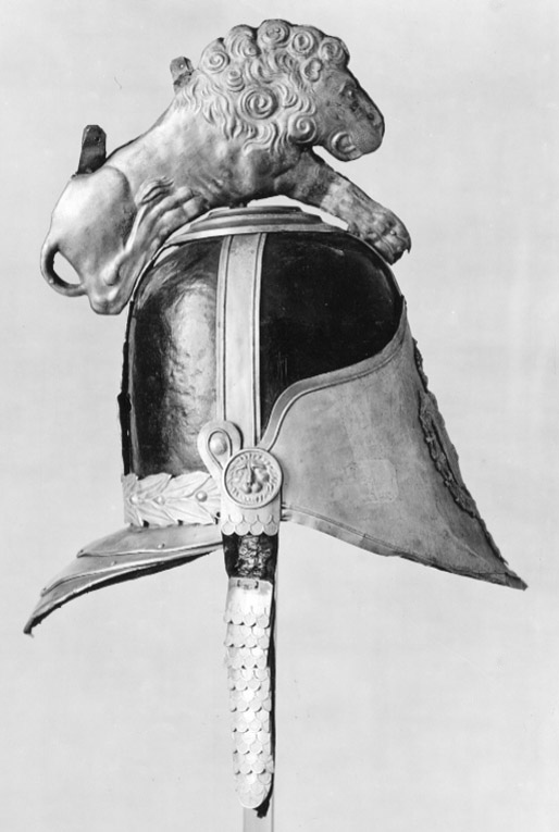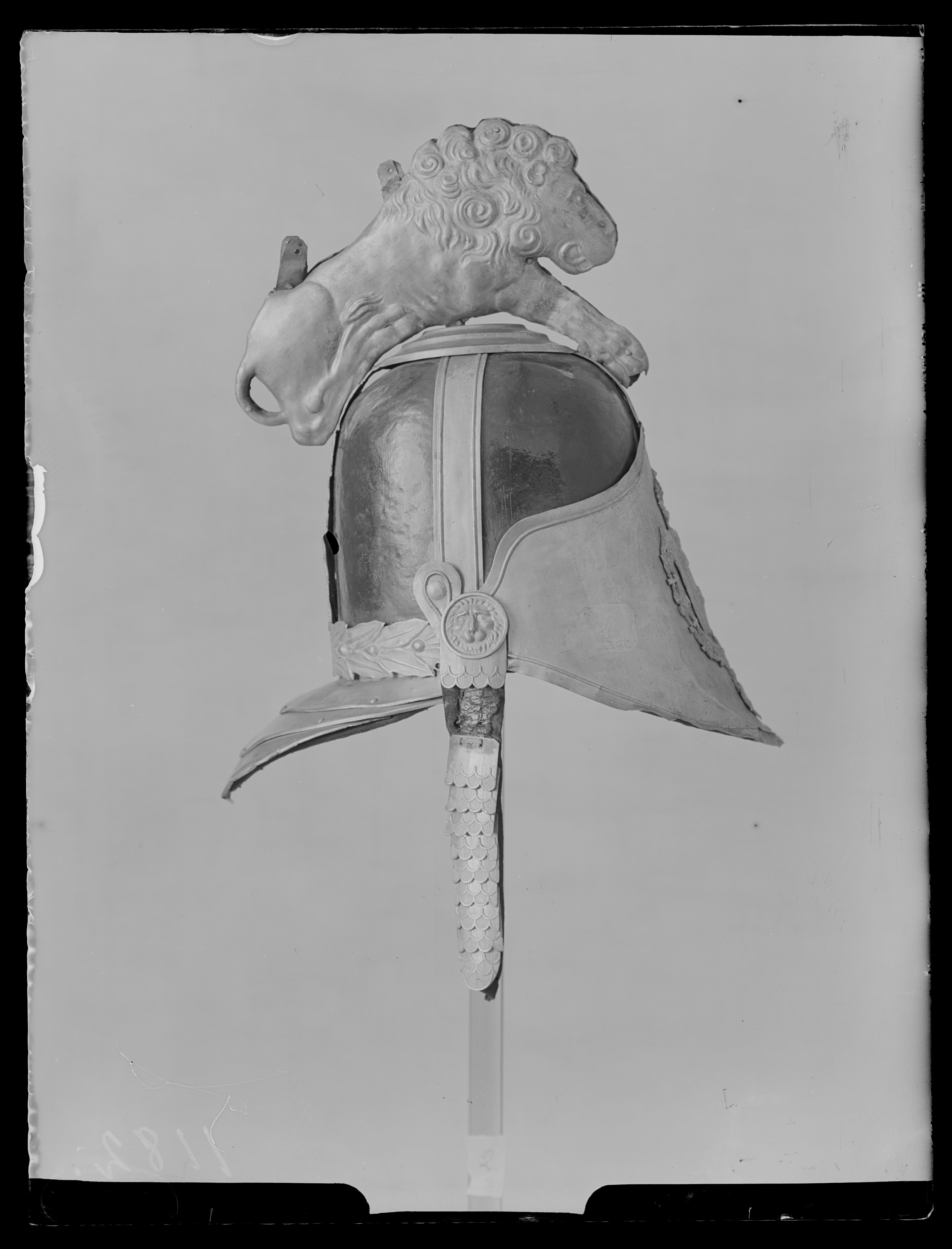 Kask för Livdrabantkåren. Kask av svartlackerat läder med beslag av förgylld mässing. På framplåten finns fäst Riksvapnet med en krönt sköld med tre kronor inom serafimerordens kedja med ordenskors. Baktill på kasken finns en tredelad nackplåt. Fyra byglar går från kaskens nederkant till dess topp där de hålls samman av en rundel i tre avdelningar (ca. 11,5 cm i diameter), varpå lejonet vilar. Bygeln baktill (ca. 3,4 cm bred), liksom ett band längs kaskens nederkant baktill, har inpressad dekor i form av parvis ställda lagerblad och bär. Övriga tre byglar är släta med en upphöjd rand i var sida. Hakrem med fjällformade beslag, bredast upptill (ca. 3,6 cm) och avsmalnande nedåt (ca. 2,7 cm). Remmen har foder av brun sammet. Ett runt beslag dekorerat med ett lejonhuvud (ca. 3,2 cm i diameter), finns där hakremmen är fastsatt. På vänster sida saknas hakremmen liksom det runda beslaget som brukar finnas där remmen är fäst. Foder/innerhuva av brunt tunt läder. Huvan är öppen på hjässan, avslutad med flikar, i var flik finns ett hål där ett band kan trädas igenom, med bandet regleras vidden/storleken. Skärm och bakstycke har foder av blått siden. Längs kaskens nederkant är sytt ett svart band. Jämför med Armemuseum inv.nr 13154 och 70521; beslag av förgylld mässing, likadana som Lrk inv.nr 22205-08, 22351-68 och 28493.