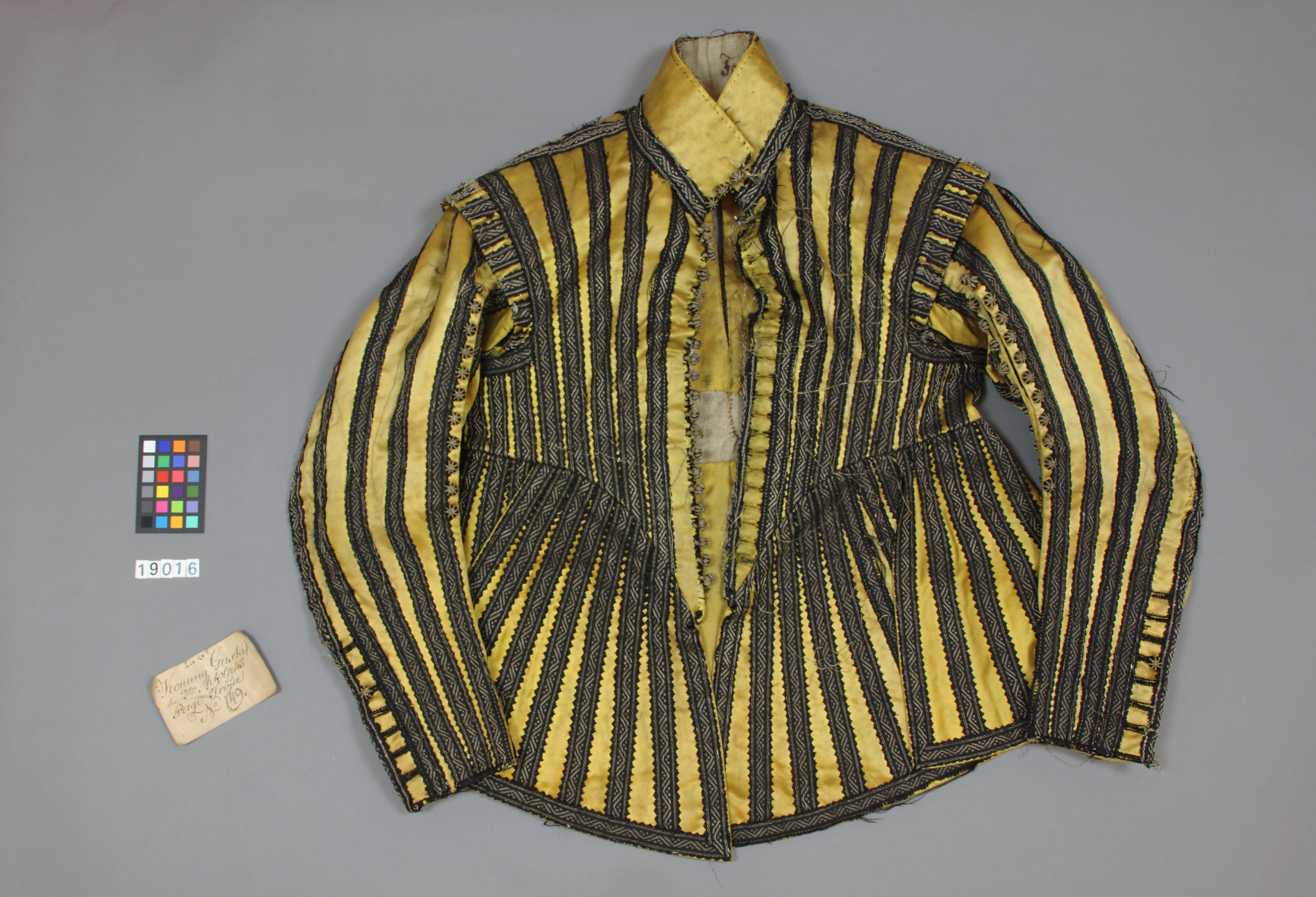 Tröja av gul sidenatlas dekorerad med vertikala svarta, guldinvävda band. Tröjan avskuren i midjan, med sex långa skört. Hög ståkrage. Foder av linnelärft och gul taft. Längd mitt fram 540 mm, därav liv 350 mm, skört 190 mm. längd mitt bak 570 mm, därav liv 310 mm, skört 260 mm. Bredd fram 300 mm och ryggbredd 365 mm. Ärmlängd, yttersida 570 mm. Ärmvidd nedtill 200 mm. Axelsöm 140 mm, axelkarm 30 mm. Kragens höjd mitt fram 80 mm och mitt bak 55 mm. Tröjan tätt dekorerad med 22 mm breda vertikalt påsydda svarta, guldinvävda band med uddkant. Tröjan knäpps mitt fram med 21 snörmakeriknappar av svart silke och guldtråd på trästomme, samt 21 knapphål. Knapparnas diam. 12 mm. Framstyckena går ner i en djup spets mitt fram. De har en triangelformad kraftig styvnad, 230 mm lång, i fram- och nederkant. Två hål, sydda med svart silke i varje framkant vid midjan. Ryggstycket har en söm mitt bak, en 250 mm lång slits i sömmen med tio knappar i vardera sidan. Ärmarna har ett 165 mm långt sprund med sju knapphål och sju knappar. På ärmarnas insidor en 315 mm lång slits med elva knappar på värdera sidan och en i slitsens överkant. Axelkarmarna har tvärställda band. Tröjans liv, krage och ärmar fodrade med linnelärft, skörten med gul taft. Ärmarna har nedtill en 120 mm bred infodring av gul taft. Ärmslitsen en 70 mm bred infodring och tröjans framkanter och ryggslits en 50 mm bred infodring, samtliga av gul taft. På framstyckenas insidor 40 mm från kanterna och midjan två st 40 mm långa öglor av siden. I midjesömmen mitt bak en 45 mm lång stropp av älghud med ett 20 mm långt knapphål. Kragens styvnad består av fyra lager svart kanfas samt smala ben.