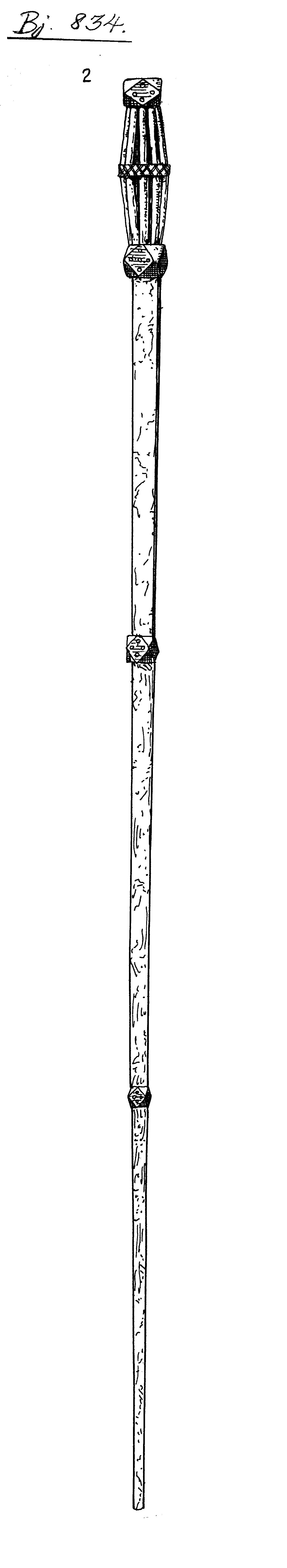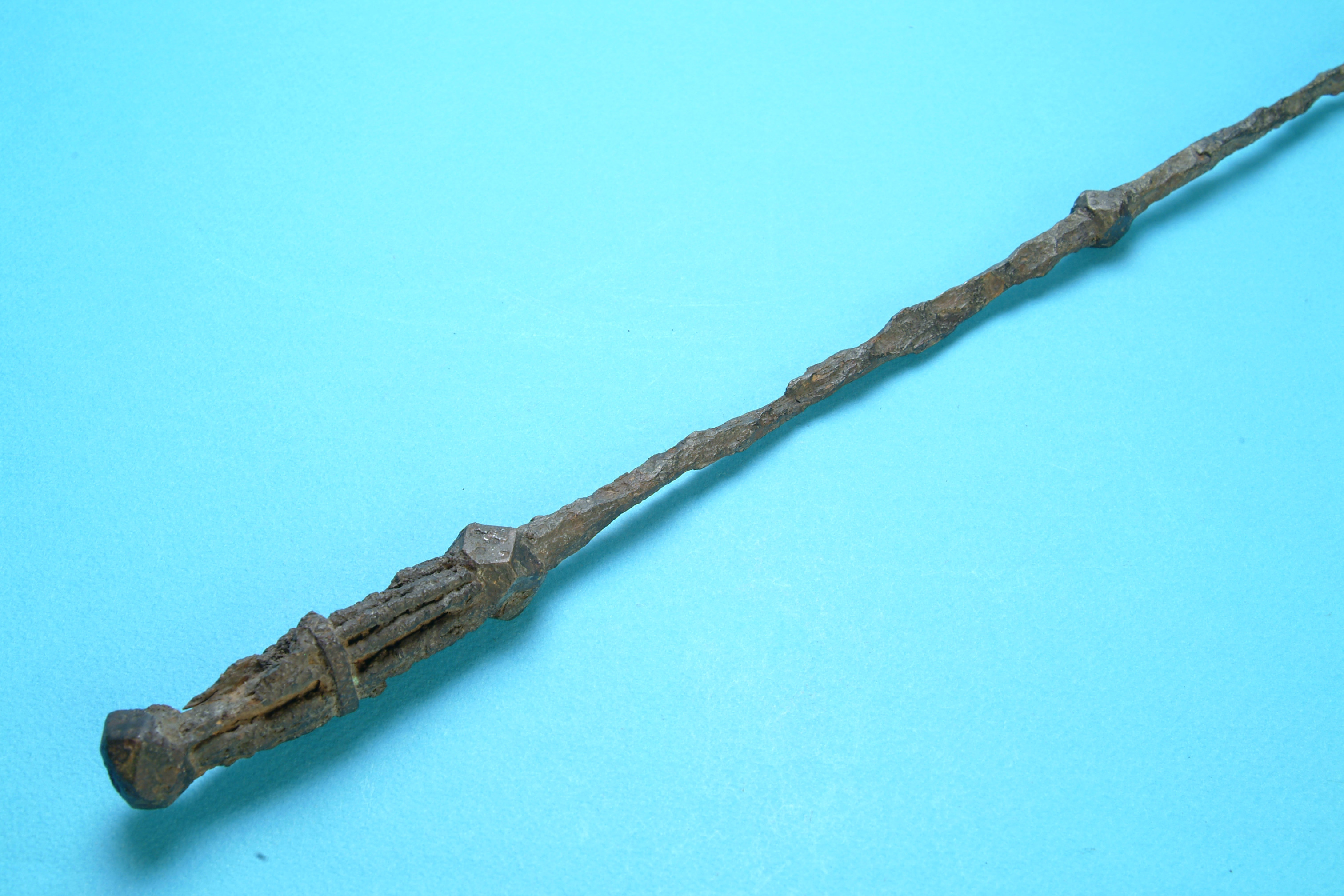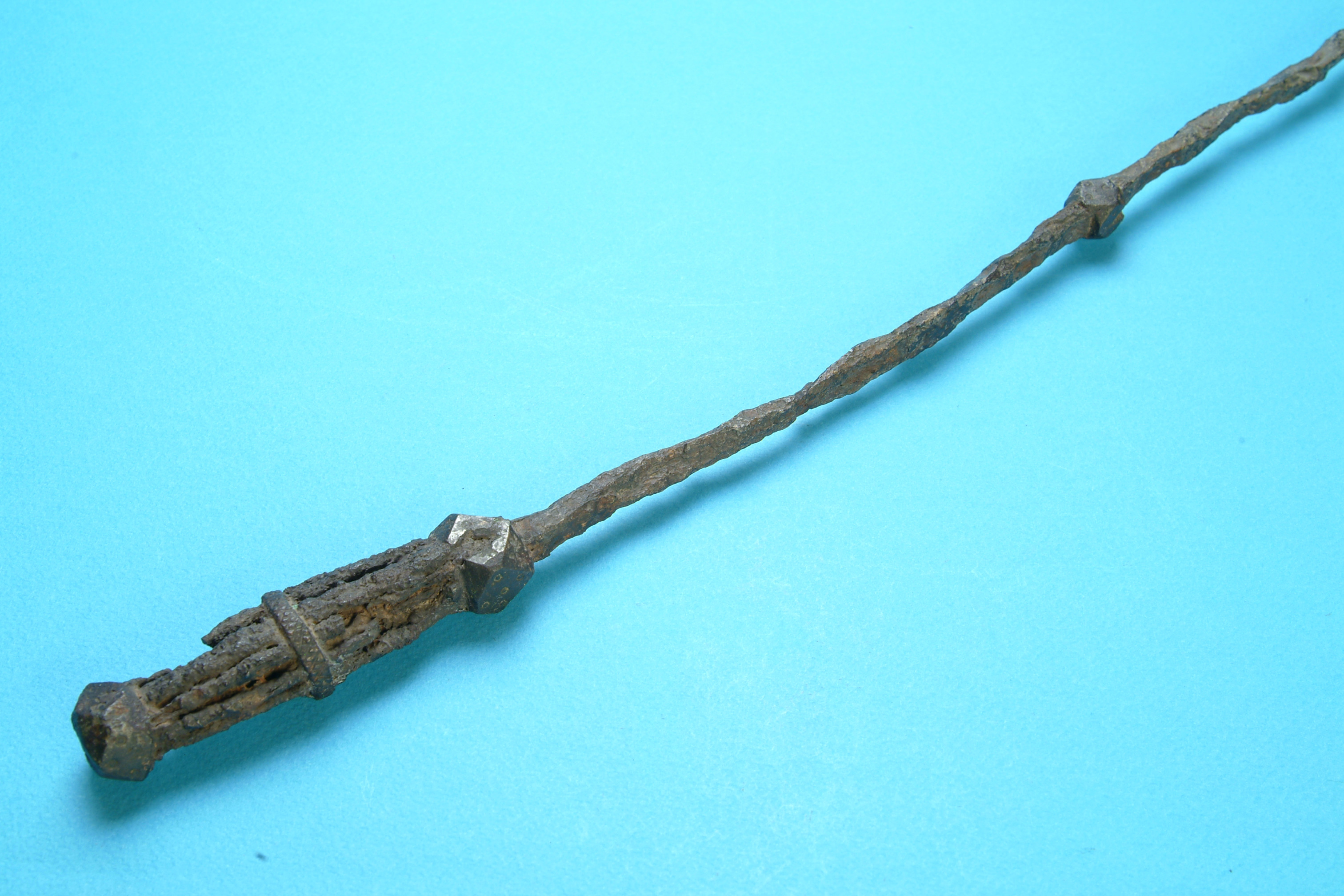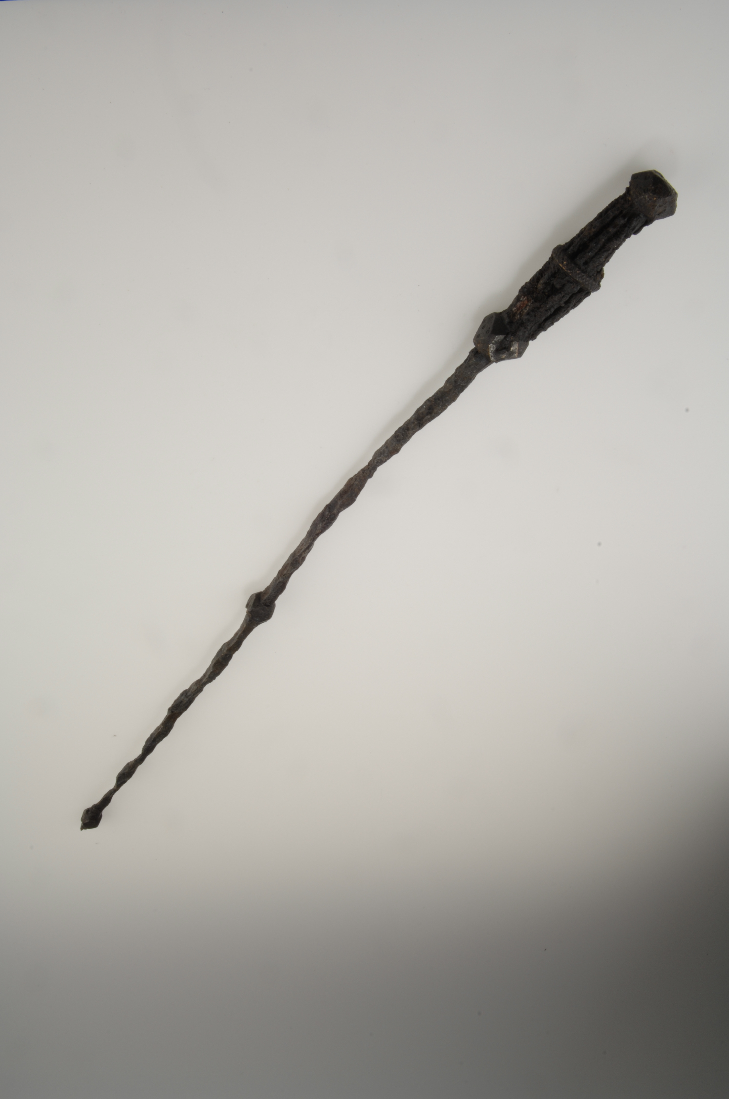 Mått- eller völvestav av järn med överfångsgjutna polyeder och korghandtag. Spetsen lös.