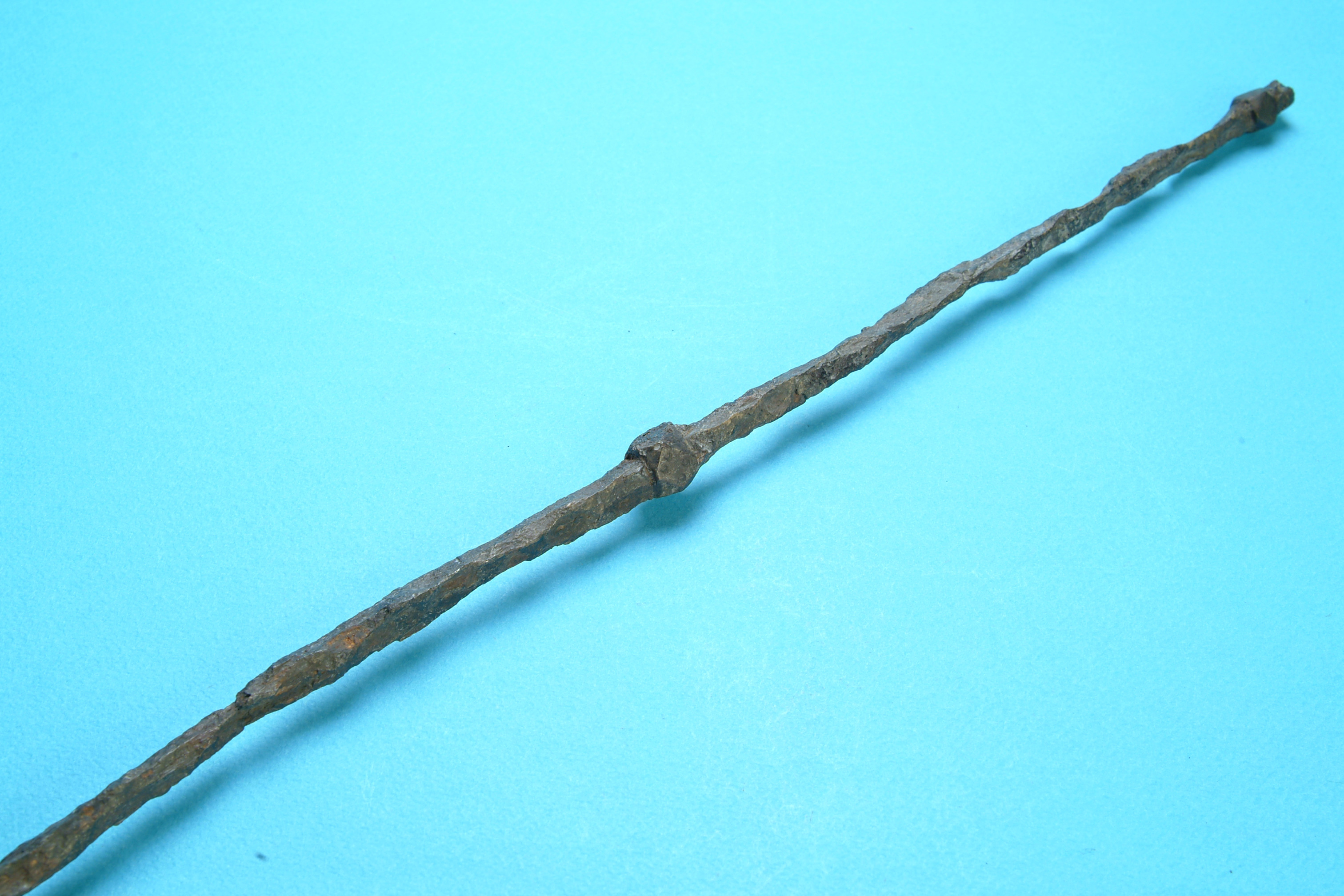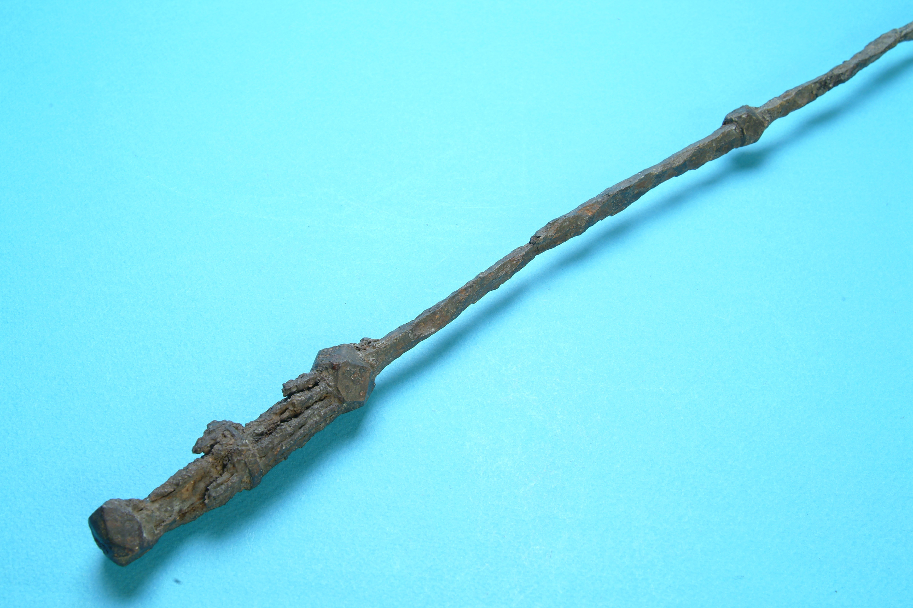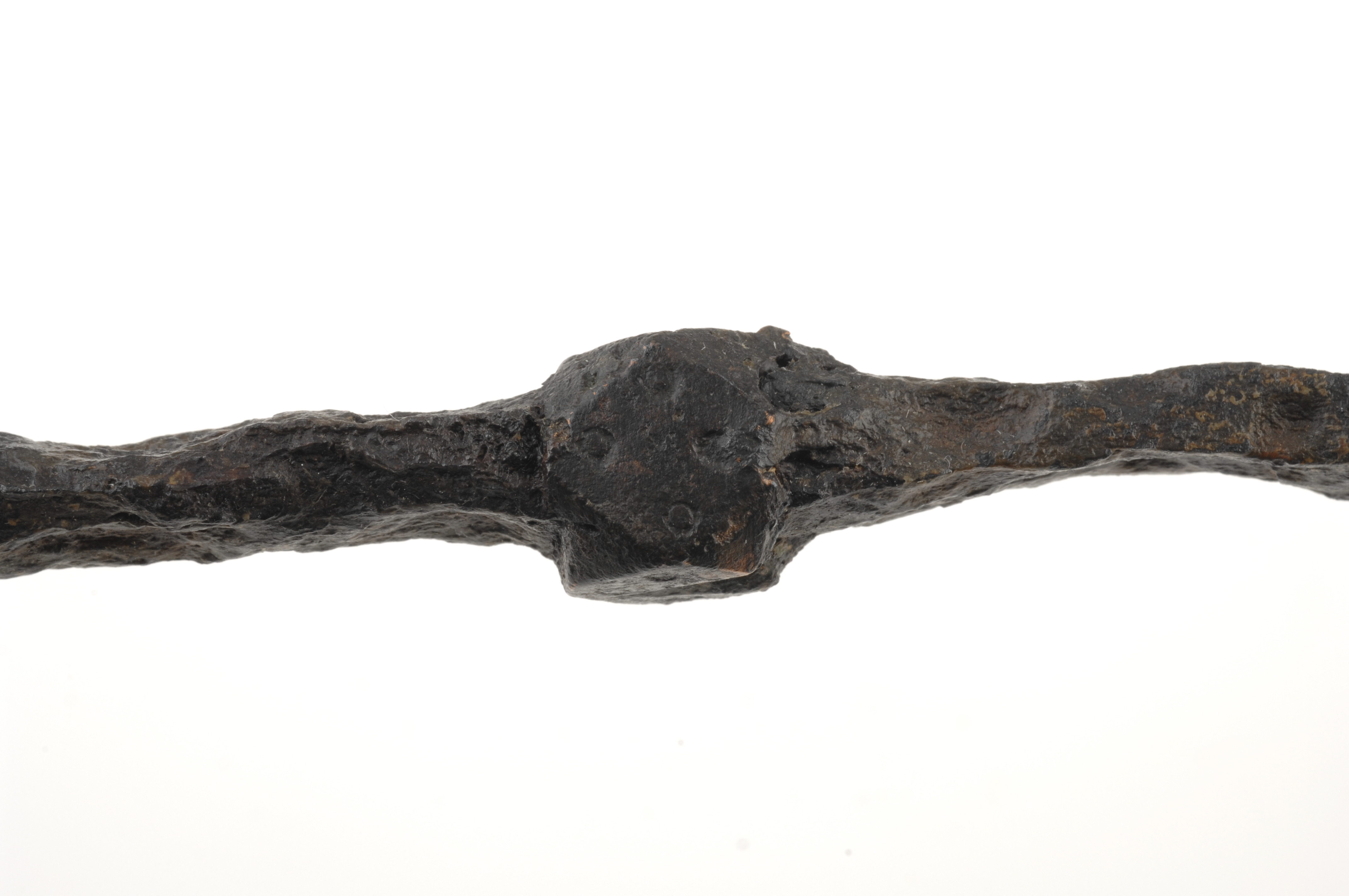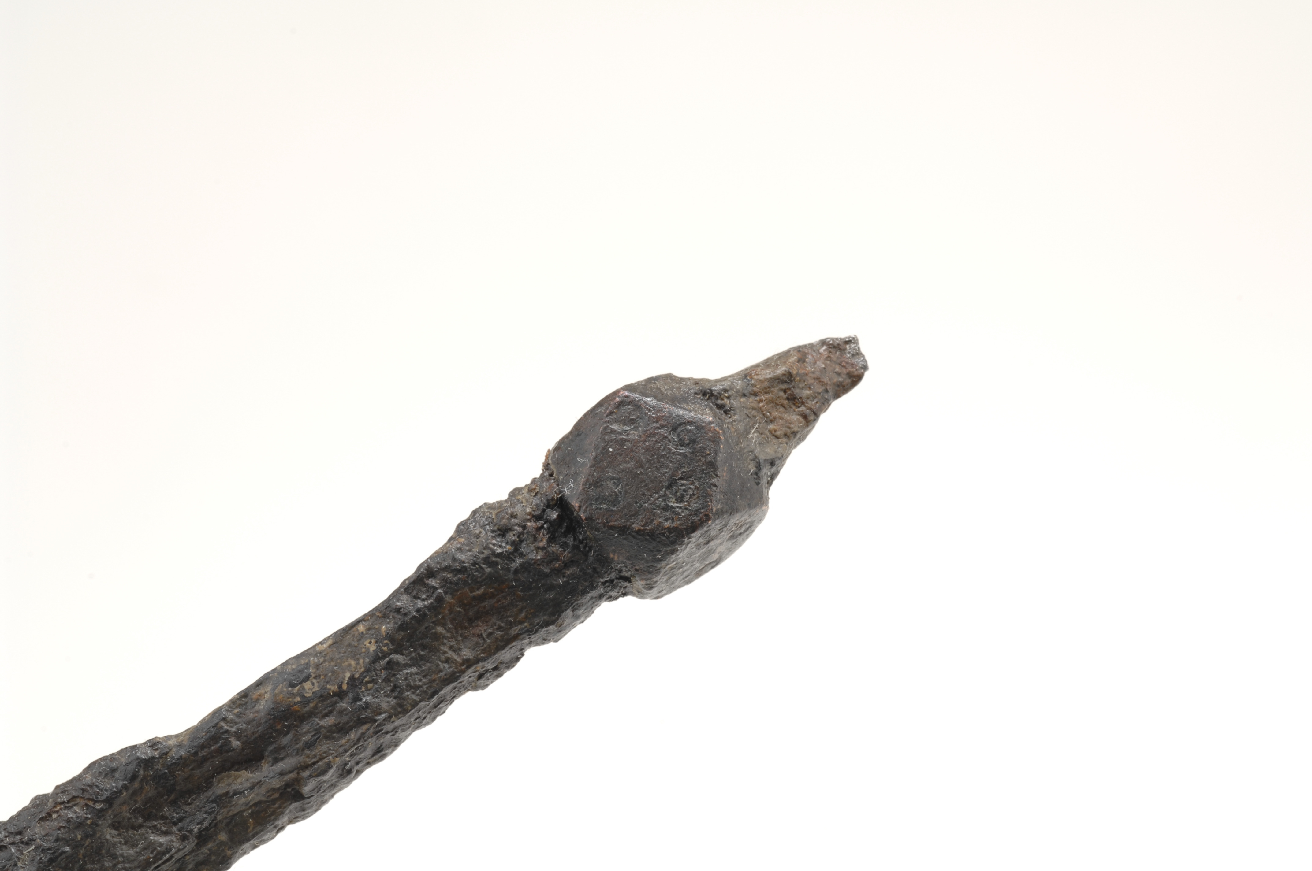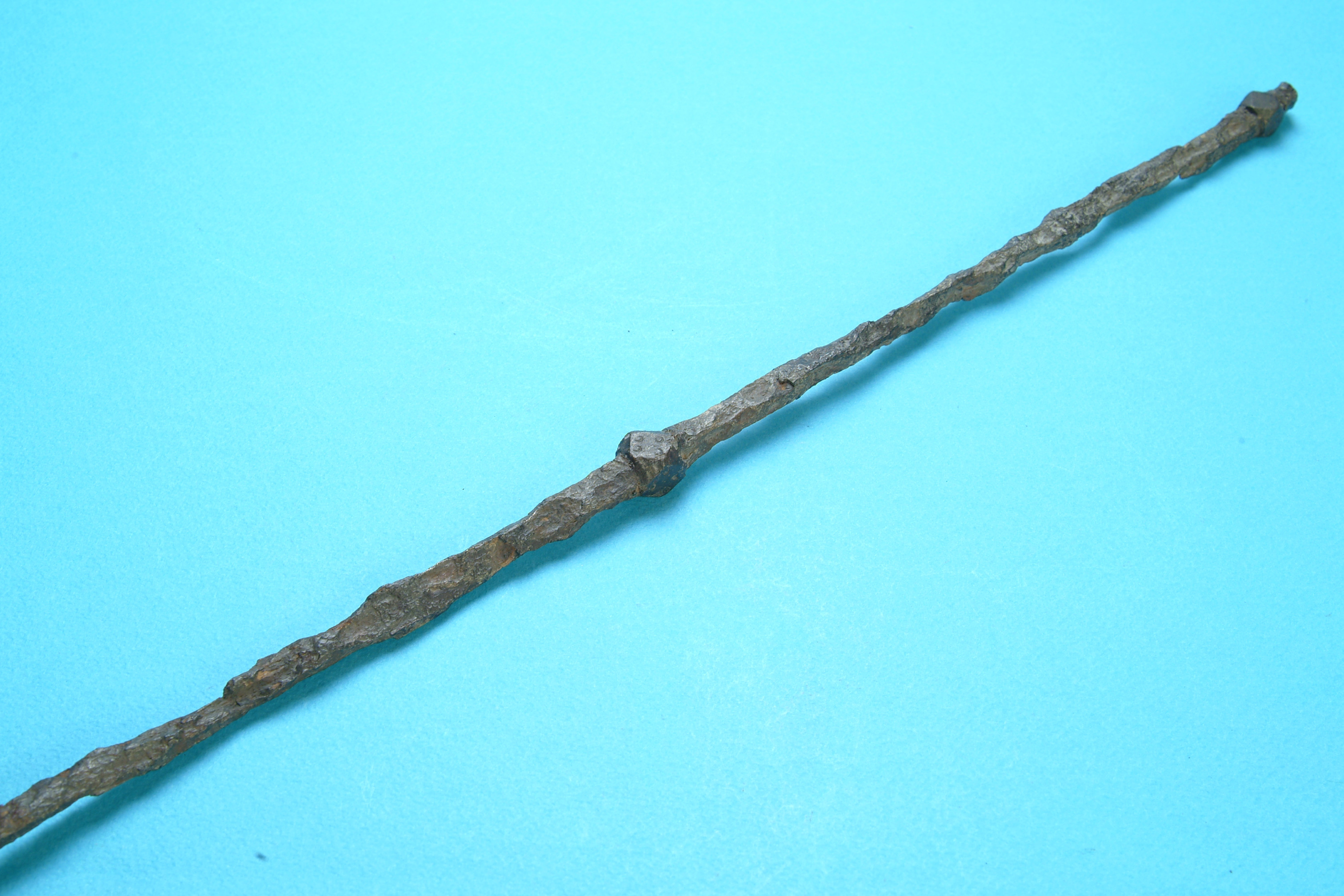 Mått- eller völvestav av järn med överfångsgjutna polyeder och korghandtag. Spetsen lös.
