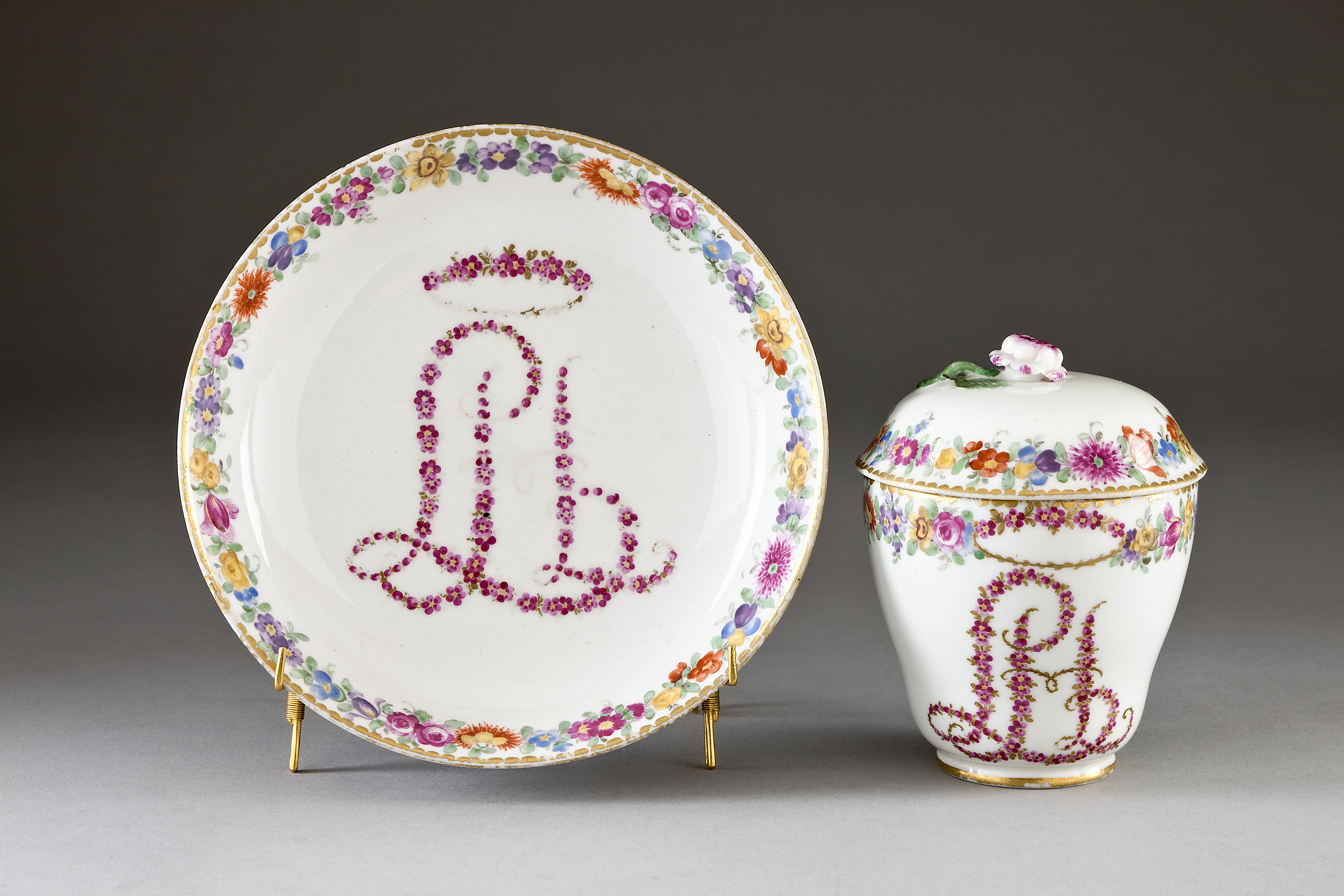 Kopp med lock och fat med dekor av blomsterbårder samt monogrammet LH, sammansatt av små blommor i rött och något guld i färger över glasyren