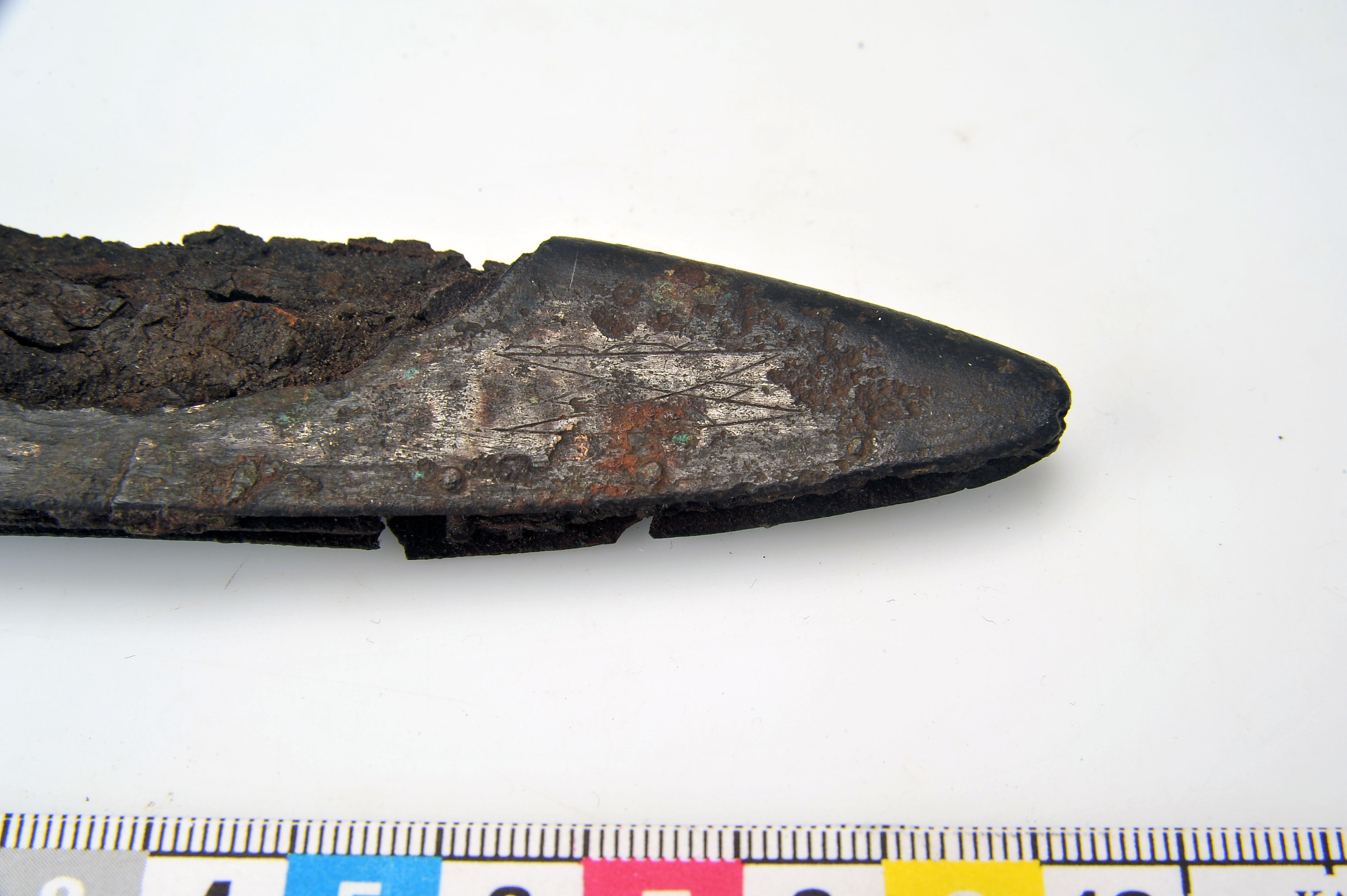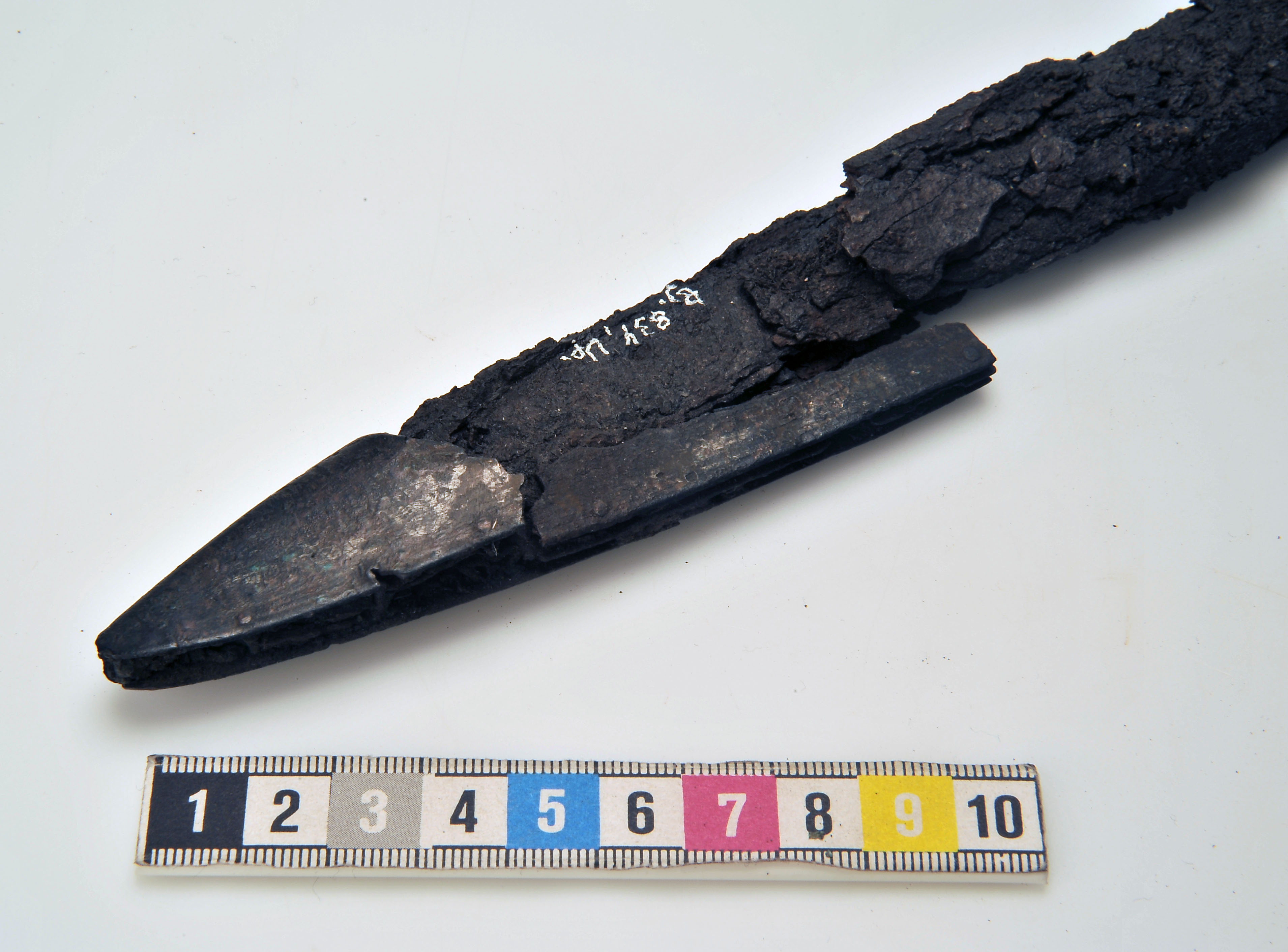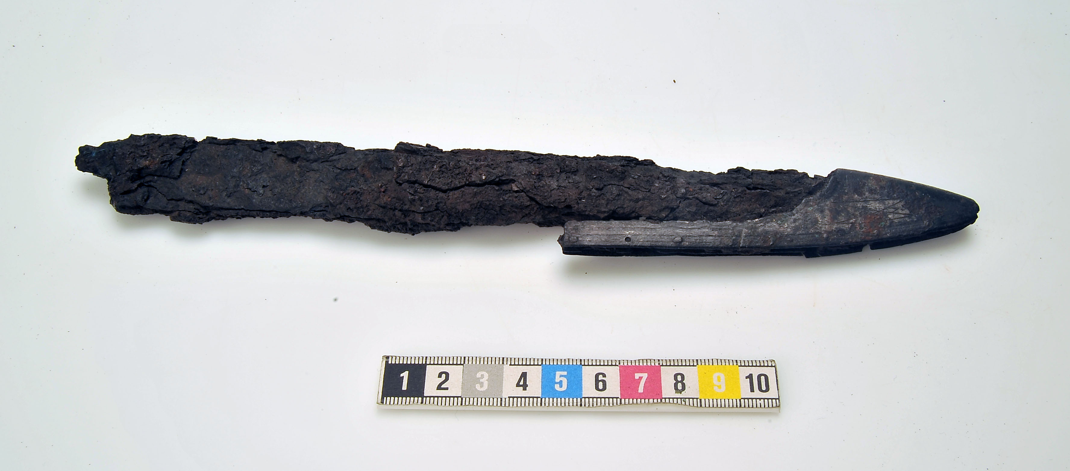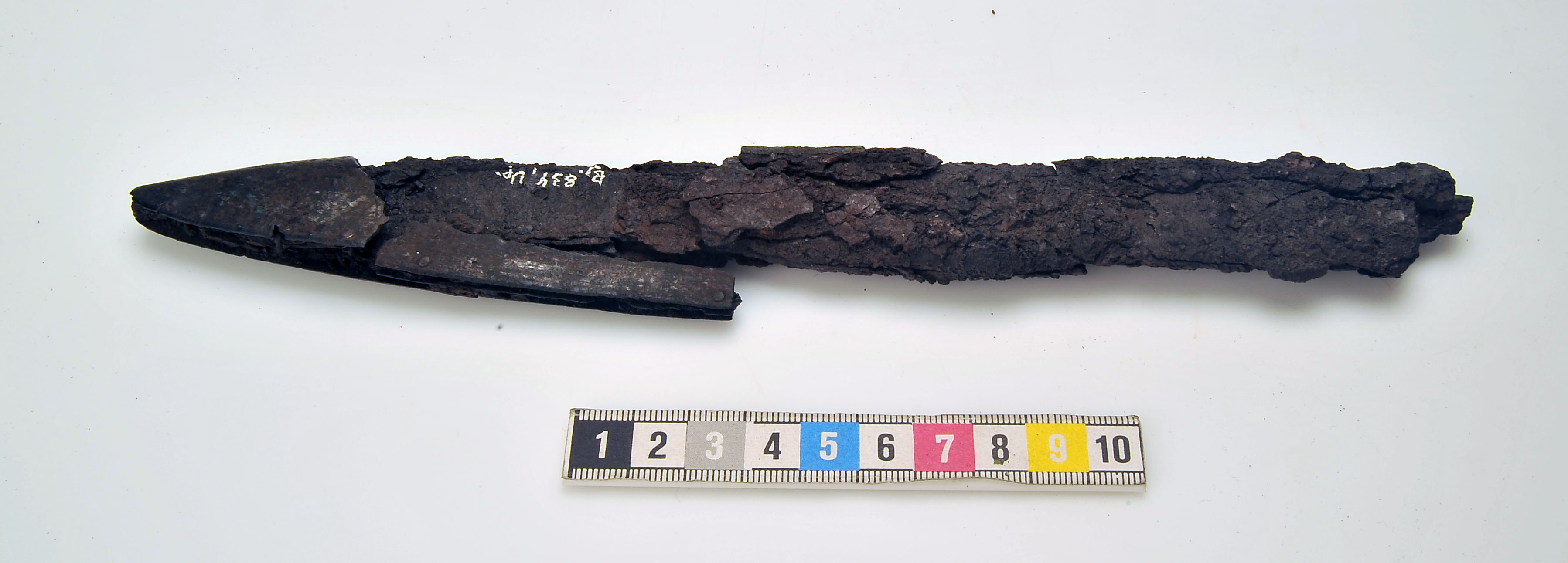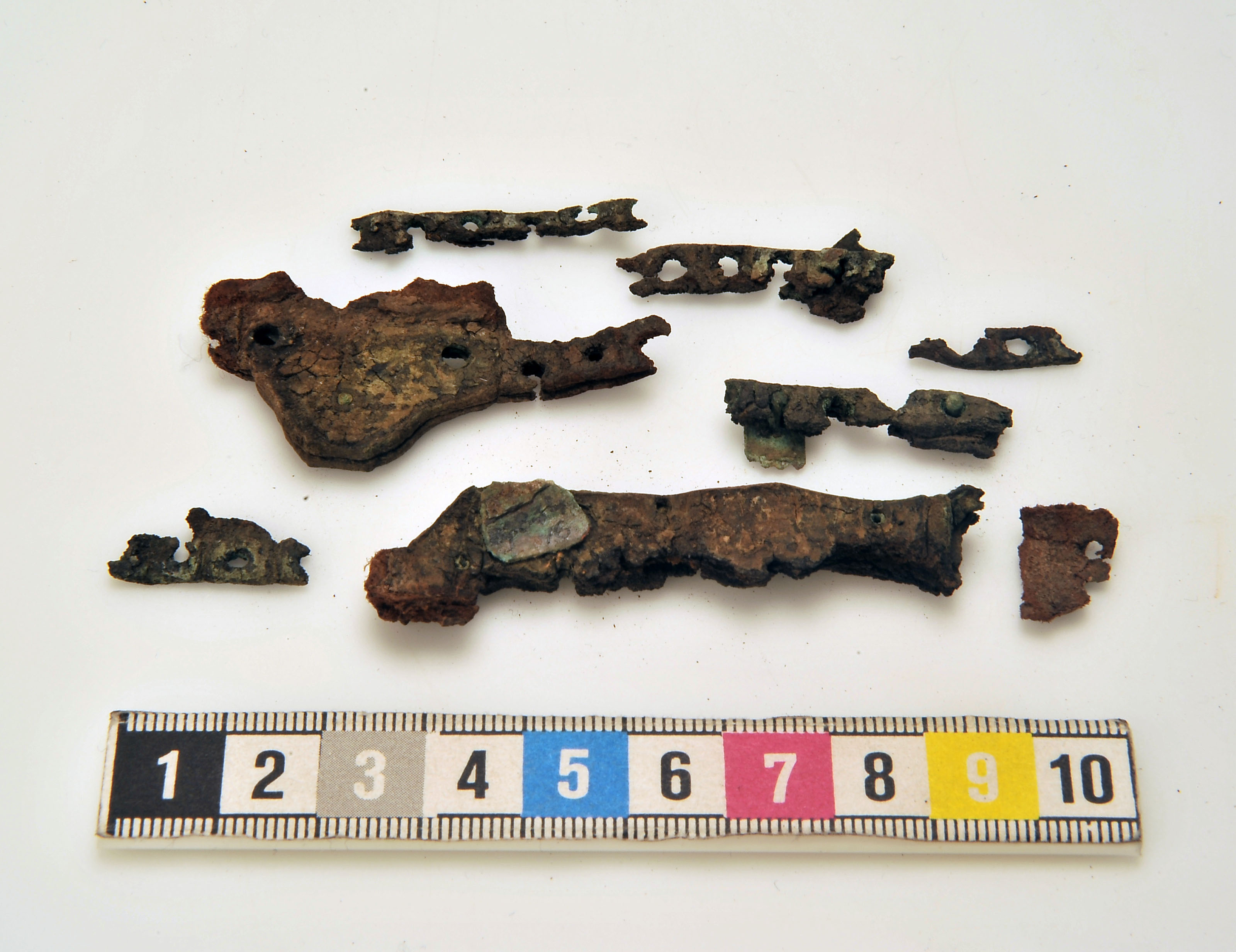 Ett 30-tal fragment av 1 vapenknivslida med läder bevarat i korrosionen.