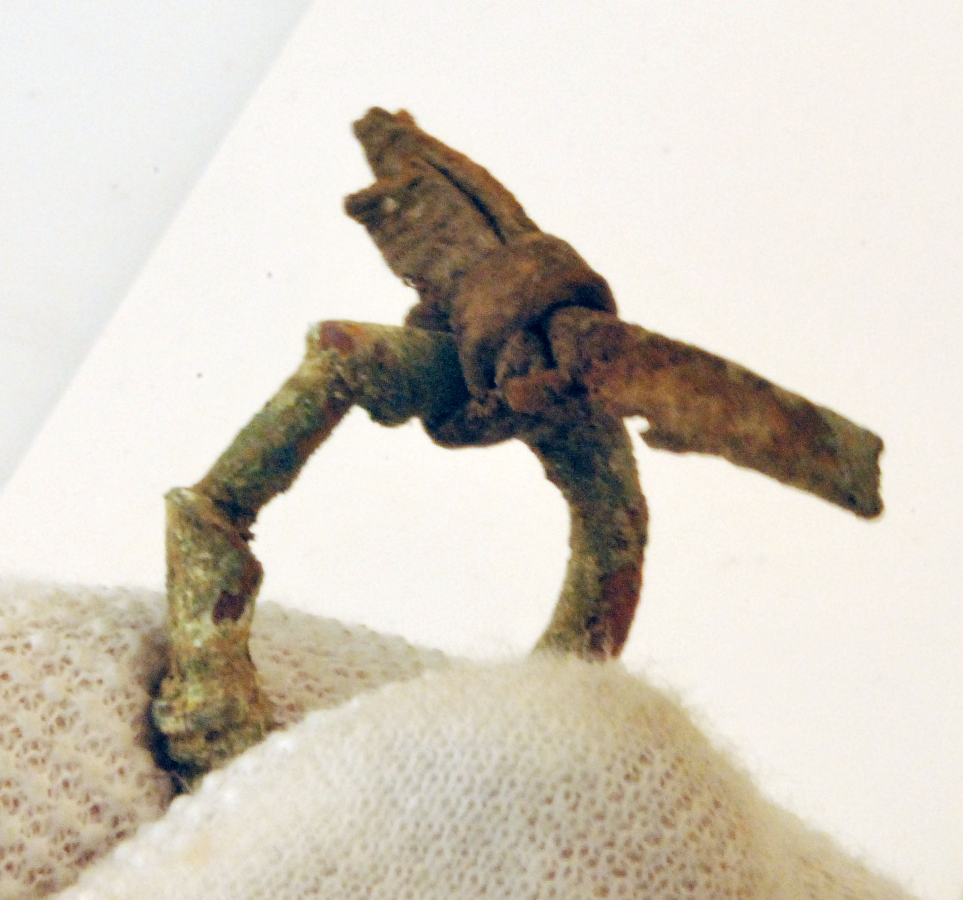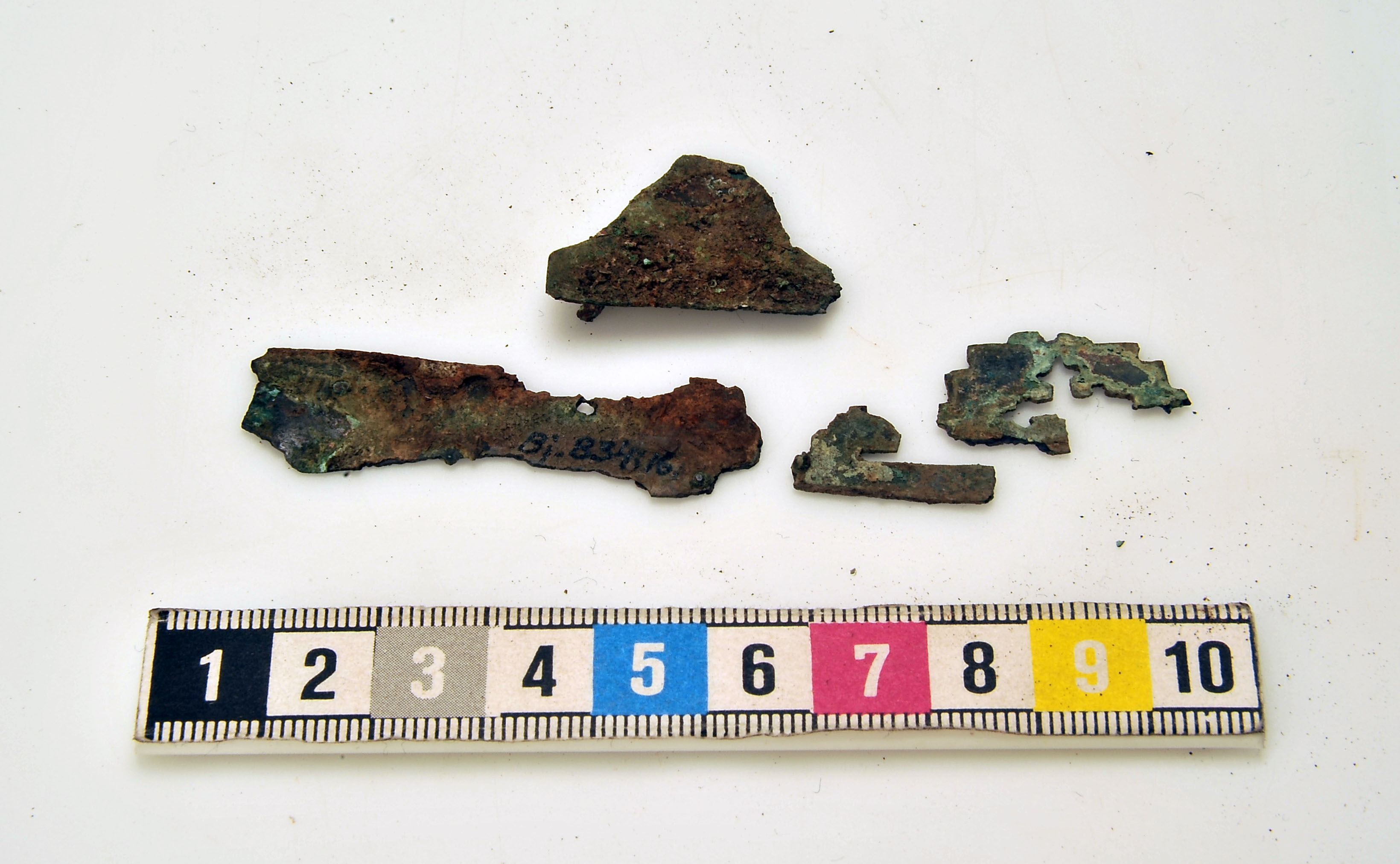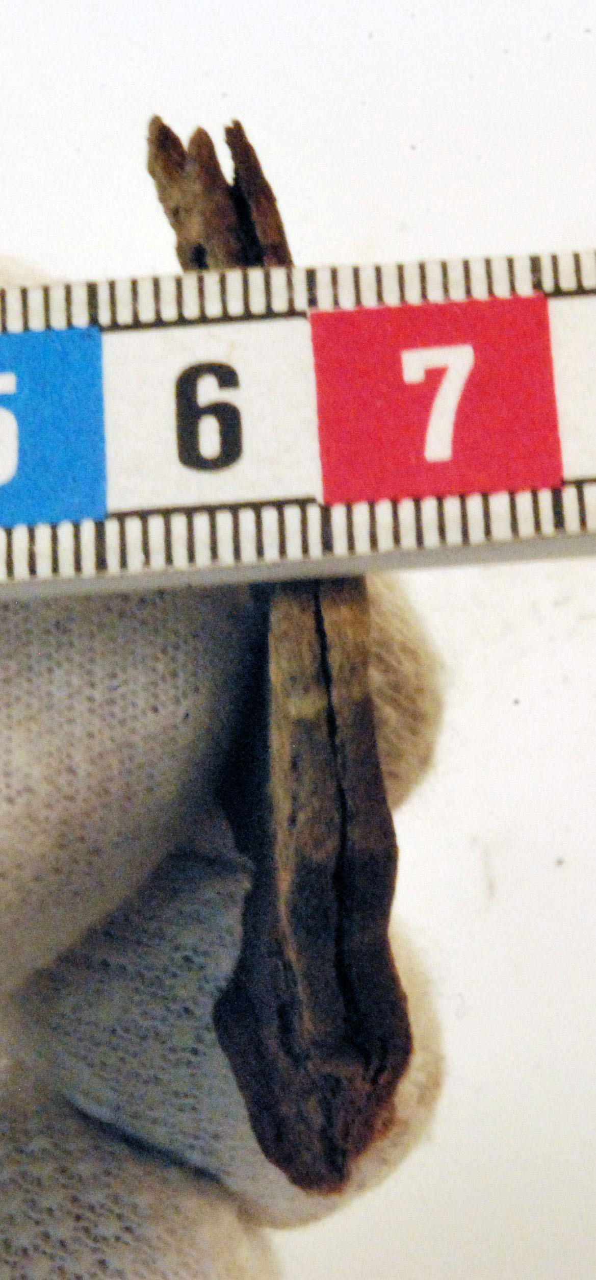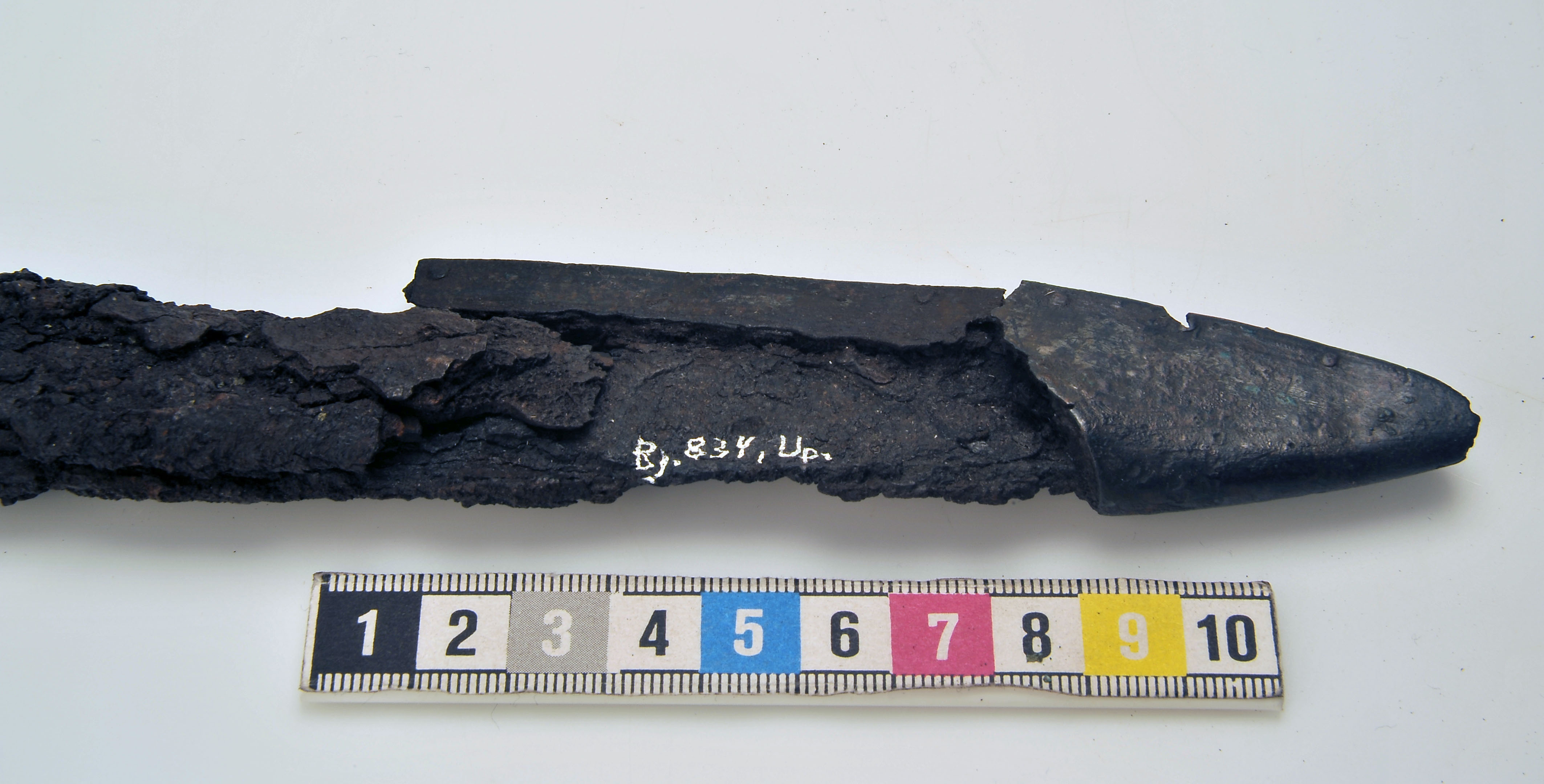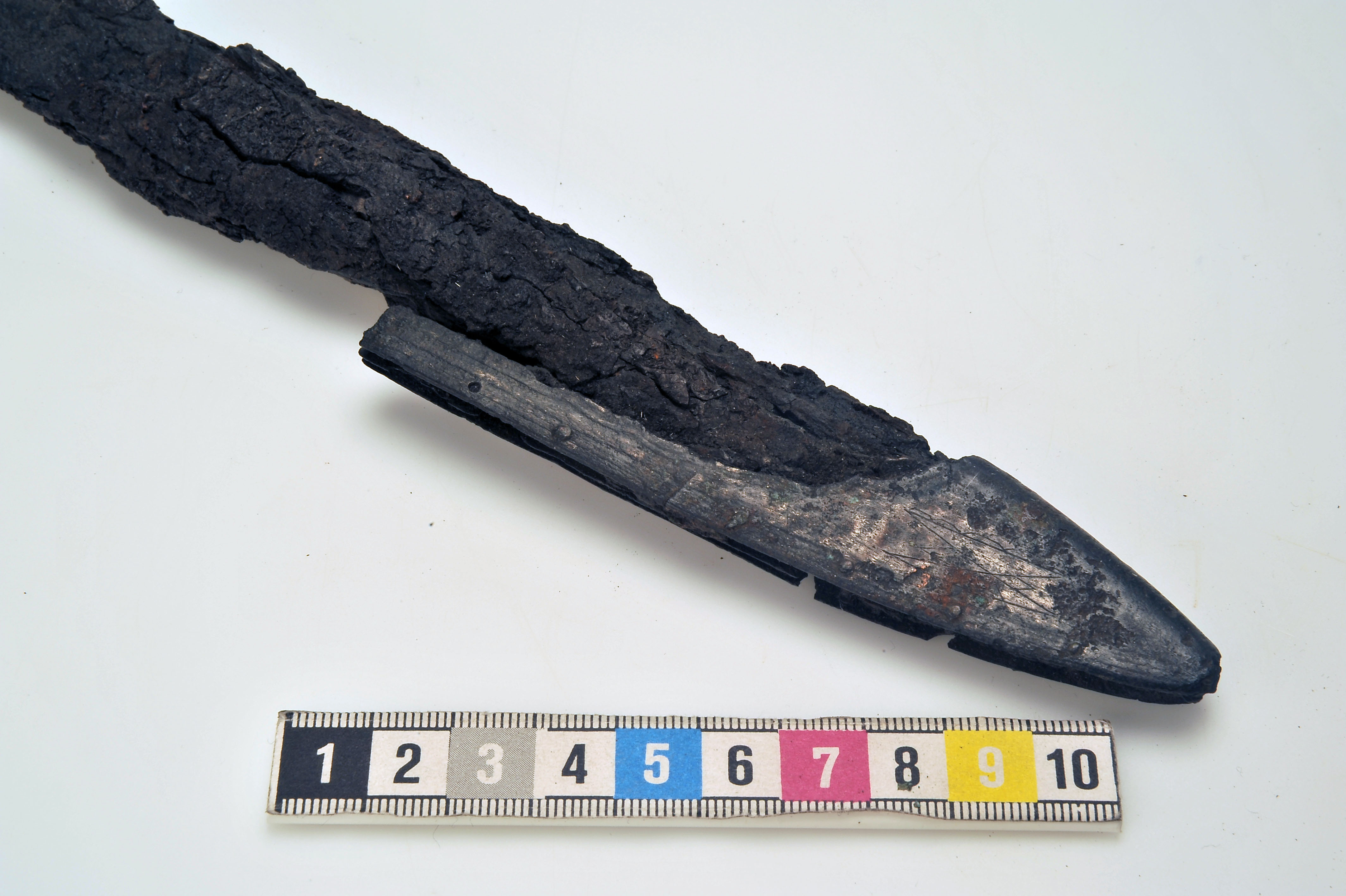 Ett 30-tal fragment av 1 vapenknivslida med läder bevarat i korrosionen.