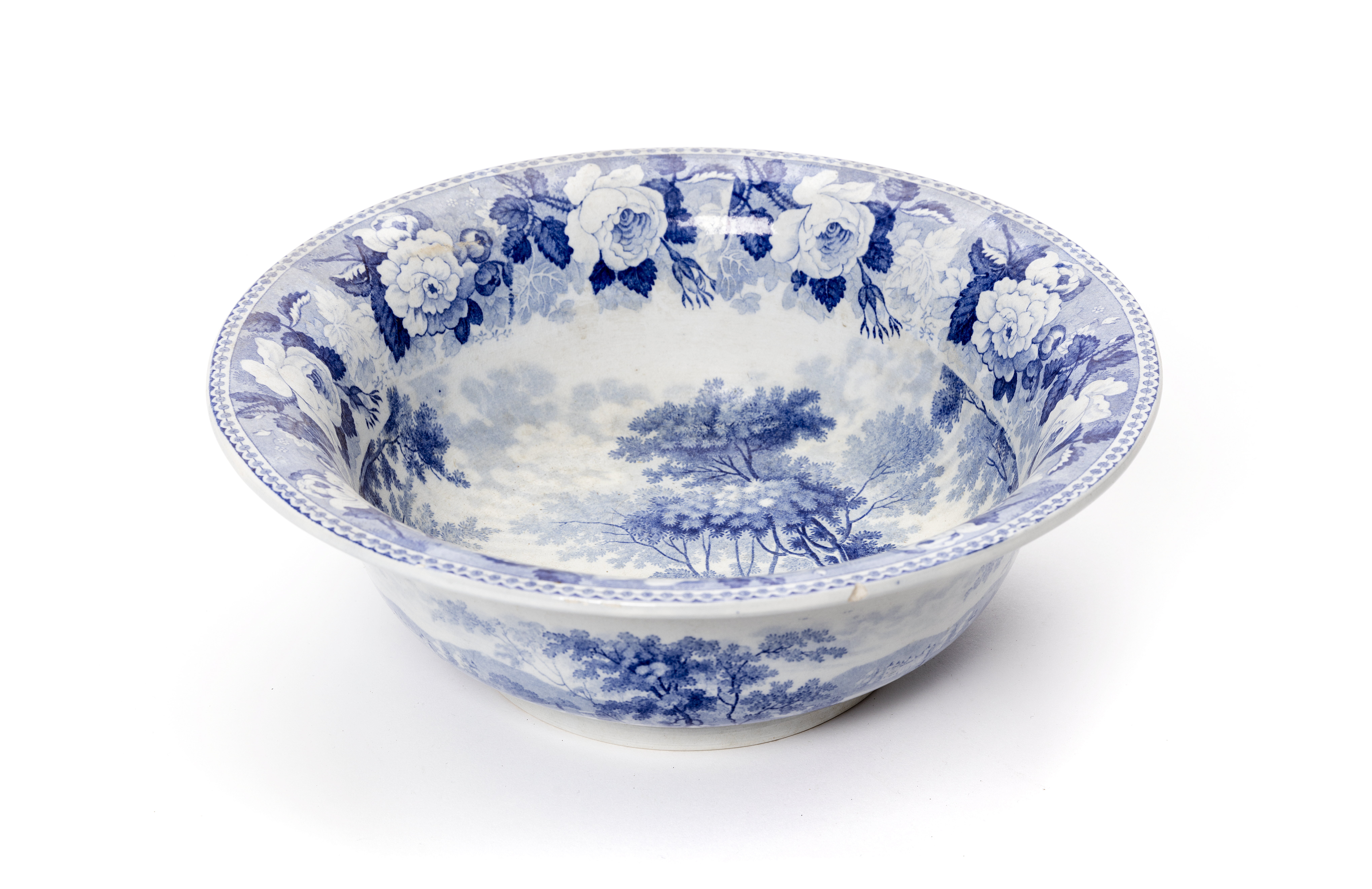 Tryckt rosenbård, i botten flod med bro, slott och figurer, på utsidan ett annat landskap, tre gånger. Reliefstämpel: "Rörstrand". Rörstrand 1820-40.