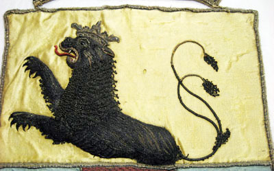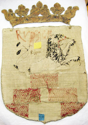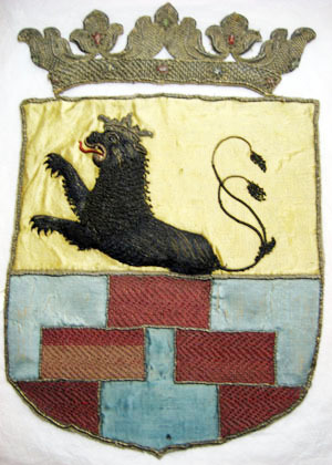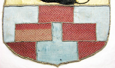 Delad sköld vars övre fält är av gul sidenatlas och det undre fältet är av blå sidenatlas. Skölden kantas runtom av en bård bestående av en snodd av silverlan, silvertråd och gul silkestråd virad runtom en silkeskärna, ytterst kantad av ett smalt vävt band vit silkestråd och silvertråd utdragen i små öglor. Samma slags bård delar skölden mitt på, mellan de två färgfälten. Mitt på det gula färgfältet på skölden, är applicerat ett reliefbroderi föreställande ett uppstigande lejon med kluven svans. Lejonet är huvudsakligen broderat i läggsöm med stygn av svart silkestråd samt med silvertråd med spår av förgyllning. Lejonet har ett öppet gap med en lång utsträckt tunga av röd silkestråd. Gapet kantas av en snodd av silvertråd samt ett flätat band av blekt röd silkestråd och silvertråd. Gapet är på insidan broderat med röd silkestråd. Lejonet har tre spetsiga tänder av vitt ben. Ögat är av en svart glaspärla och silverlan i ögonvrån, runtom kantat av kantilj av silvertråd och med ögonbryn av kantilj av silvertråd liksom nosborren. Örat är bakåtstruket, broderat av silvertråd och svart silkestråd. Lejonets man och benskägg består av krusad svart silkestråd. De två svansarna är av en snodd av svart silkestråd och silvertråd runtom en silkeskärna och med övre delen av svansarna av silvertråd runtom gul silkestråd med spår av förgyllning. Svanstipparna är av svart krusad silkestråd. Lejonets klor är av svart silkestråd, fem klor på vardera tass. Lejonet kröns av en öppen krona med fem spetsar, broderad med silvertråd med spår av förgyllning. I det nedre fältet av blå taft är broderat tre rektanglar och två halva rektanglar i en trappstegspyramid, av silvertråd och röd silkestråd i broderade i läggsöm i ett våffelmönster kallat gaufrure. Rektanglarna kantas av snoddar av silverlan och silvertråd runtom en silkeskärna. Den nedre, vänstra rektangeln, är ljusare i färgen då den även är broderad med vit silkestråd. Skölden kröns av en grevekrona, påsydd i två ändar. Kronan har fem spetsar av stiliserade blommor och blad. Mitt på vardera spets sitter en oval av grön och rödmålade lan, kantade av kantilj av förgylld silvertråd samt av små prickar av förgylld silvertråd. Spetsarnas kanter är broderade med silvertråd i relief. Kronringen är 35 mm bred, broderad av silvertråd i ett schackliknande våffelmönster, gaufrure. Kronringen kantas av snoddar av silverlan och silvertråd runtom silkeskärna samt nederst av ett smalt vävt band av vit silkestråd och silvertråd utdragen i små öglor. Mitt på kronringen sitter fem små ovaler av bemålade lan, blå och röda, runtom kantade av kantilj av förgylld silvertråd samt små prickar av kantiljer av silvertråd. Vapnet är på baksidan fodrat med beigefärgad linnelärft. Stygnen från broderierna syns på fodret. I nederkanten på skölden är påsytt en liten lapp av blå taft. Kronan har på baksidan täckts med ett brunaktigt limliknande material. Mitt på baksidan av skölden står skrivet med svart bläck: "Rügen" och i övre kanten står påmålat en påskrift med röd färg: "RugAen".