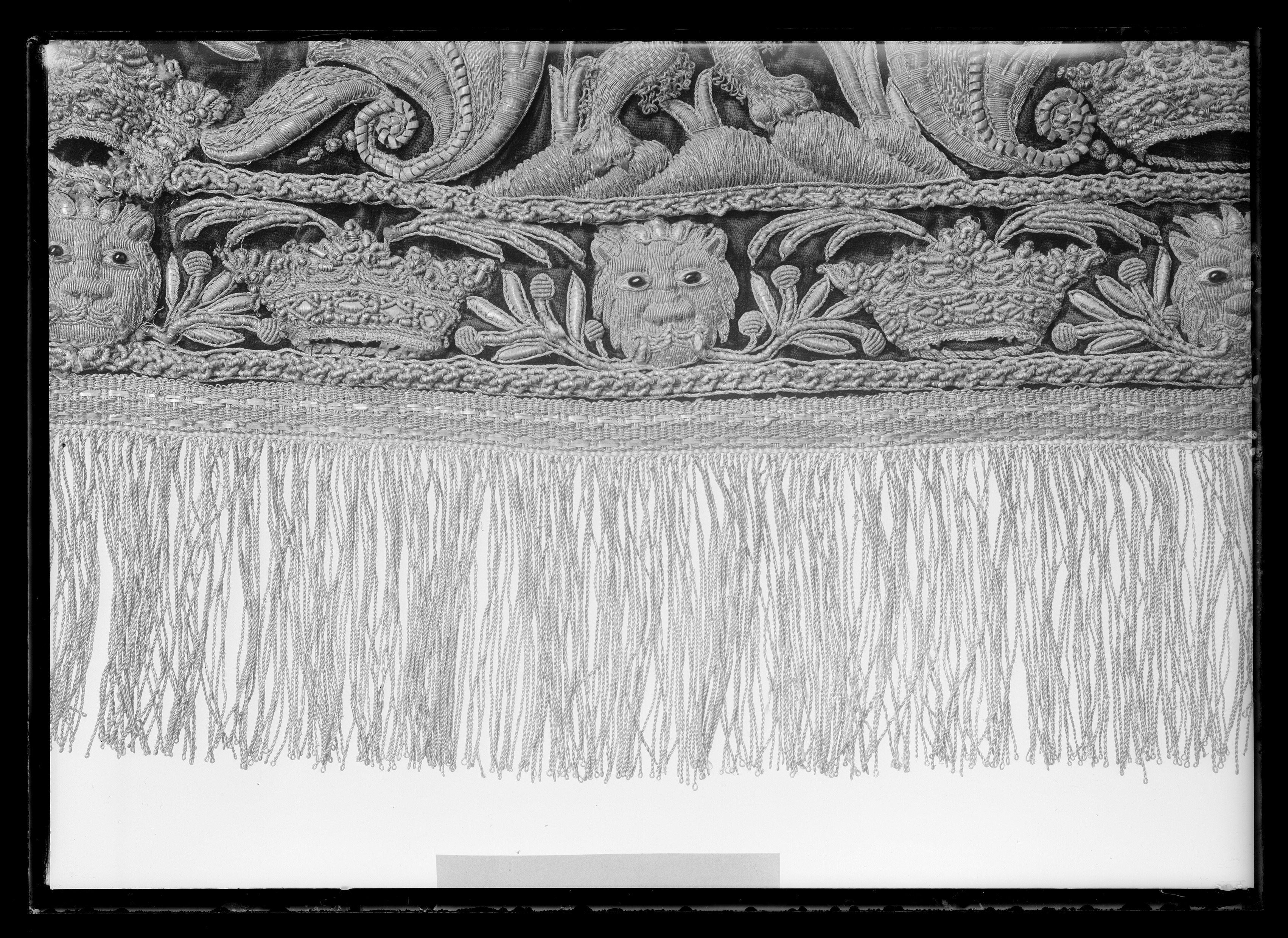 Till formen svagt rundat med insvängda överkanter, två hål för hästens öron, ytterst avslutad i en spetsig flik som vilar framme vid hästens panna. Bottentyg av svart silkessammet, täckt med broderier av guldtråd och guldlan samt med detaljer av silkestråd och kantiljer. Samtliga broderier är utförda i hög relief med hjälp av silkeskärna. Broderierna är indelade i tre fält där det dominerande fältet utgörs av guldkronor uppställda i rader. Nedanför kronorna följer ett brett fält med ett broderi med ett vegetativt uppåtsträvande mönster av slingrande blad, voluter och blommor liknande liljor. I den nedre kanten av broderiet står sex dubbelsvansade lejon med utsträckta tungor av röd silkestråd. Lejonen är broderade av guldtråd med detaljer av silkestråd samt med svarta rundslipade ögon liknande pärlor, troligen av stenkol. Det nedersta fältet utgörs av ett broderi med nio lejonhuvuden mellan vilka har broderats kronor och bladknippen som växer ut ur lejonens gap. Det nedersta fältet kantas upptill och nedtill av ett band av guldtråd i ett flätat kedjemönster. Halskappan avslutas nedtill av en frans av guldtråd, l. 95 mm, av tvinnad guldtråd och med en kant av ett vävt band, 15 mm, av guldtråd med invävda guldlan. Halskappan är på baksidan klädd med svart linnelärft och runtom hålen för öronen är påsytt ett bomullsband. På sidorna sitter fyra svarta silkesband. Fodret och banden är tillkomna under senare tid.