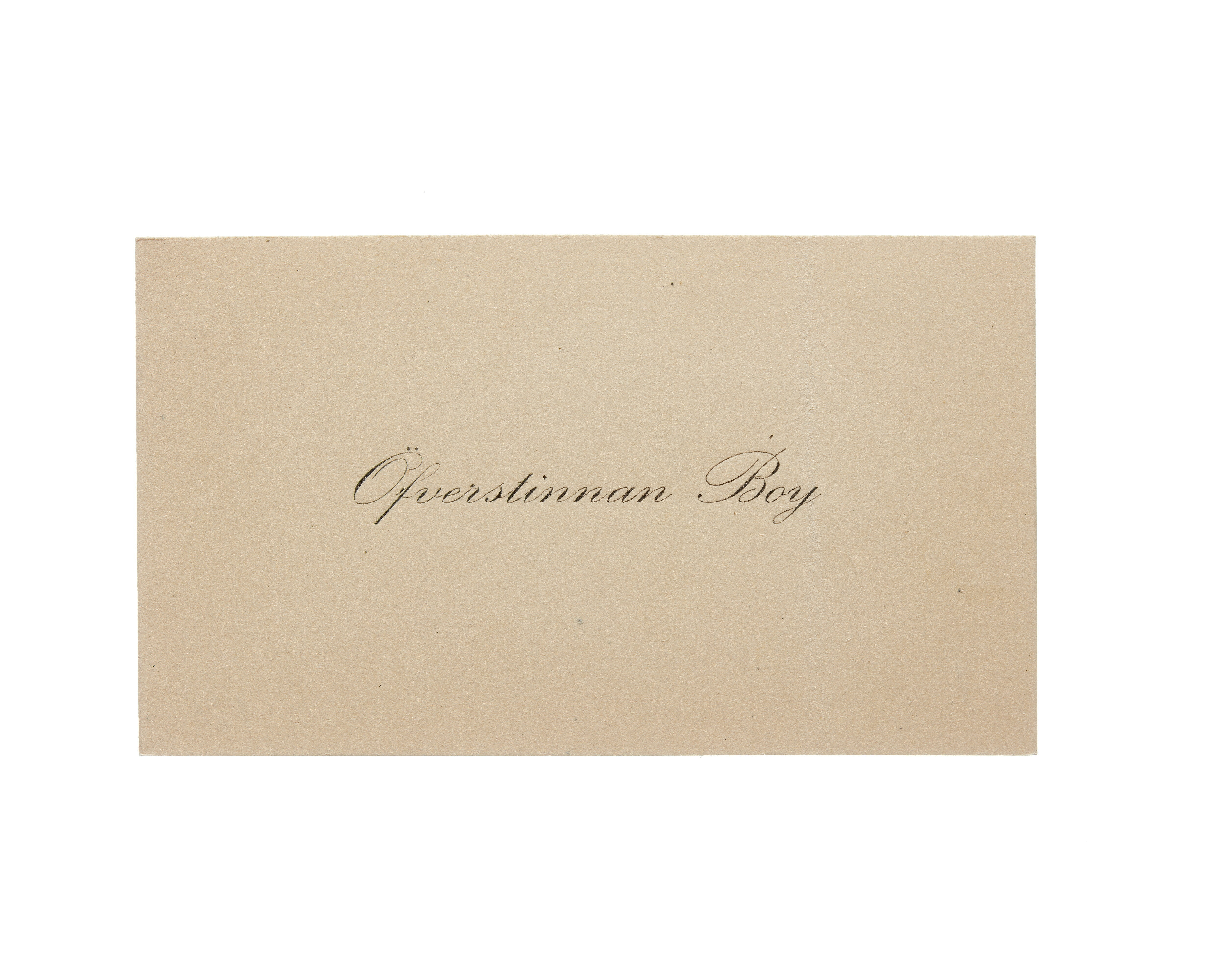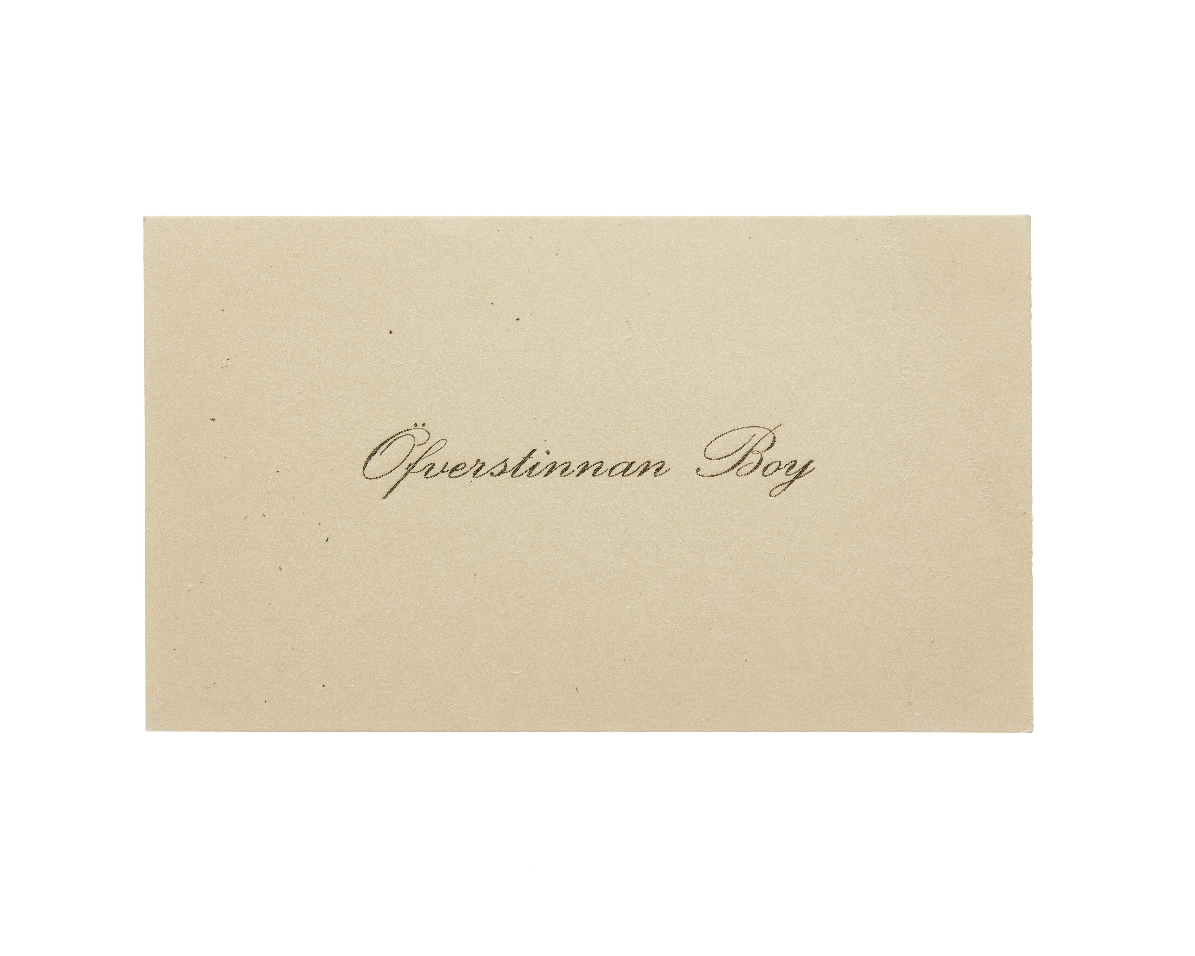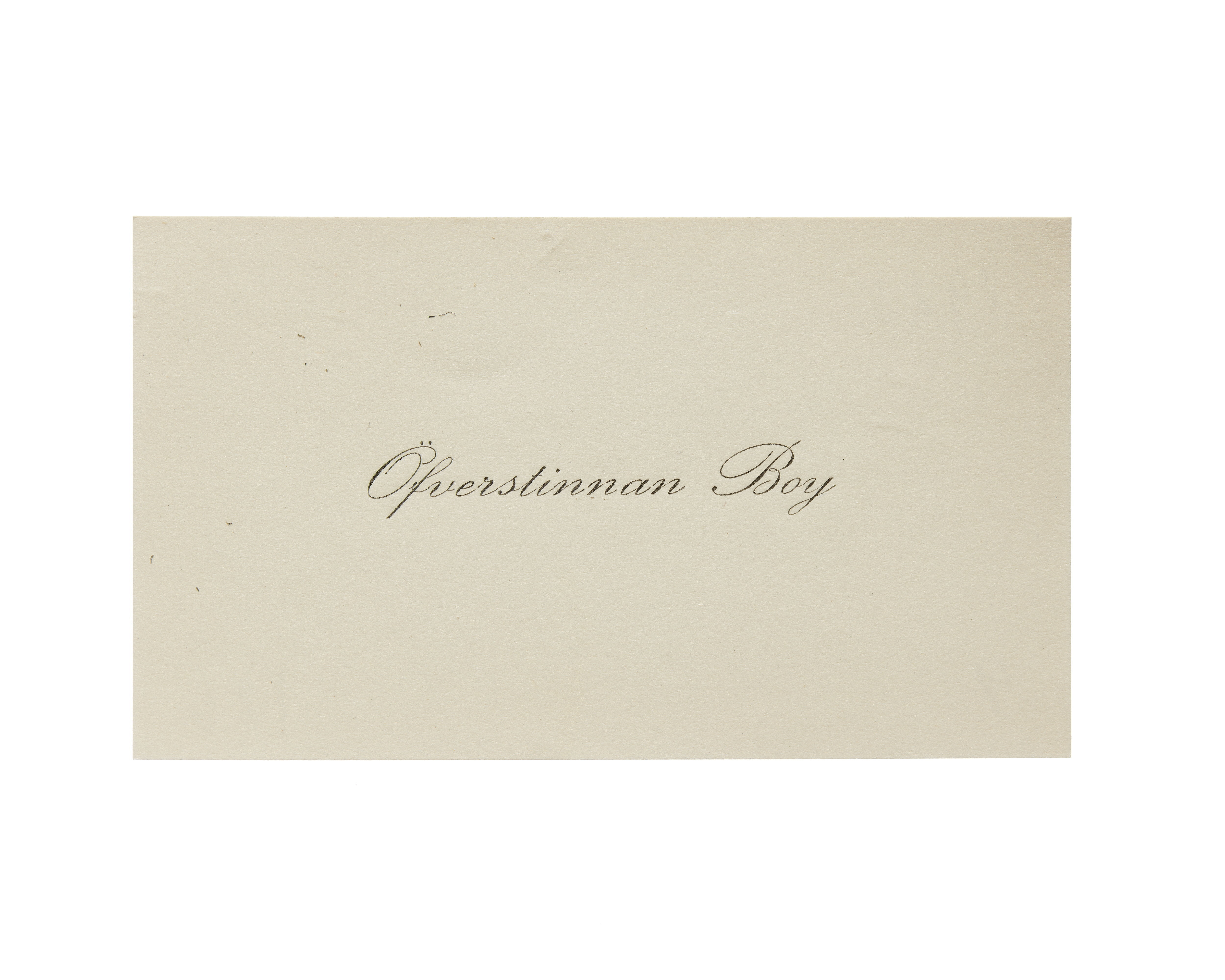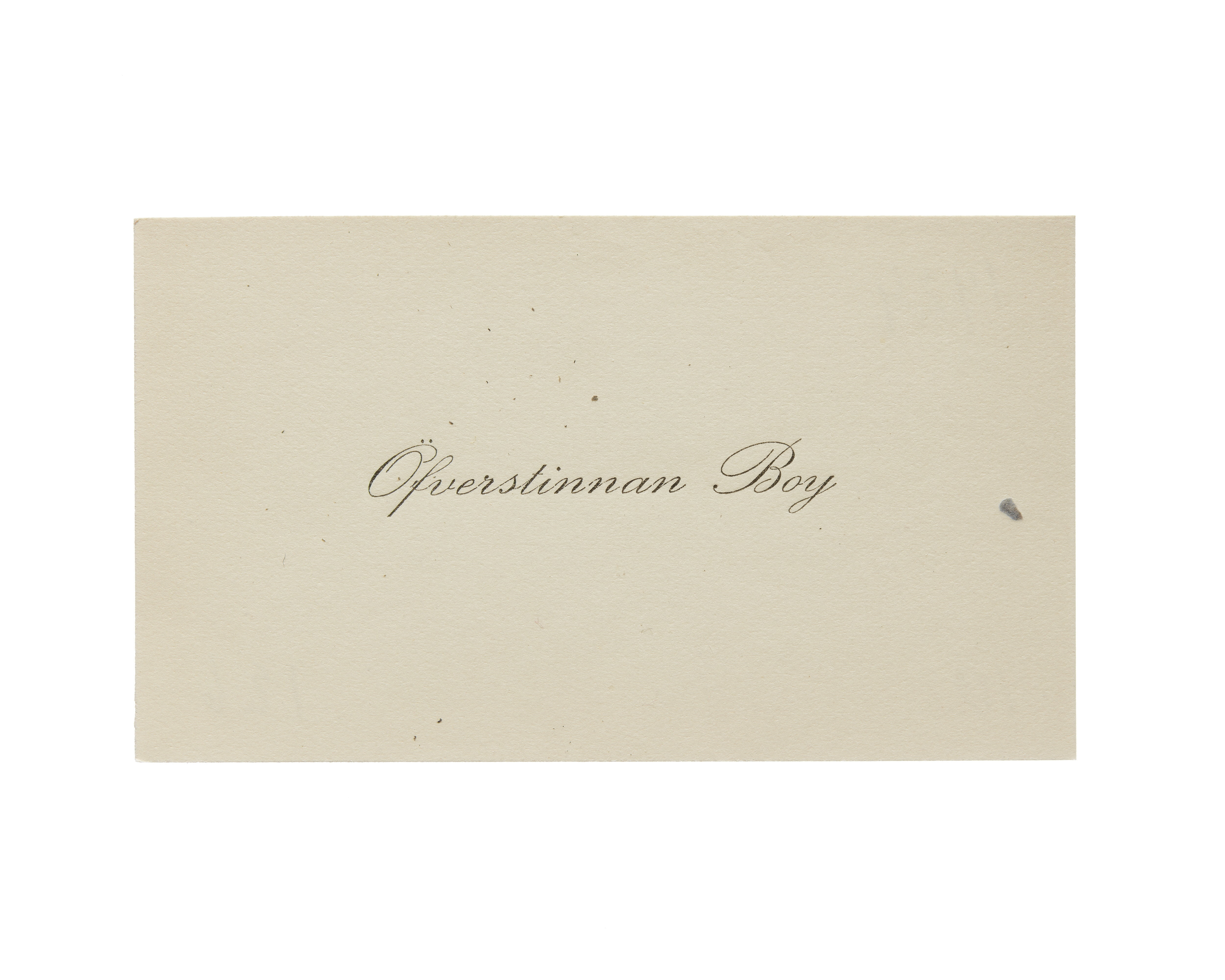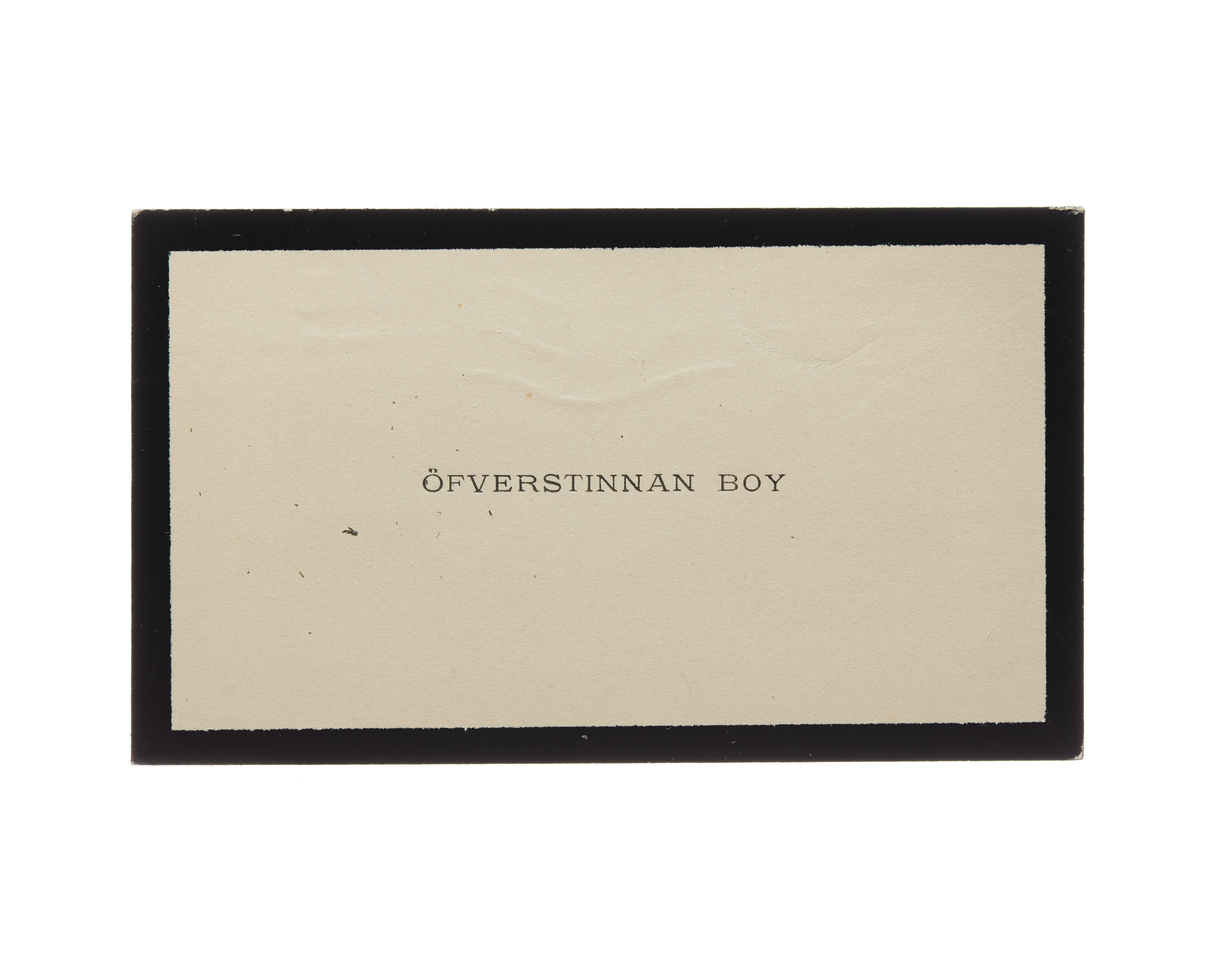 Elva visitkort från överstinna Thekla Boy f. Milow. Första kortet daterat 1916, vikt i vänstra sidan. Andra kortet daterat 1917, vikt i vänstra sidan. Tredje kortet daterat 1918, vikt i högra sidan. Fjärde kortet är utan datum, vikt i högra sidan. Femte kortet daterat 1919, vikt i övre högra hörnet. Sjätte kortet daterat 1919 vikt i högra sidan. Sjunde kortet daterat 1921, sorgkant. Åttonde kortet daterat 1922. Nionde kortet daterat 1923. Tionde kortet daterat 1924. Elfte kortet daterat 1927, vikt i vänstra sidan.