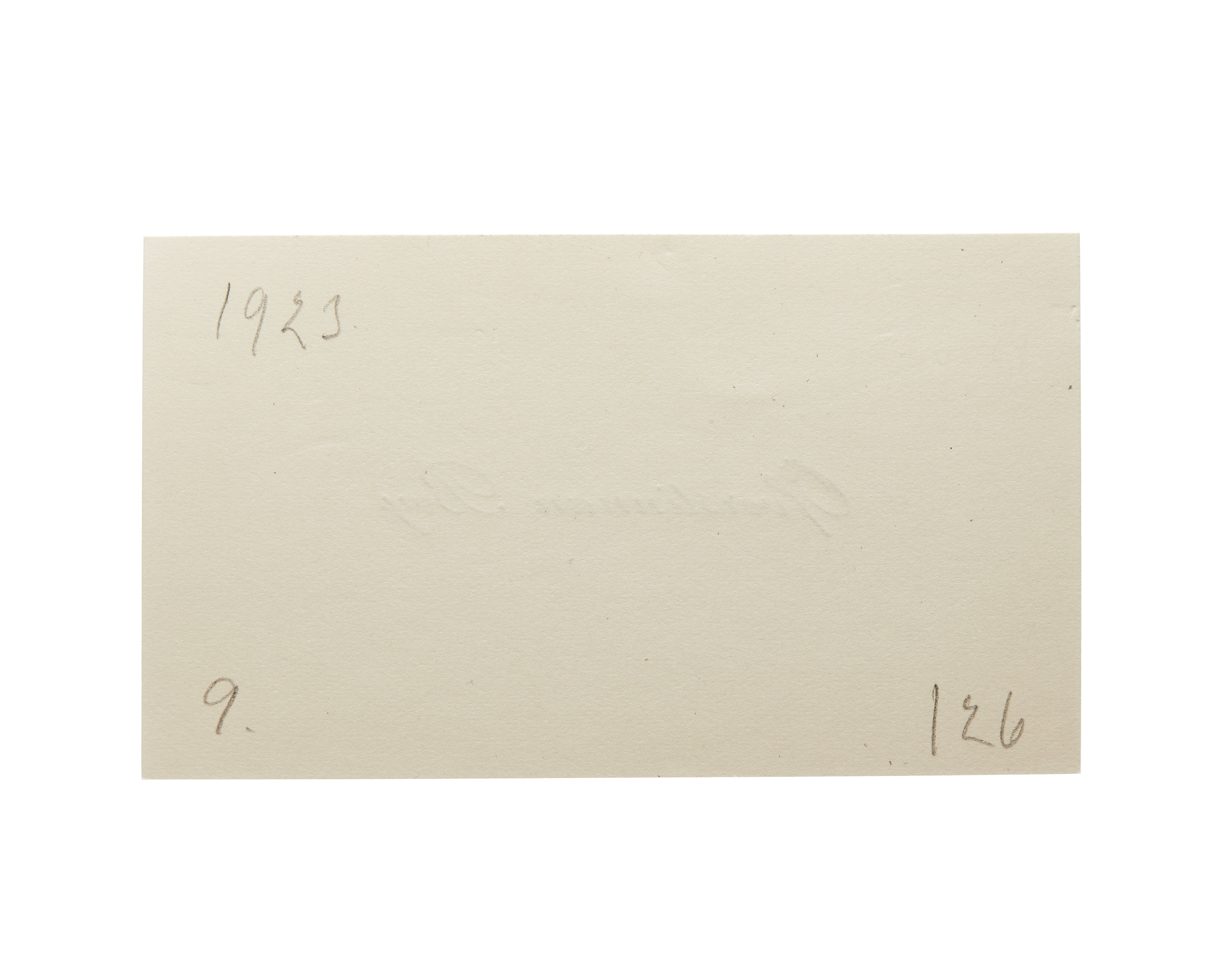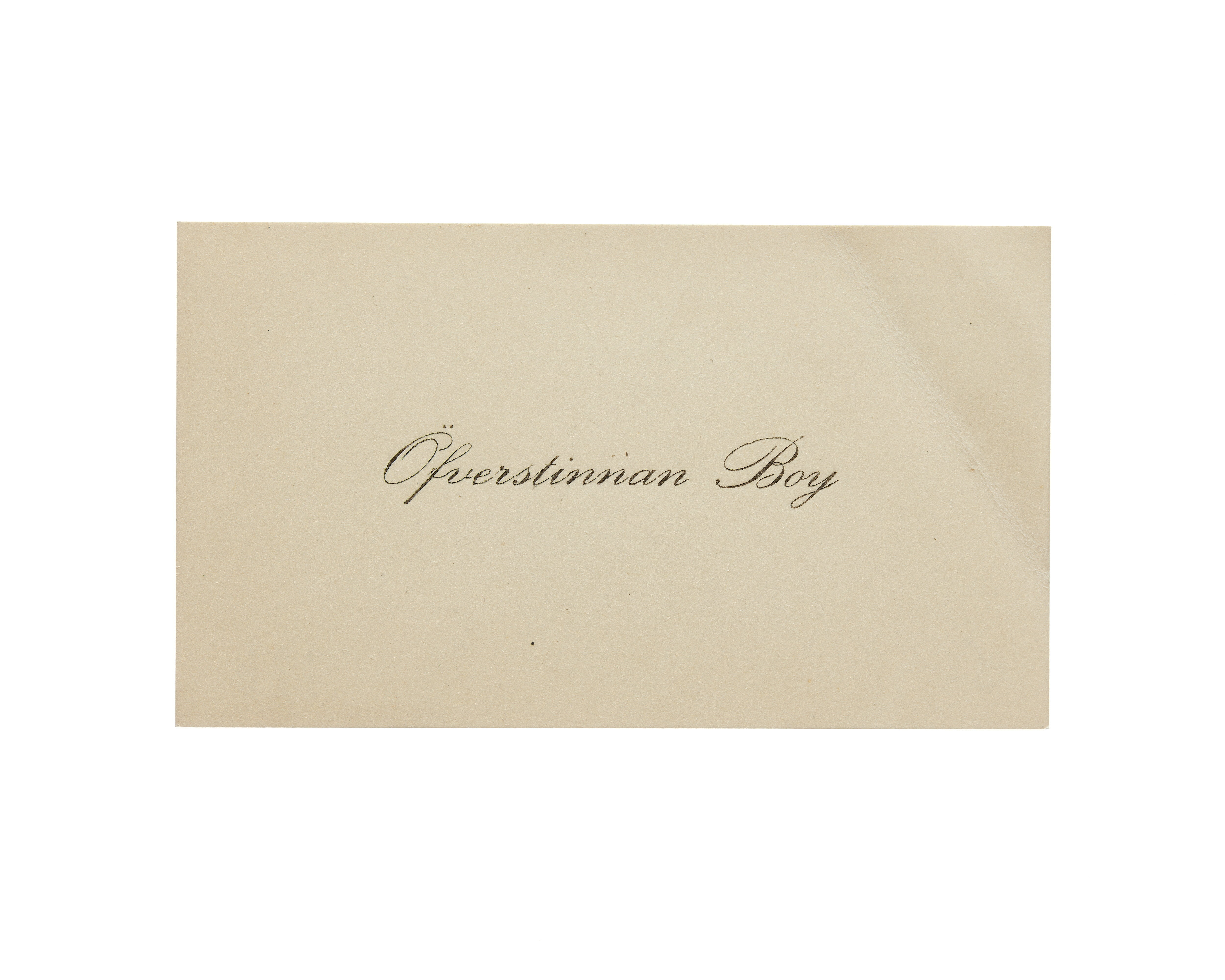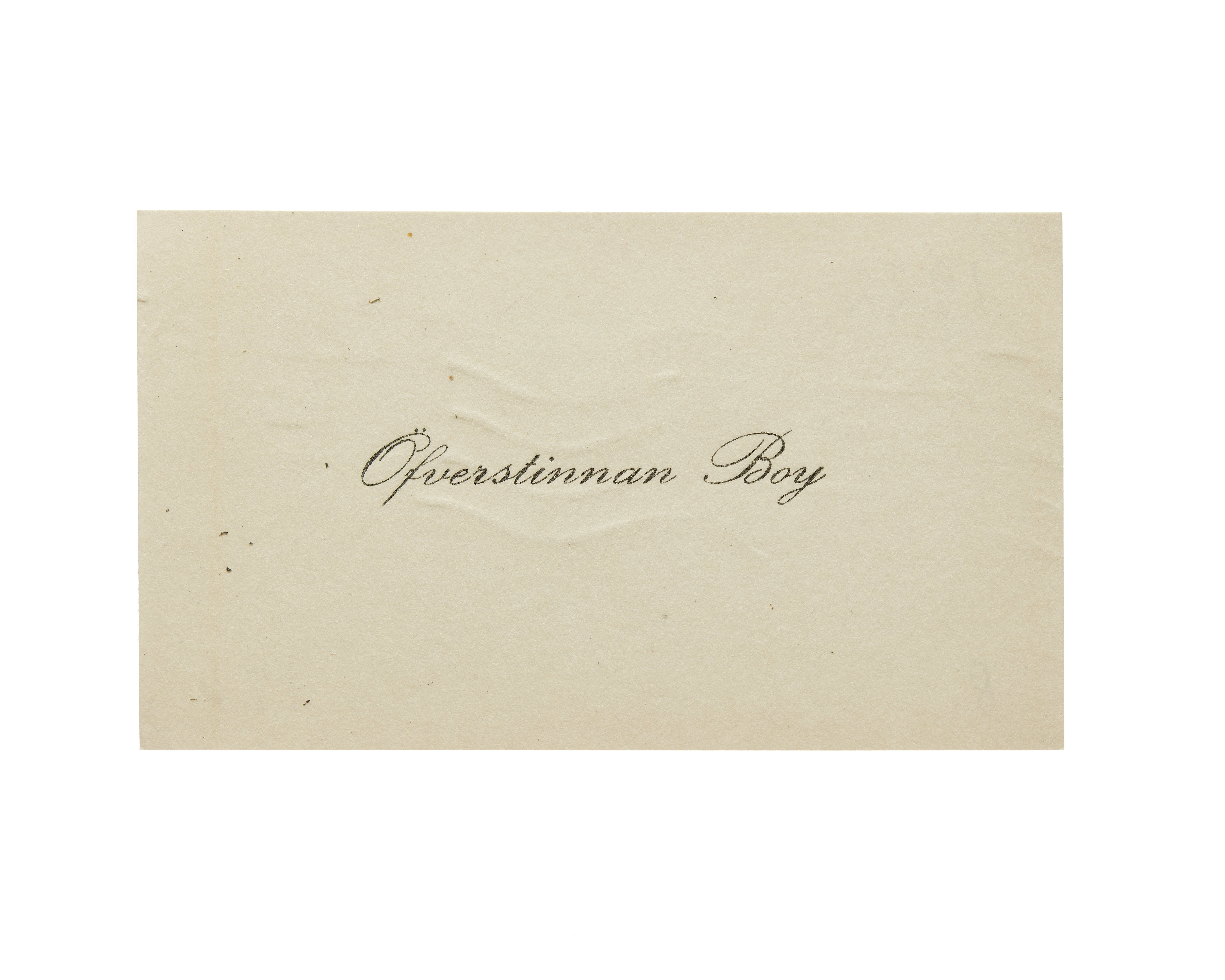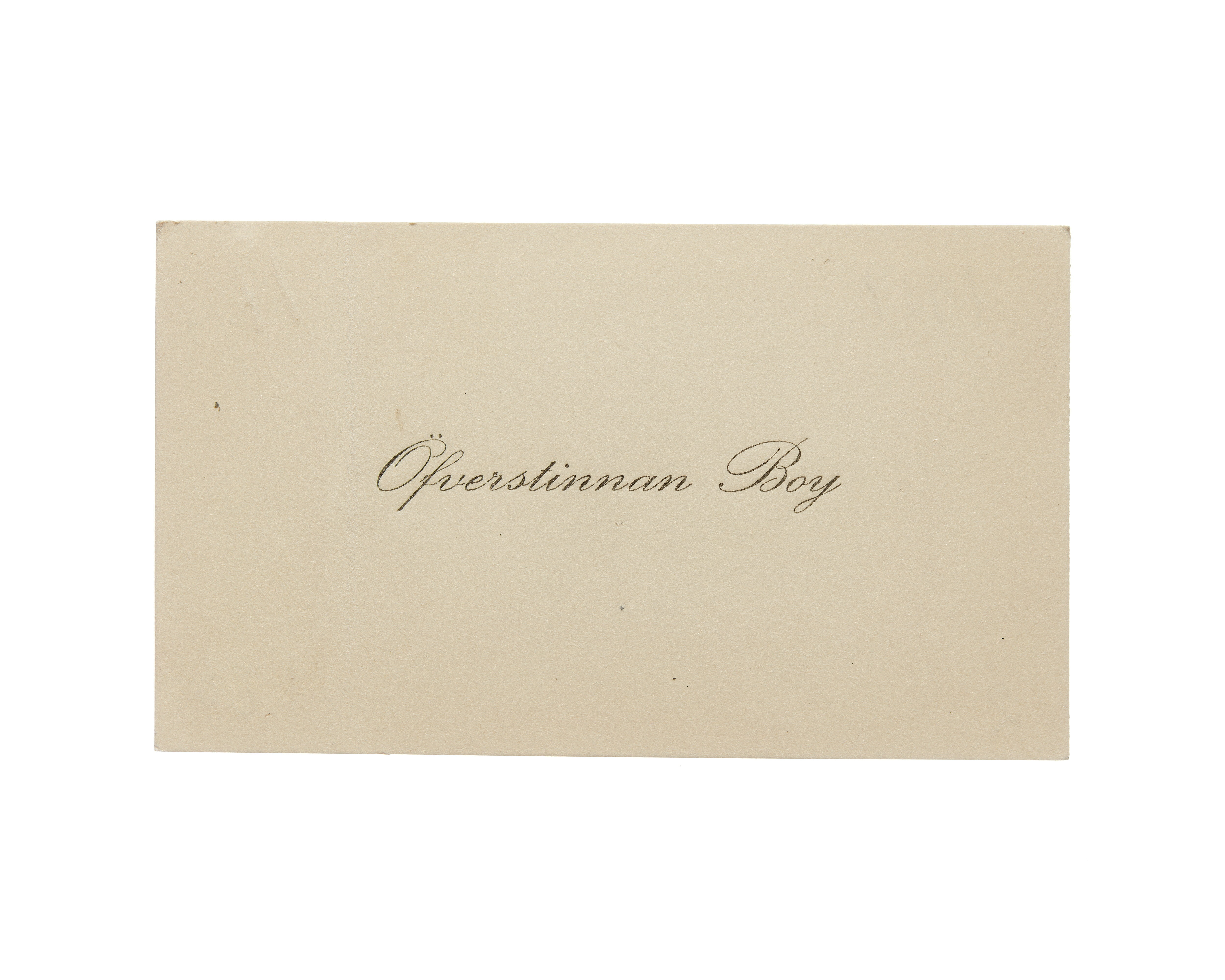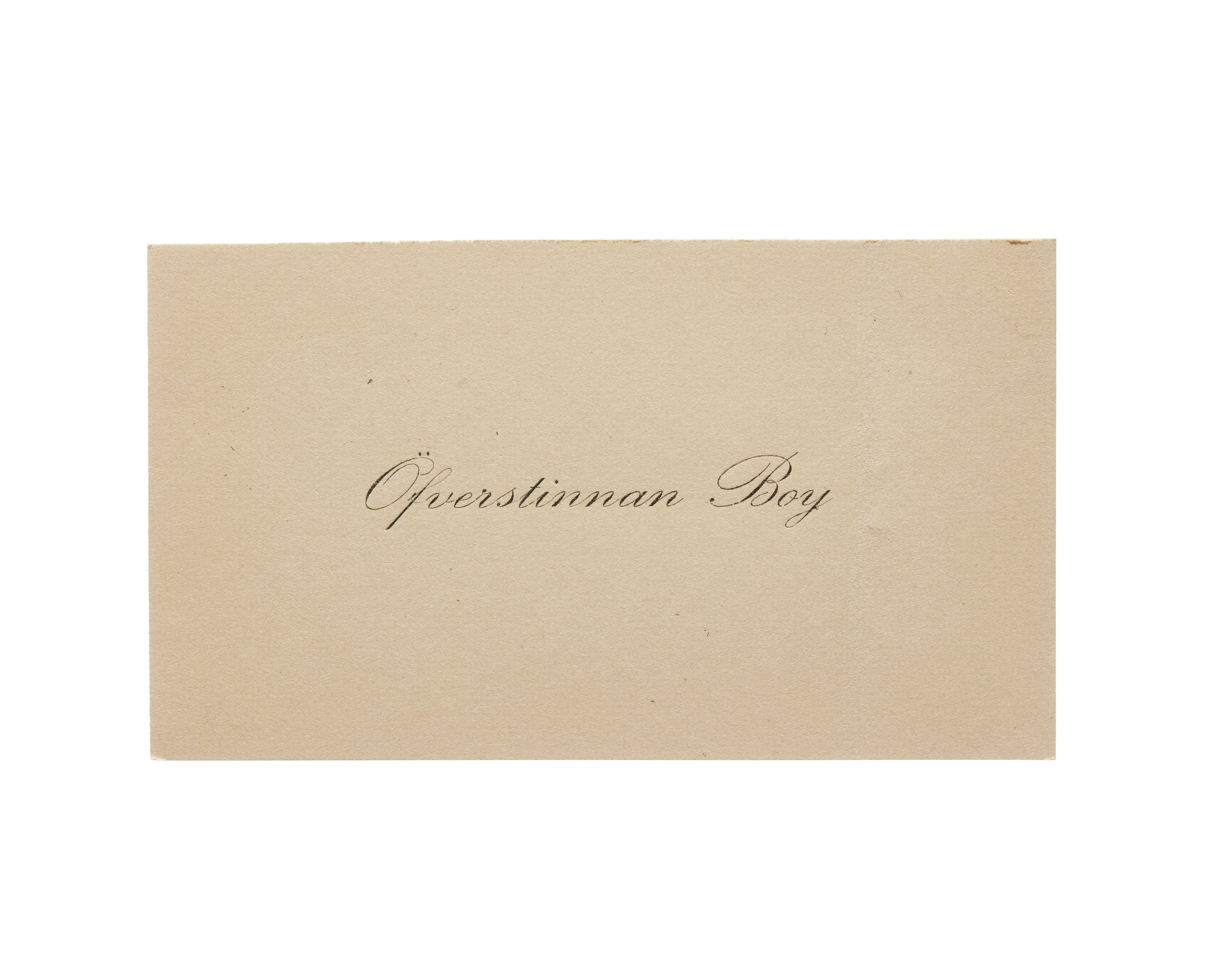 Elva visitkort från överstinna Thekla Boy f. Milow. Första kortet daterat 1916, vikt i vänstra sidan. Andra kortet daterat 1917, vikt i vänstra sidan. Tredje kortet daterat 1918, vikt i högra sidan. Fjärde kortet är utan datum, vikt i högra sidan. Femte kortet daterat 1919, vikt i övre högra hörnet. Sjätte kortet daterat 1919 vikt i högra sidan. Sjunde kortet daterat 1921, sorgkant. Åttonde kortet daterat 1922. Nionde kortet daterat 1923. Tionde kortet daterat 1924. Elfte kortet daterat 1927, vikt i vänstra sidan.