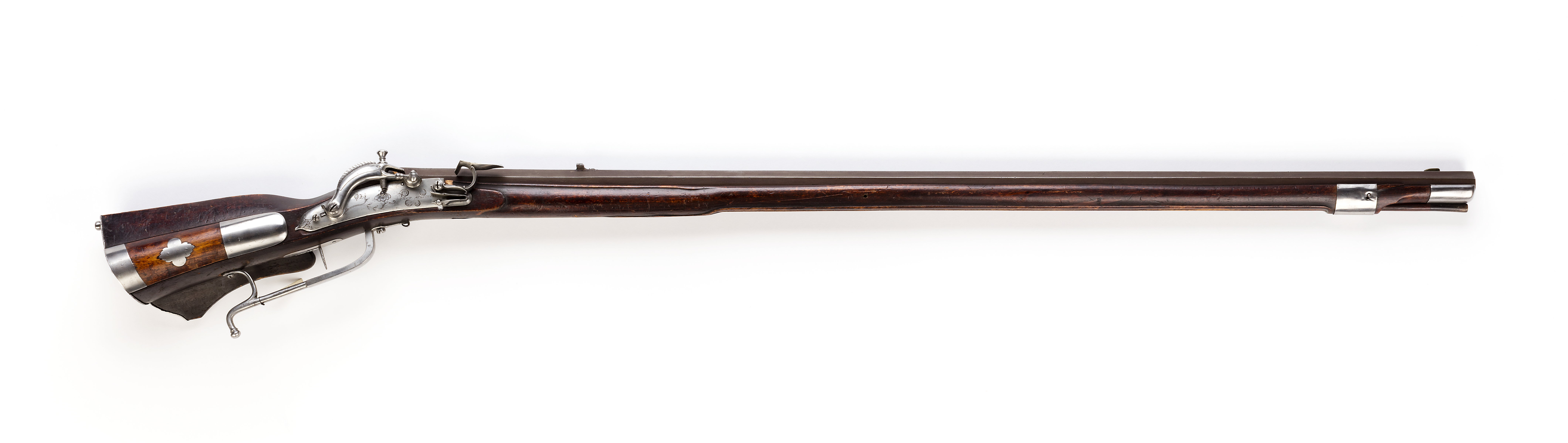 Åttsidig, brunerad, åttaräfflad pipa med svag trumf, de tre övre faserna svagt skålade. Rektangulärt, i vinkel böjt svansskruvblad. Vid pipbasen på sidofaserna stämplar: I S P C (Stöckelnr 3622), den h. mycket otydligt. Riktmedel: Från svansskruvbladets vinkel till siktet en infilad siktskåra. Inlaxat ståndsikte med u-formig skärm med blyplatta. Fastlött, spolformigt korn av mässing. Fästning: Två häften. Pipan fäst med krysskruv underifrån (främre varbygelskruven) samt två pipstift av stål. Snapplås, lägglås med svagt välvt låsbleck. Graverad dekor i form av kantlinje samt vid bakspetsen ett bladknippe och från hanen en framåtriktad blomranka med en knopp och en utslagen blomma, där det runda mittpartiet utgörs av bakre låsskruvens ände. Därframför en graverad signatur i skrivstil: "Peter Froomen" med utsirade, versaler. Böjd, rundad hane med inlaxad överkäke, tvärt avskurna läppar, på ryggen en fenliknande, graverad ås, öga vid munöppningen. Nötskruv med blomformigt graverat huvud. Käkskruv med omvänt koniskt huvud. Litet helspännshak på hanhälen. Rundad fängpanna med vridlock med svarvat grepp. Batteri med upptill rundat eldstål och svagt åsad rygg. Arm delad i en s- och en c-formig del, L-formig klack, batterifjäder utan studel, litet fjäderlöv med rund platta och triangel. Komma-formig nöt. Fästning: Två låsskruvar. Rak avtryckare. Ovalt avtryckarbleck av stål. Helstock av päronträ med svagt klövliknande kolv med vinge och kolvlåda. Beslag av stål. Bakplåt med flik gående ner på vingens bakkant, graverade rustkammarnummer: "No 11" samt otydligt: 11, stödkula av stål. På kolvlådelocket ändbeslag samt blomformigt mittbeslag, fyra blad varav två rundade och två flikiga. På kolvryggens ändar två beslag i form av plattor med mot varandra riktade bladknippen. Sidbleck i form av en oval mittplatta med graverat namnchiffer krönt av adlig krona, spegelmonogram C B, samt två 8-formiga armar med graverade kantlinjer. Näsband samt överrörka i form av stålband, laddstocksrännan sluten under överrörkan. Varbygel med kraftig, fyrsidig främre del och rundad, nedåtsvängd bakre del avslutad med kula, omvänt c-formigt svängd bakre stolpe, två skruvar, den främre krysskruv, framför krysskruven en liten spets med i ring omböjd ände. Tillbehör: Laddstock av stockens trä, l: 955 mm, i framänden skodd med horn, l: 34 mm, i bakänden ett invändigt gängat stålrör, l: 127 mm.