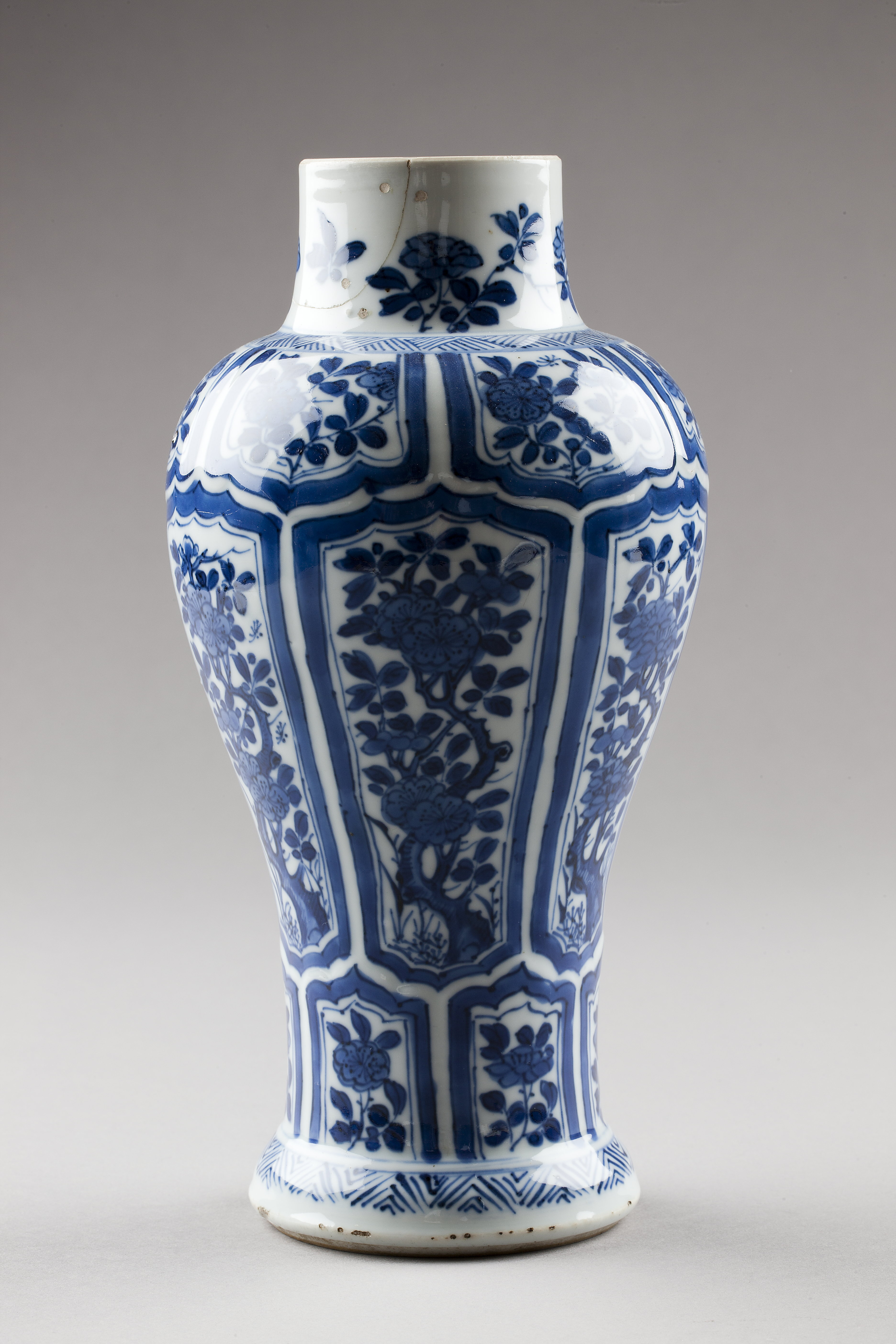 VAS. Omvänt päronformig med dekor indelad i fält, runt buken sex avlånga med konturerade ändar, runt skuldra och fot sex avskurna med konturerad innerända. I fälten träd med blommor och blad och kvistar med blommor och blad. Runt foten en sicksackbård, runt skuldran en flätbård; på halsen två kvistar med blommor och blad. På bottens utsida två koncentriska ringar. Underglasyrmålning. Mynningskanten på insidan samt fotens stödyta oglaserade. Inköpt av Wilhelmina, gåva till modern Vase, Qing.dynasty.