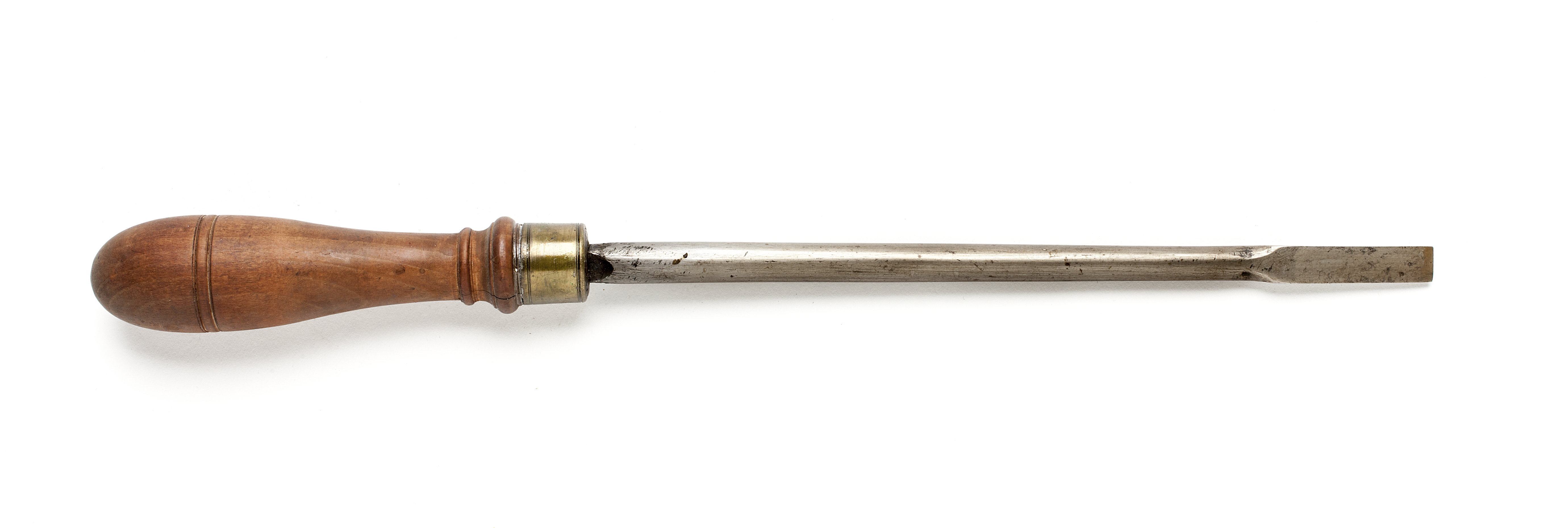 Rund klinga, i änden rektangulär genomskärning med två avfasade kanter. Svarvat skaft av päronträ med två vulster nedtill ("skoklostertyp"). Mässingsring.