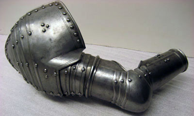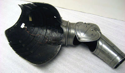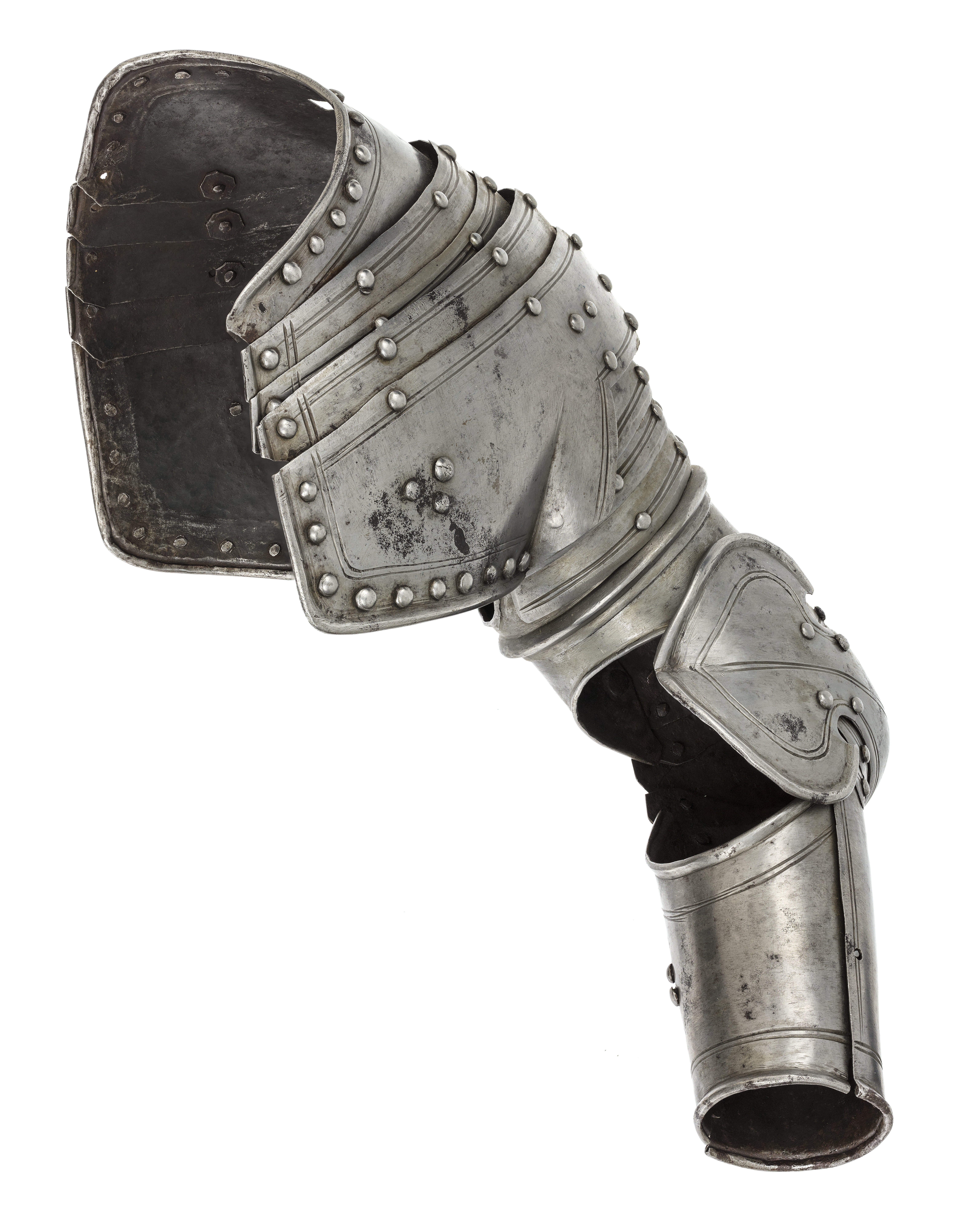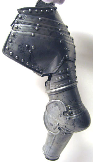 Driven stålplåt med blankslipad och polerad utsida. Sammanlagt 17 delar. Axelstycke av fem välvda skenor lada omlott med driven mittås. Utdragna över bröst och skuldra, bildandes en enhet. Översta skenan med rundad urtagning för halsen, djupare över bröstet. Över axeln en hake och ovanför denna ett rektangulärrt hål, 10 x 15 mm. Nedersta skenan med urtagning för armen med kanterna vinklade upp mot denna. Mörka läderband på insidan. Armskena av två skenor bildandes ett rör, sammanfogade i varandra genom rörlig led. I övre skenan tre mindre uppåt avsmalnande välvda skenor, placerade omlott och nitade i kanterna. Välvd armbuckla formad som rundad spets, inåt tvärt avslutad och utåt övergående i mussla med spetsoval form. Musslans spetsiga ytterkant svagt V-formig. Över och under bucklan två mindre skenor med övre kanterna svagt S-formade och i mitten V-formig urtagning. Underarmsskena av två välvda halvor bildandes ett rör. Nedåt avsmalnande och öppningsbar genom på insidan två gångjärn och mot utsidan tapp genom hål. Inre skenan mindre med övre kanten lutande snett utåt. Alla yttre kanter omvikta och rundsmidda. Enkel dekor av två skurna linjer och nitar i rad längs kanterna.