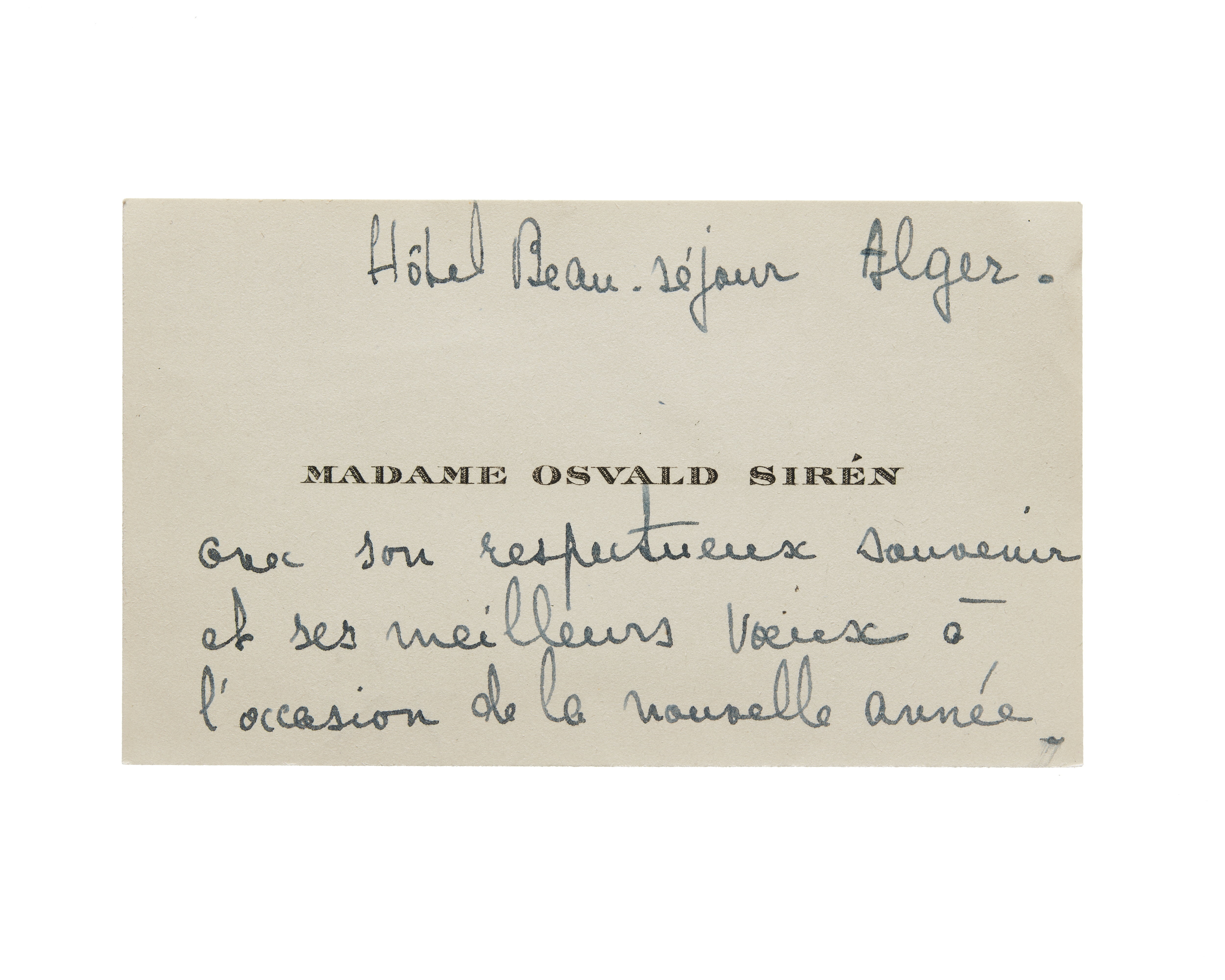 Ett visitkort från Rose Sirén, f. Carbonel, daterat 1928-29. Handskrift på franska: "Hôtel Beau-séjour Alger." "avec son respectueux souvenir et ses meilleurs voeux à l'occasion de la nouvelle année."