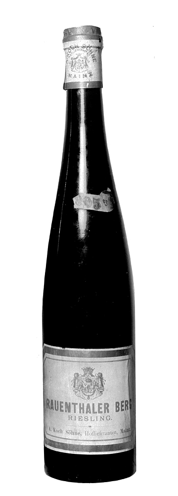 RAUENTHALER BERG Riesling 1905, tre helbuteljer Buteljer av mörkbrunt glas. Kägelformig, kring mynningen en bandliknande utsvällning (s. k. stärkring); bottnen skålig. Etikett vit, på denna text och exportfirmans namn (A. Koch Söhne, Hoflieferanten, Mainz) i rött samt därovanför hovleverantörsmärke (svenska riksvapnet) i silver; upptill en bandliknande etikett, varpå i guld: "1905:er". Kapsyl av förtent bly, röd- och gråfärgad, på den grå delen exportfirmans namn och hovleverantörsmärke i röd relief, ovanpå en druvklase. Höjd: 36 cm.; diameter: 7,6 cm. Inköpt av Walther von Hallwyl något av åren 1905-1917.