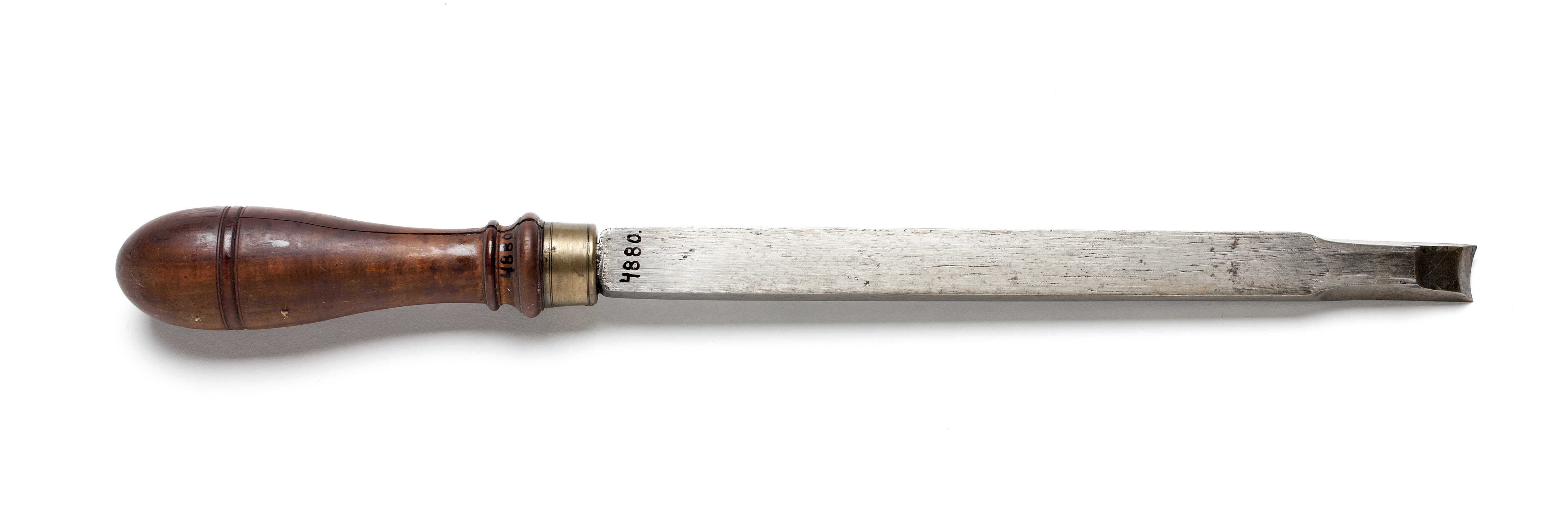 Klinga med rektangulär, i änden trapetsoidisk genomskärning. Konkav egg. Svarvat skaft av päronträ med två vulster nedtill ("skoklostertyp"). Mässingsring. Stämpel på skaftets ände vid fästet: två punkter.