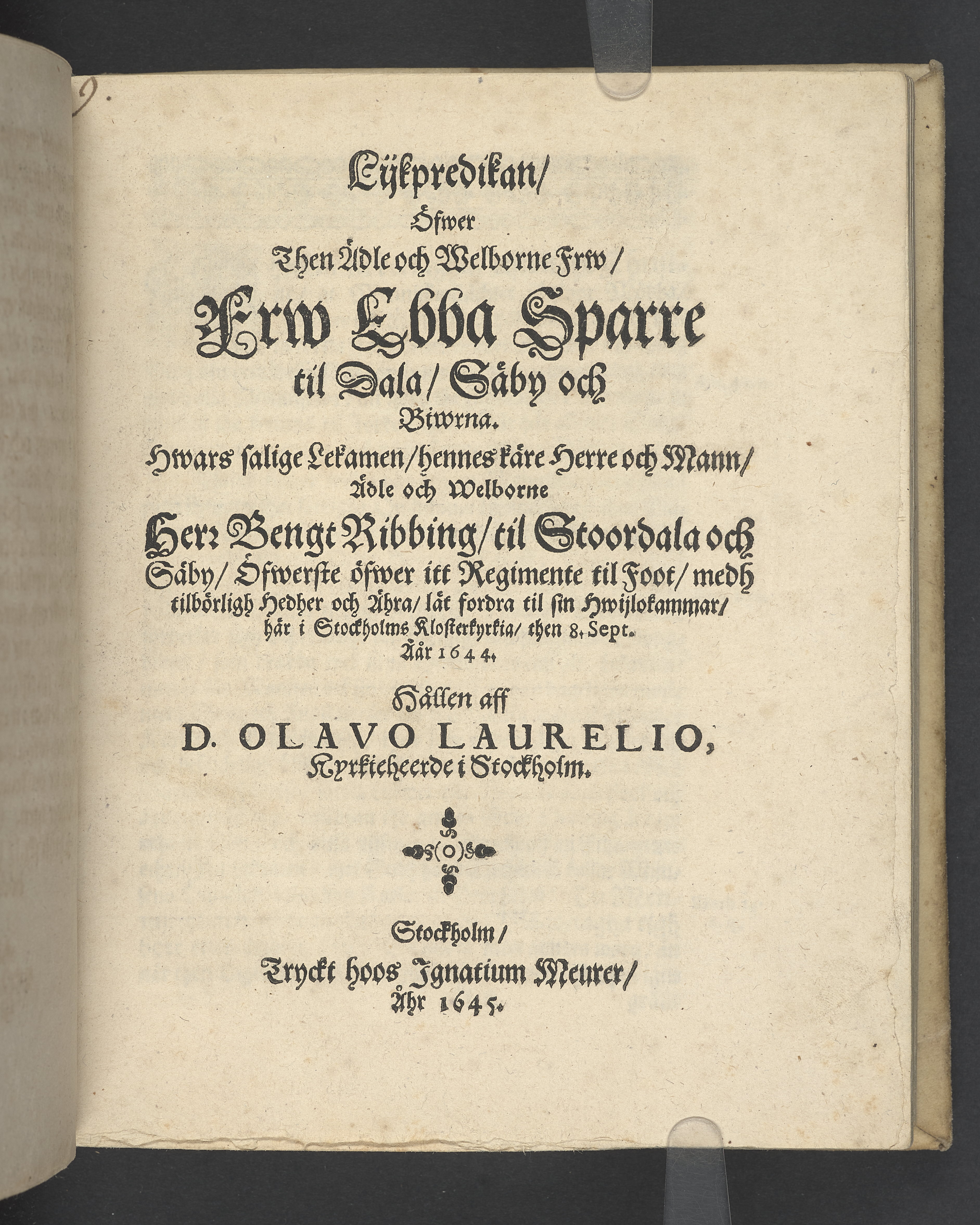Lijkredikan, öfwer... Fru Ebba Sparre til Dala... i Stockholms klosterkyrkia, then 8. sept. åår 1644... Stockholm, tryckt hoos Ignatium Meurer, åhr 1645.