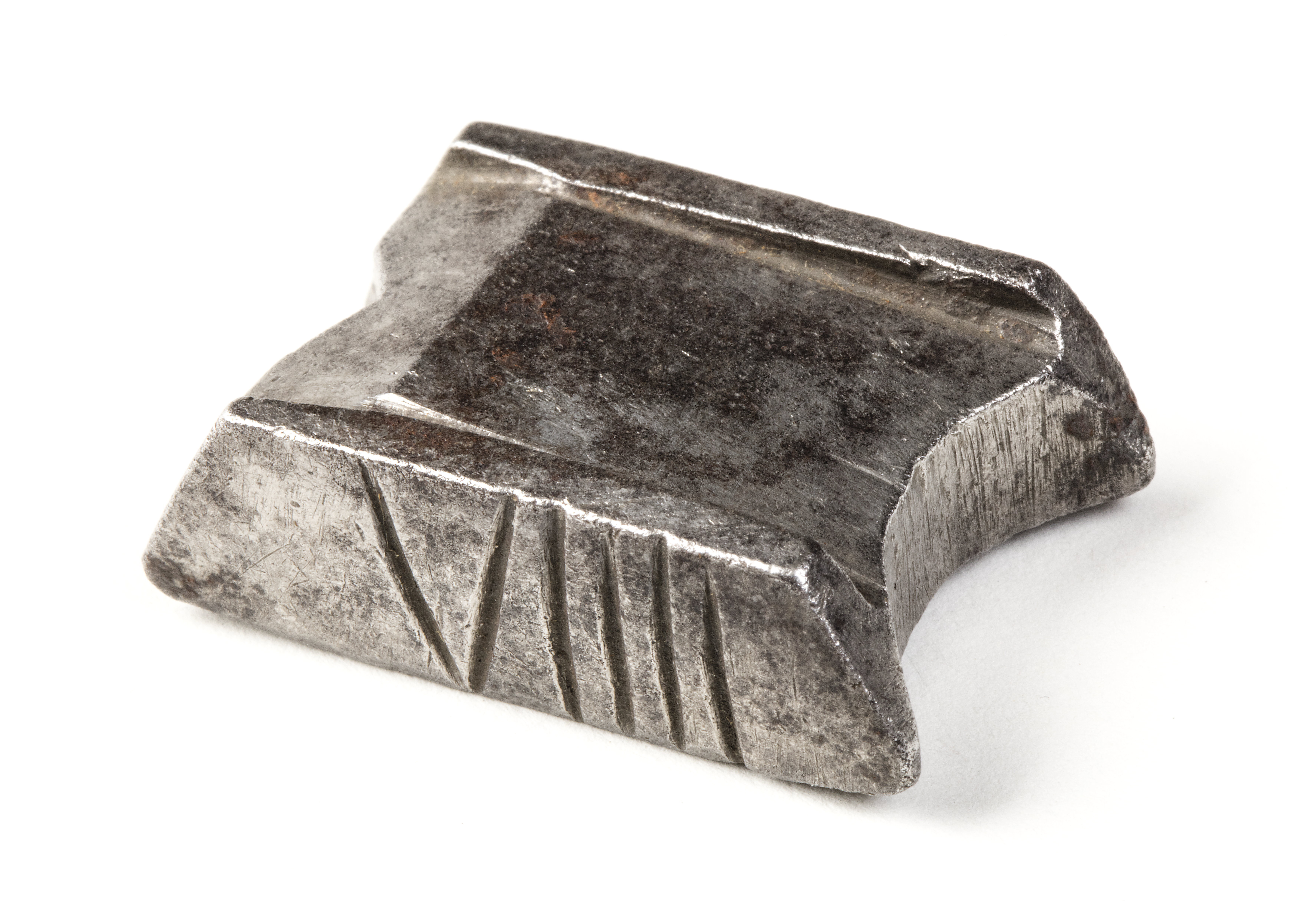 Profileringsstål, bråde, till en maskin för dragning av blylister till fönster. Prismaform. V-formigt urtag i ena änden, bågformigt i den andra. Undersidan är märkt med en punkt och ena långsidan med VIIII. På ovansidan prismaformigt urtag från båda kortsidan mot en ås--år. Ett spår på var sida av profilen.