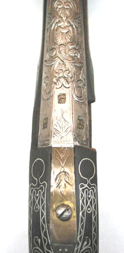Rund slätborrad pipa av stål med åttsidigt kammarstycke. Kammaren på ovansidan ciselerad med stiliserade bladornament och med tre likadana stämplar av mässing "IE"(?). Svansskruvbladet belagt med mässing. Riktmedel: graverat spolformigt stolpkorn av koppar. Fästning: Krysskruv ovanifrån samt vid mynningen en lindning med mässingstråd som tätpressats mot pipans och framstockens form. Flintlås av stål med välvt låsbleck. På låsblecket framför hanen kyrillisk (?) graverad (punsad) inskrift (teckning i inv.1867). S-formig välvd hane med lös överkäke och rund käkskruv. Rund fängpanna. Räfflat eldstål med rundad överkant, framsidan med antydd mittås. Fästning: Två låsskruvar. Nästan jämnbred avtryckare med tvärt avskuren ände. Helstock av svärtad valnöt, rikt inlagd med tenntrådar i arabeskmönster, på kolvryggen även mässingstråd. Kolvkappa av mässing snidad och ciselerad i hög relief med halvsfärisk centrumplatta. Flikarna släta. Graverad varbygel av stål med långa fästen, det främre konturerat och graverat. Sidbleck avstål med graverad bladdekor. Pipband i form av tätt lindad mässingstråd. Två profilerade rörkor av stål, spetsrörkans spets graverad.