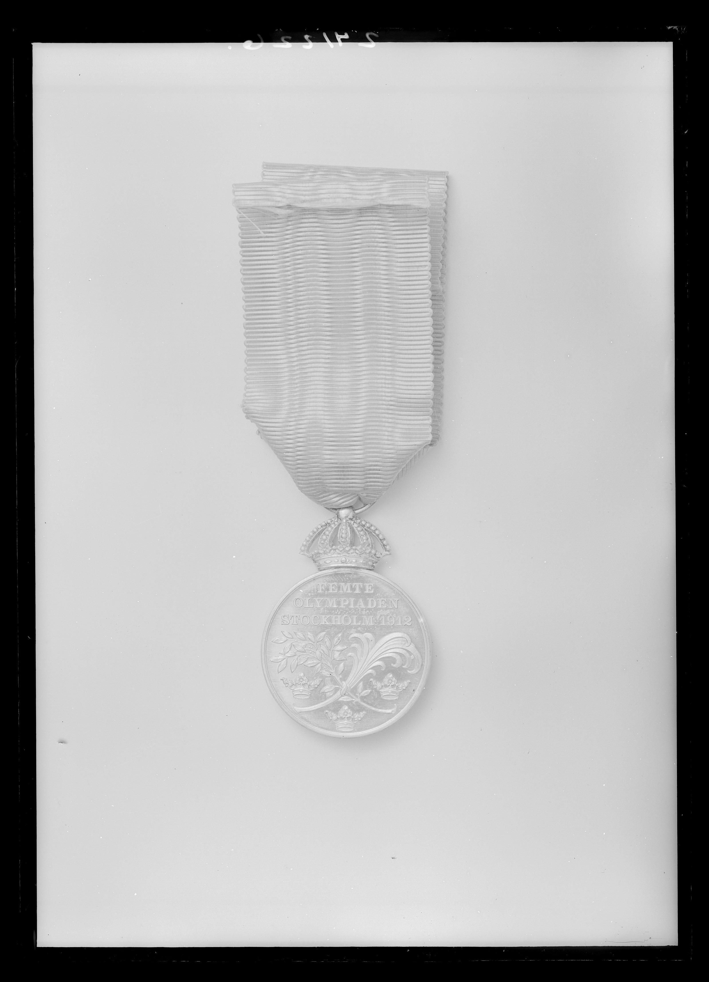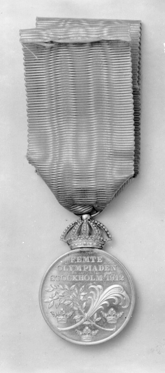 Åtsida: Gustav V, halsbild, profil vänster, signatur vid nederkanten: "A.LINDBERG", omskrift: "GUSTAF.V.SVERIGES.KONUNG". Frånsida, text: "FEMTE // OLYMPIADEN // STOCKHOLM 1912", därunder korslagda palm- och lagerkvistar mellan tre kronor. Krönt med kunglig krona av silver, igenom äpplet draget spiralformig bandring. Bandet har nr 30351.