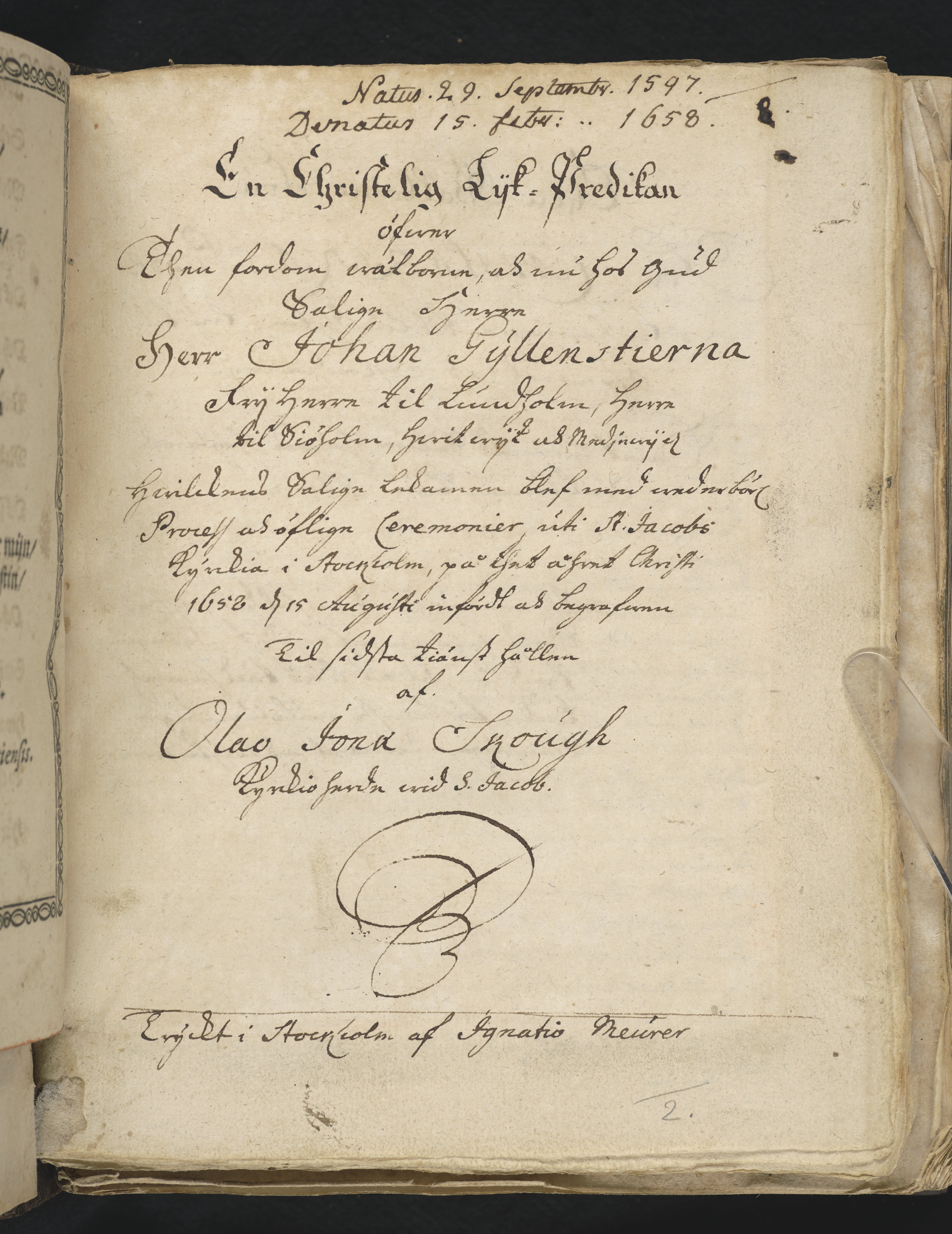 En christelig lijk-predikan öfwer... Herr Johan Gyllenstierna frijherre til Lundholm... hwilkens salige lekamen... uti St. Jacobs kyrckia i Stockholm... 1658 d. 15 augusti infördt... hållen af Olao Jonæ Skough... Tryckt i Stockholm af Ignatio Meurer.