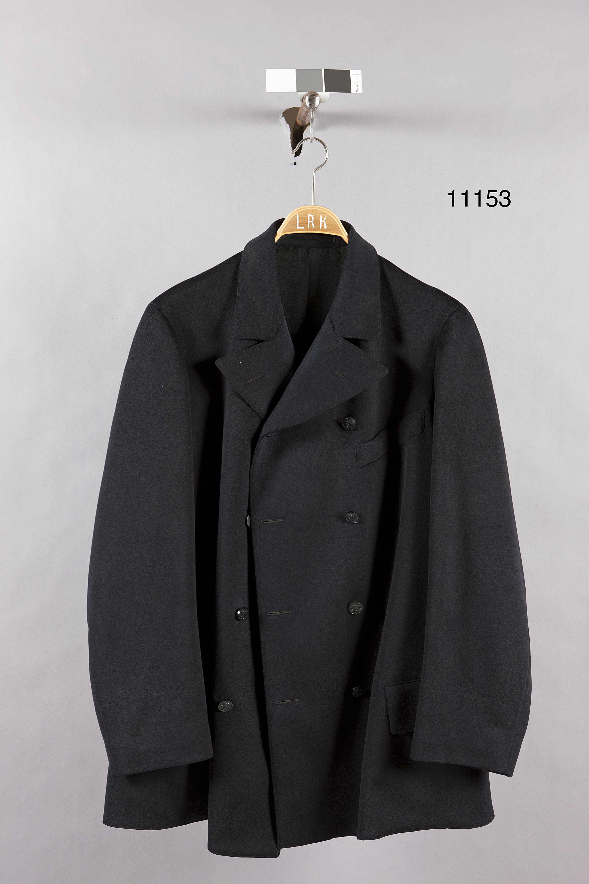 Kavaj av mörkblått kläde, tvåradig, fyra knappar i varje rad, d: 22 mm, reliefornering av sluten krona samt S S S. Fällkrage med slag. En bröstficka samt två fickor nedtill med ficklock. I ryggen ett 1235 (???) mm lång sprund i mittsömmen. Foder av svart ylle, två innerfickor samt foder i ärmarna av vitt siden med smala lila och grå ränder.