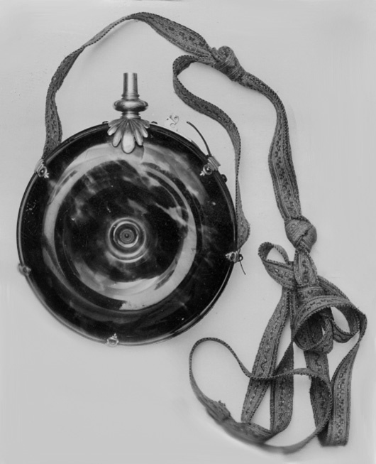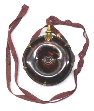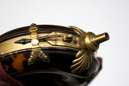 Runt, ringformigt kruthorn, helt klätt med sköldpadd, runt kanten band av förgylld mässing, b: 14 mm. Över bandet fastskruvat med vardera två skruvar fyra förgyllda, konturerade bandhållare av mässing, ett femte beslag håller en stopp för en blånerad stålfjäder till dosering. Svagt konisk pip av förgylld mässing, h: 26 mm, med rund skiva nedtill, d: 21,1 mm. Pipen står på två sjubladiga palmettblad, nervikta över livet, vartannat (fyra st) blad punsat. Bladen fastnitade på platta som är fastskruvad i mässingsringen med två skruvar, alla skruvar blånerade. På plattan dessutom konturerad sockel för doseringen. Gehäng i form av band, vävt av rött silke, b: 14 mm, l: ca 1900 mm, svartnad silvertråd i två kantränder och sicksackmittbård.