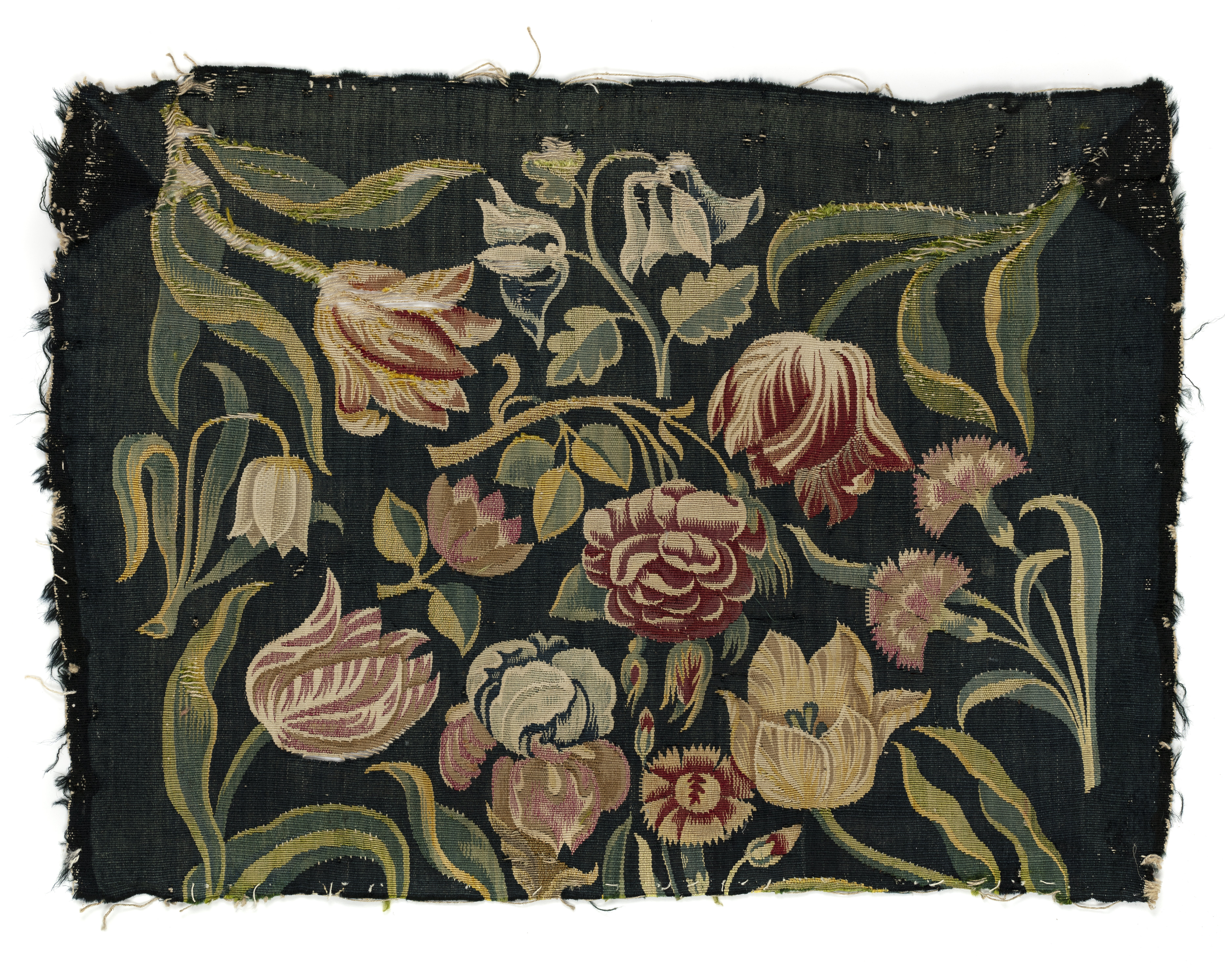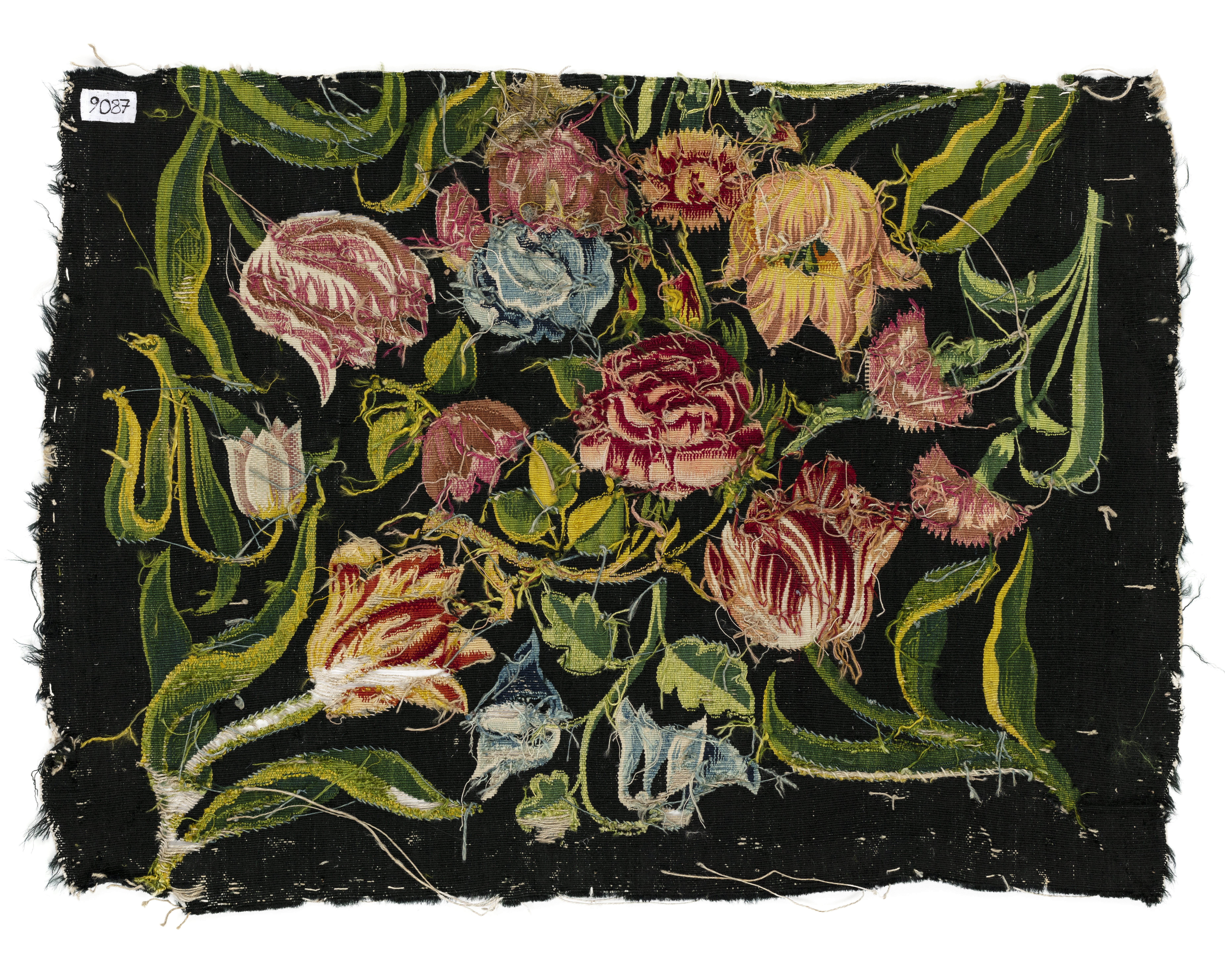 Mörkblå botten med tulpaner, nejlikor och rosor i röda, gula och blå färger. Gröna, långsträckta blad. Enligt medföljande lapp: Fragment av "Tapisserie". Blå botten med tulpaner.