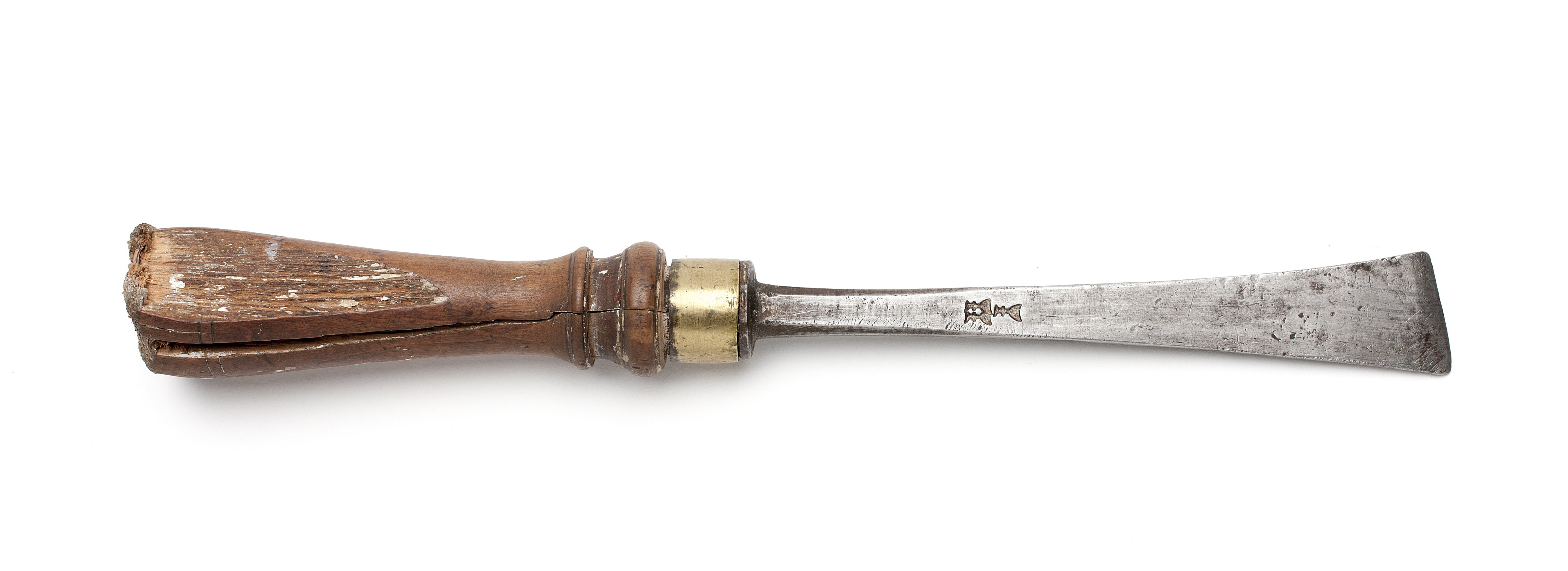 Klinga med rektangulär genomskärning, mot basen avfasade kanter. Sned egg. Stämplat på klingan tre gånger: bägarliknande form. Svarvat skaft av päronträ, med två vulster nedtill. Mässingsring.