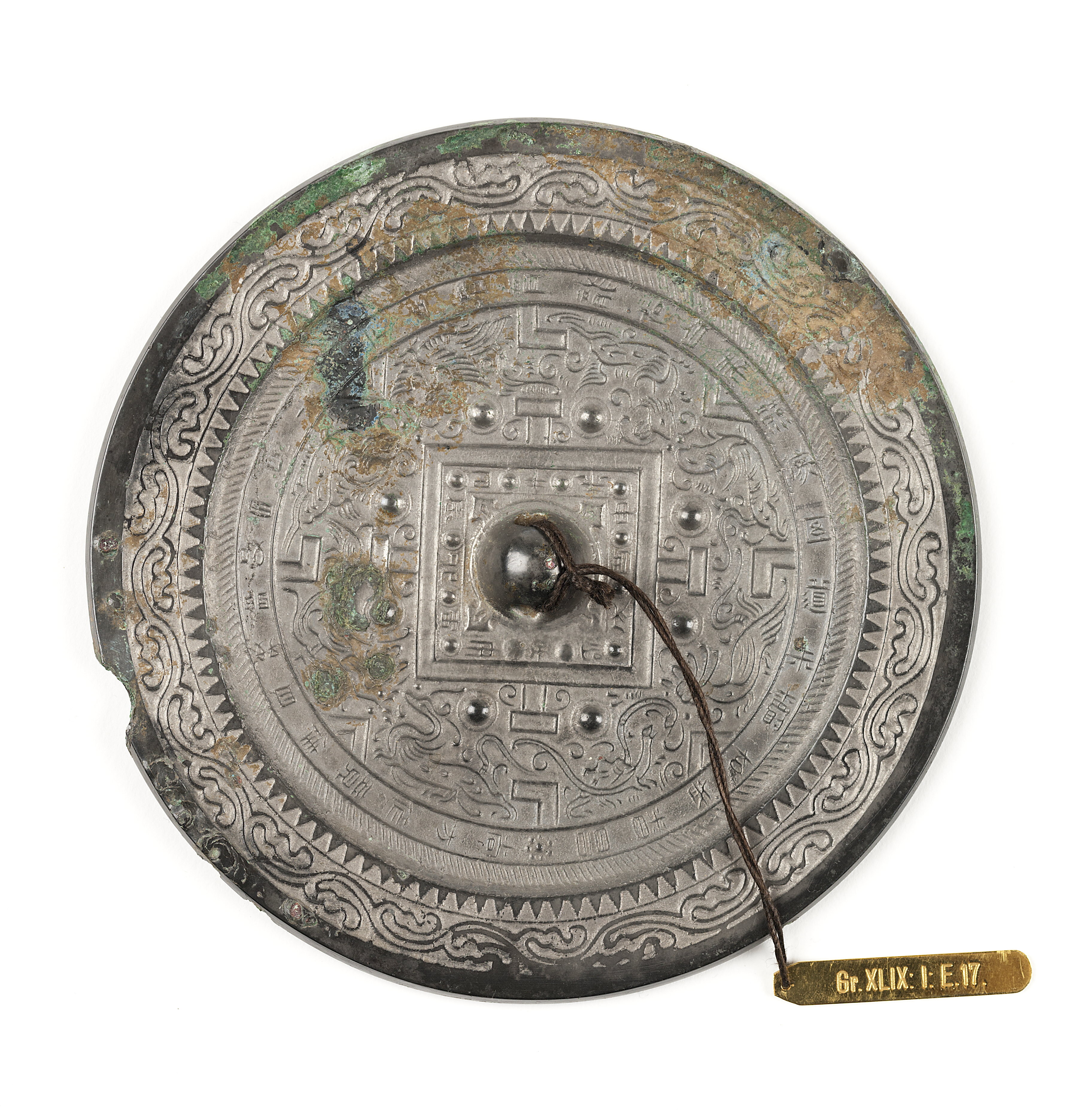 TILLÄGG: Spegel (jing) med liubo mönster daterad till Östra Han dynastin. Mönstret på denna spegel kan knytas till brädspelet liubo. Det är inte känt hur spelet fungerade eller spelets regler, men de tidigaste avbildningarna kan knytas till de odödliga. I väst har detta mönster kallats för TLV då det geometriska mönstret liknar de latinska bokstäverna. I spegelns mitt finns tecken för de terrestriska grenarna som kan representera datering. Utanför kvadraten i mitten runt knoppen finns ett fält med "TLV" mönstret samt mytologiska djur: gröna draken i öst, vermilionfågeln i söder, vita tigern i väst och den mörke/mystiske krigaren (orm vriden runt en sköldpadda) i norr. I inskriptionen omnämns Shangfang som var den kejserliga byrå som ansvarade för den kejserliga tillverkningen av bronser. Inskriptionen önskar även spegelns ägare många söner och sonsöner samt framgång. Den näst sista bården har ett triangelformat mönster som kan representera ljusstrålar. Den yttersta bården har dekorerats med abstrakta molnformationer.