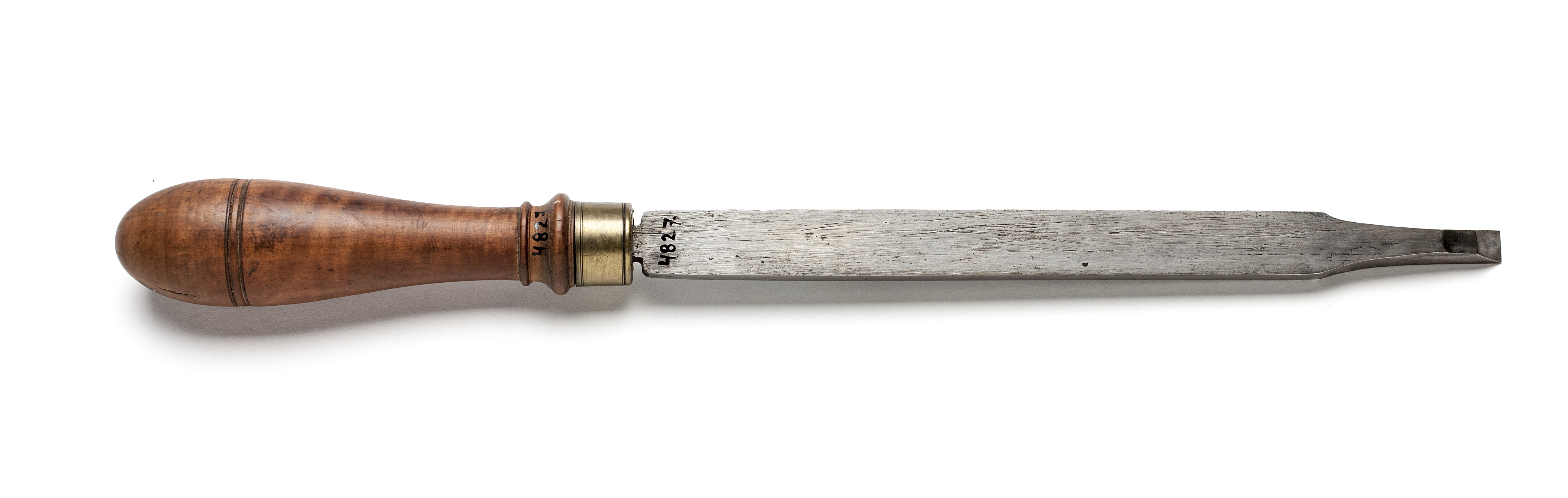 Klinga med rektangulär genomskärning, avsmalnande i änden. Svarvat skaft av päronträ med två vulster nedtill ("skoklostertyp"). Mässingsring. Stämpel i skaftets ände vid fästet: tre punkter.