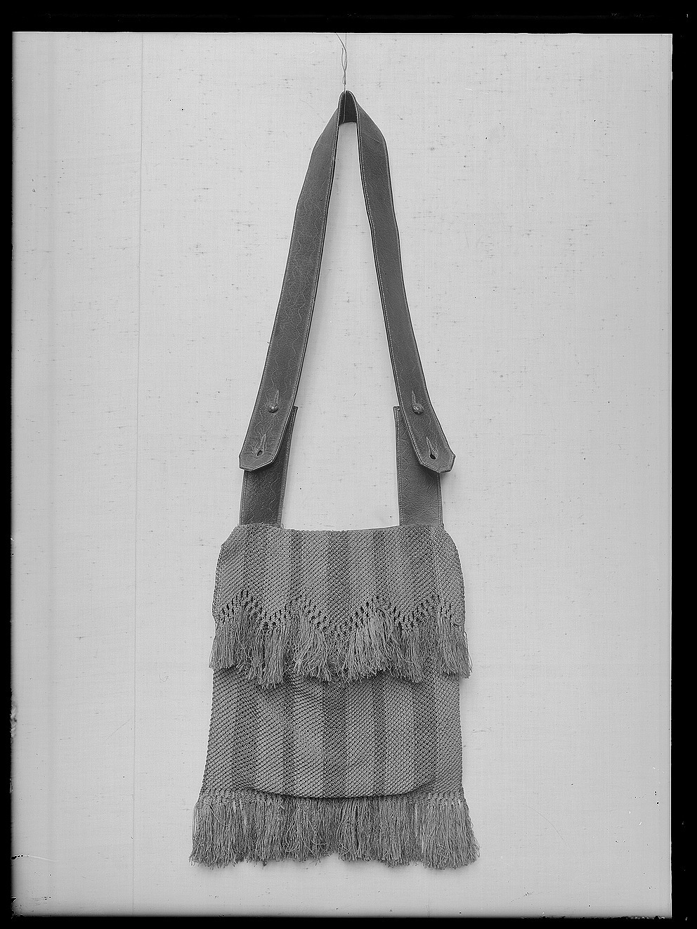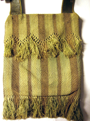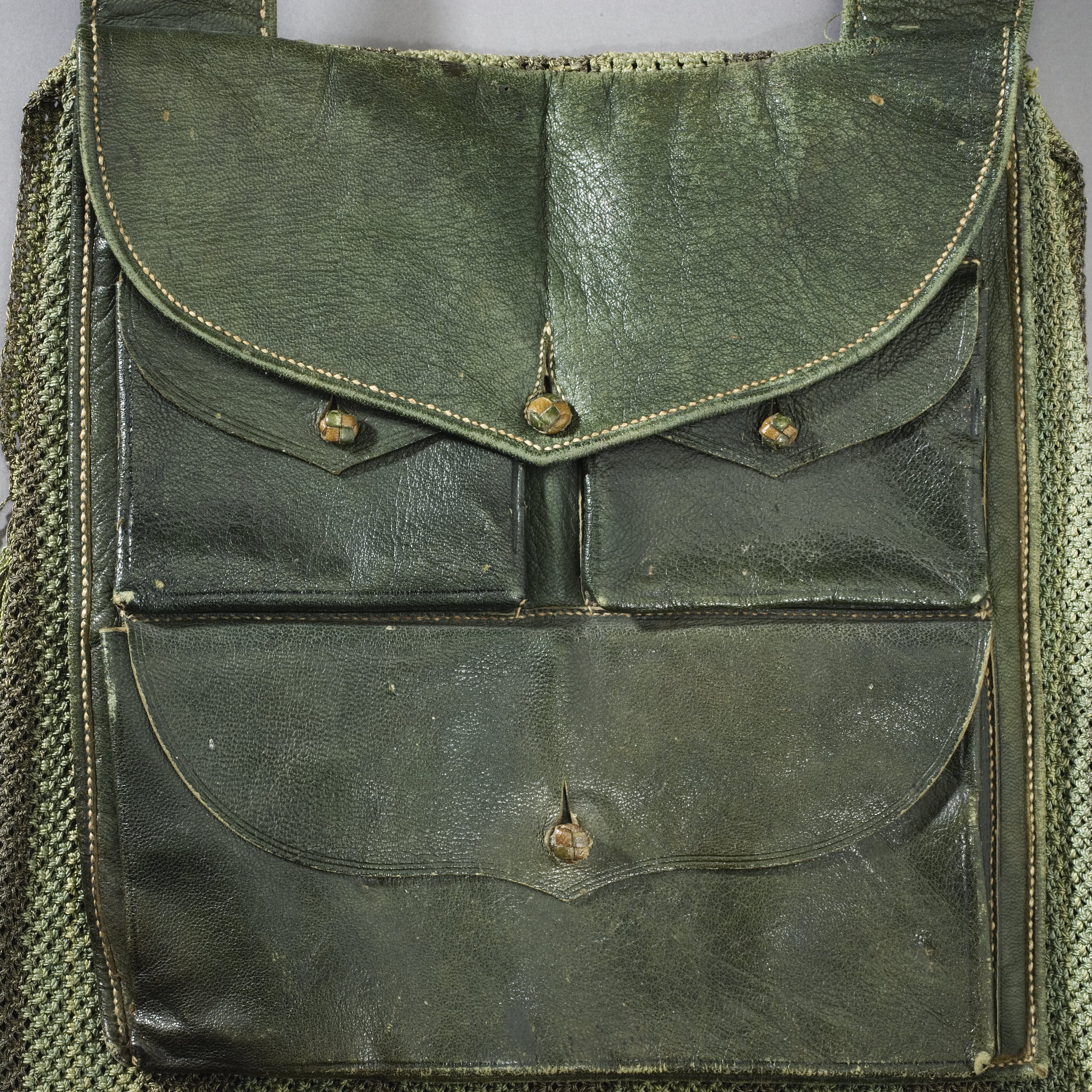 Väska av grönt skinn i form av ett stort fack fodrat med grov linneväv. På utsidan två små fack med lock samt nedtill ett brett, alla knäppta med kulformig, flätad knapp. På insidan ett fack knutet i makramé i näststruktur i grönt och guld i breda ränder. Upptill ochnedtill fransar. Bärrem av grönt läder, 48 mm bred, fästad i lika breda 145 mm långa remmar vid väskan.