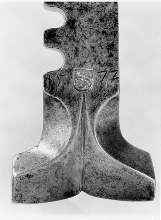 Vinda med kuggstång och tandat hjul, på kuggstångens ytterände två kraftiga stränghakar. Därinnanför på ena sidan en sköldformig mässingsstämpel med en springande hjort ovanför ett jakthorn, upptill två otydliga bokstäver (LRK vägl.1921:132, jfr nr 131 med bokstäverna A B). Skölden flankerad av inpunsat årtal: 1572. Hjulhus med ringformigt, åsat lock fäst med tre stift, åsad mittaxel med punsad dekor. Avbruten vev med fyrsidigt, ytterst rundat tvärsnitt, l: 240 mm. Hjulet på utsidan täckt med förgylld mässingsskiva med grov reliefdekor, ytterst ring med rombiska kartuscher, därinnanför en fris med jaktscener - liggande hjort angripen av hund, vildsvin anfallet av hundar och jägare med spjut, ryttare, jägare med hund (dekoren sliten på de högsta partierna). På hjulets insida runda förgyllda, infällda myntkartuscher med reliefporträtt - varannan en kvinna halsbild, profil v -varannan en skäggig man, profil h. På hjulhusets undersida vid bärhaken en förgylld myntkartusch med en skäggig man i antik krona, omgiven av lagerkrans, d: 20 mm. Bärhaken genombruten och avslutad med hjärtformigt löv. På hjulhusets kant en etsad rankbård mot prickad, mörk bakgrund. På hjulhusets insida fäst en kraftig hank av hampa, överklädd med flätning med röda sammetsband i rutmönster.