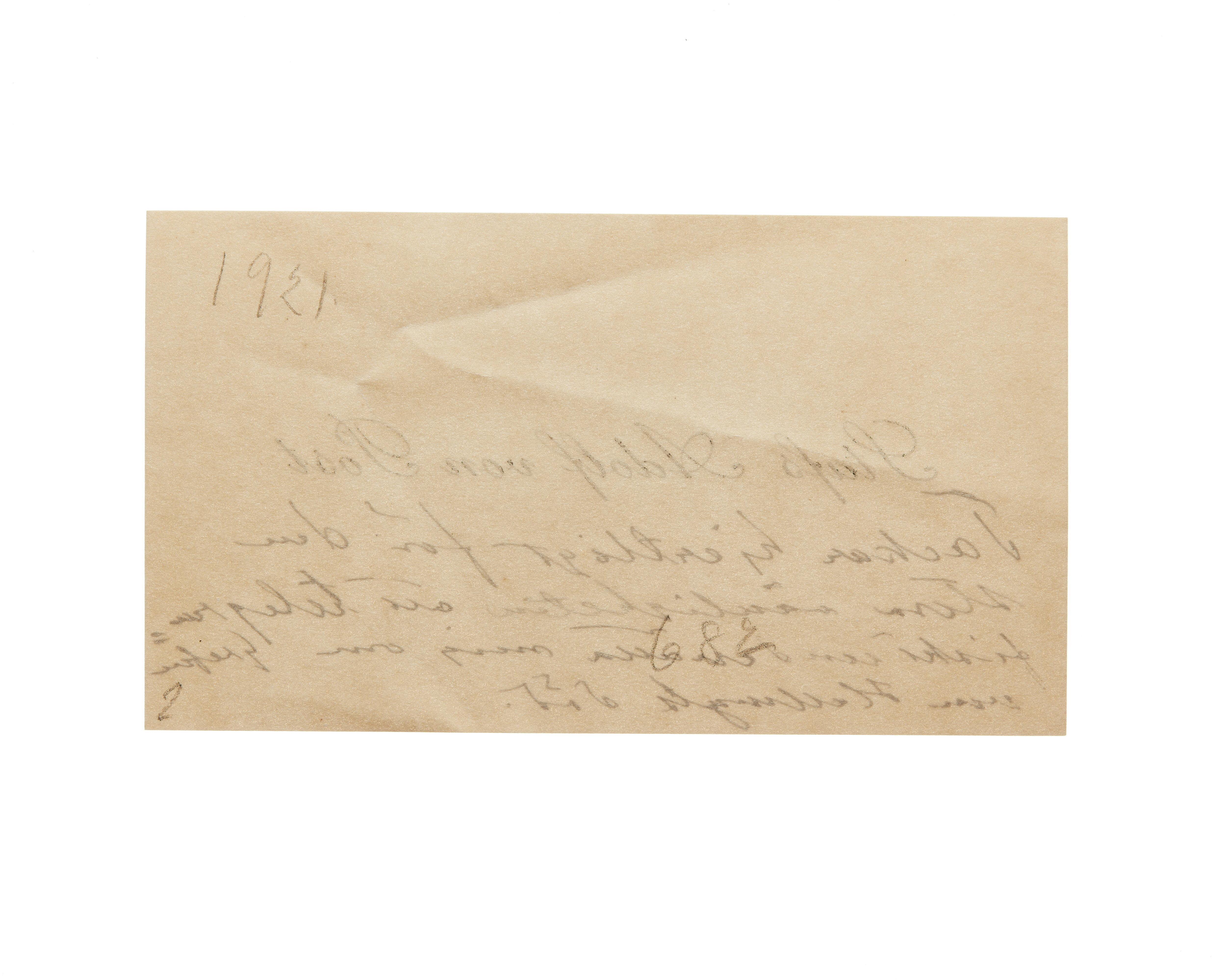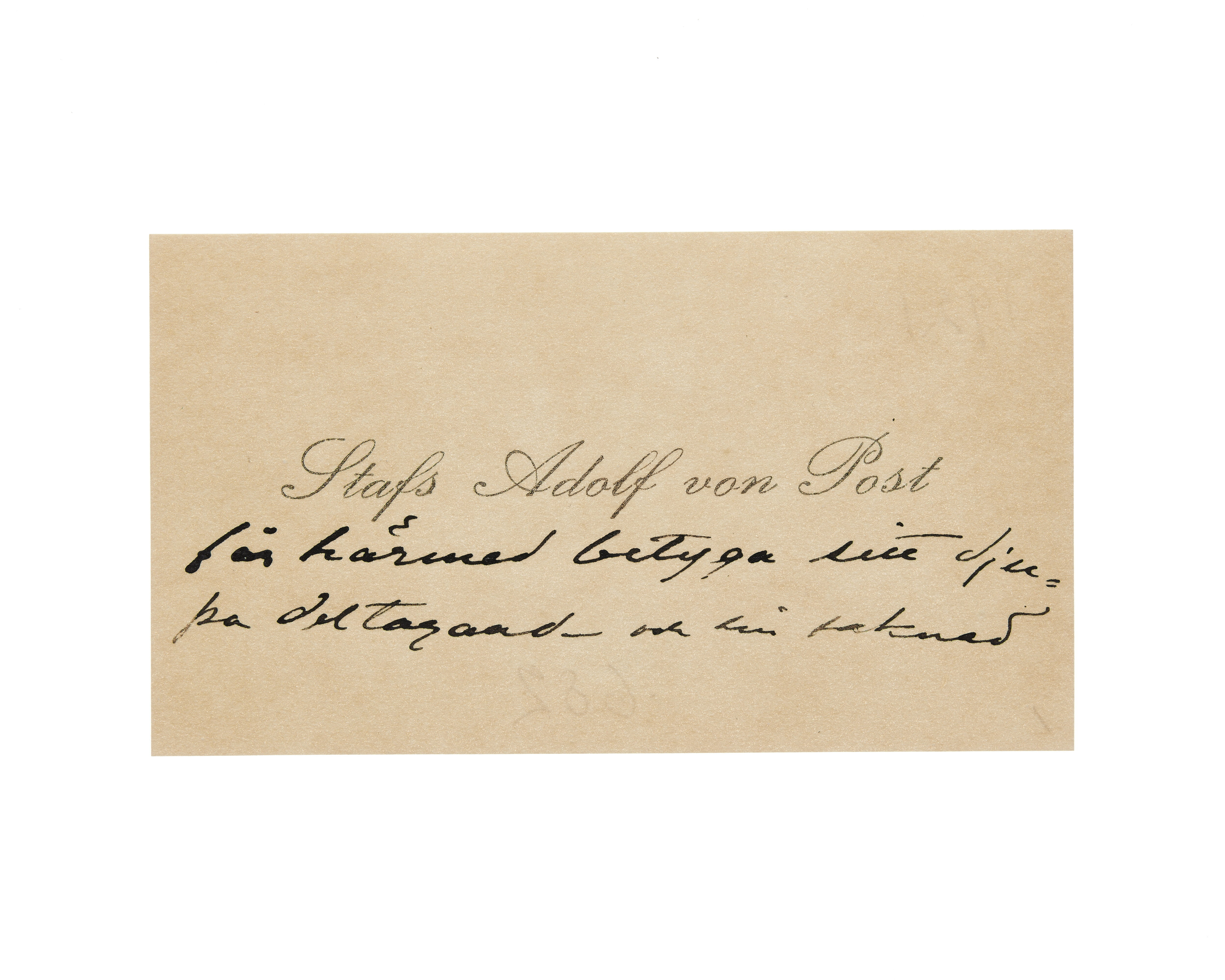 Två visitkort från Stafs Adolf von Post. Första kortet daterat 1921. Handskrift "....". Andra kortet daterat 1921. Handskrift "...".