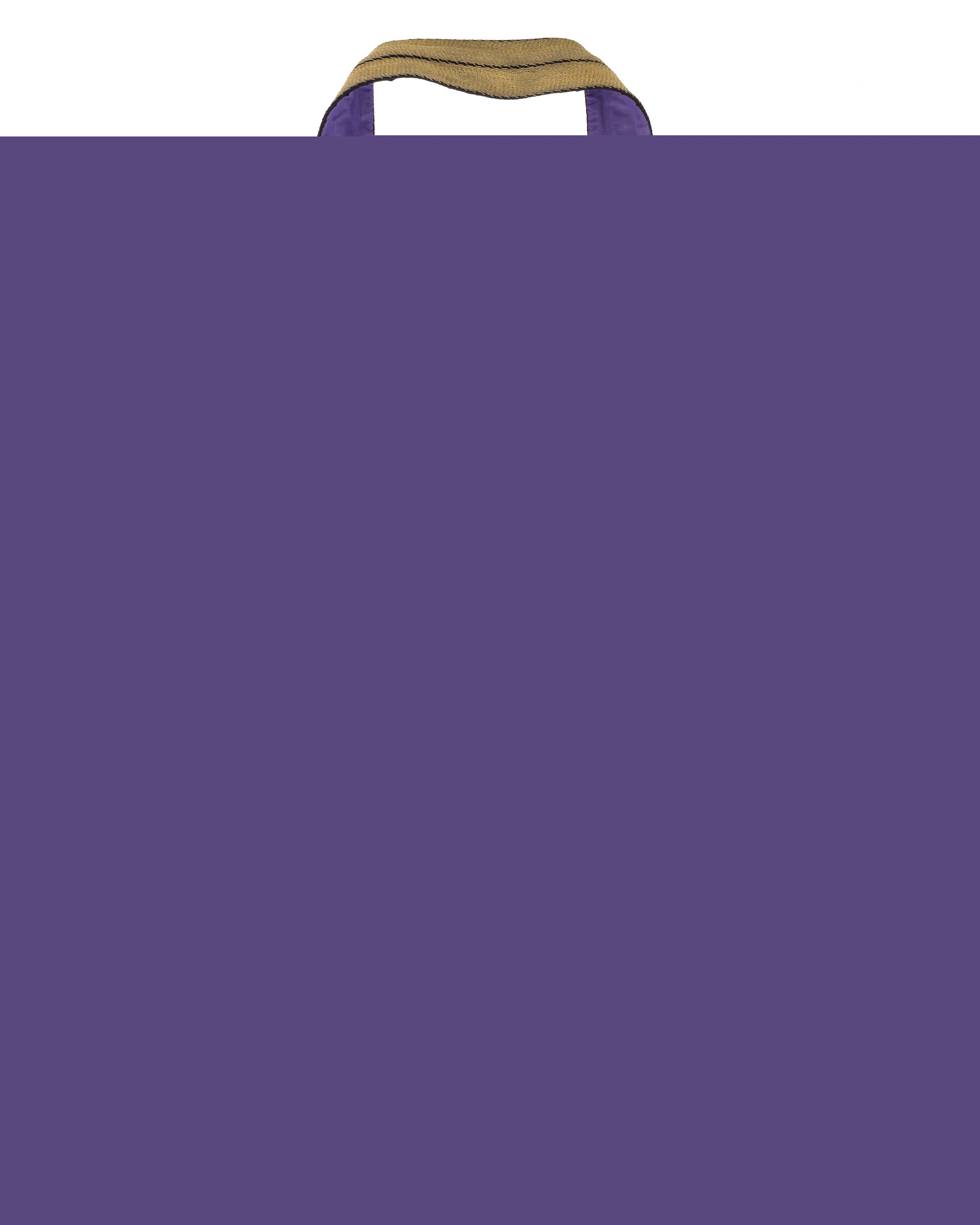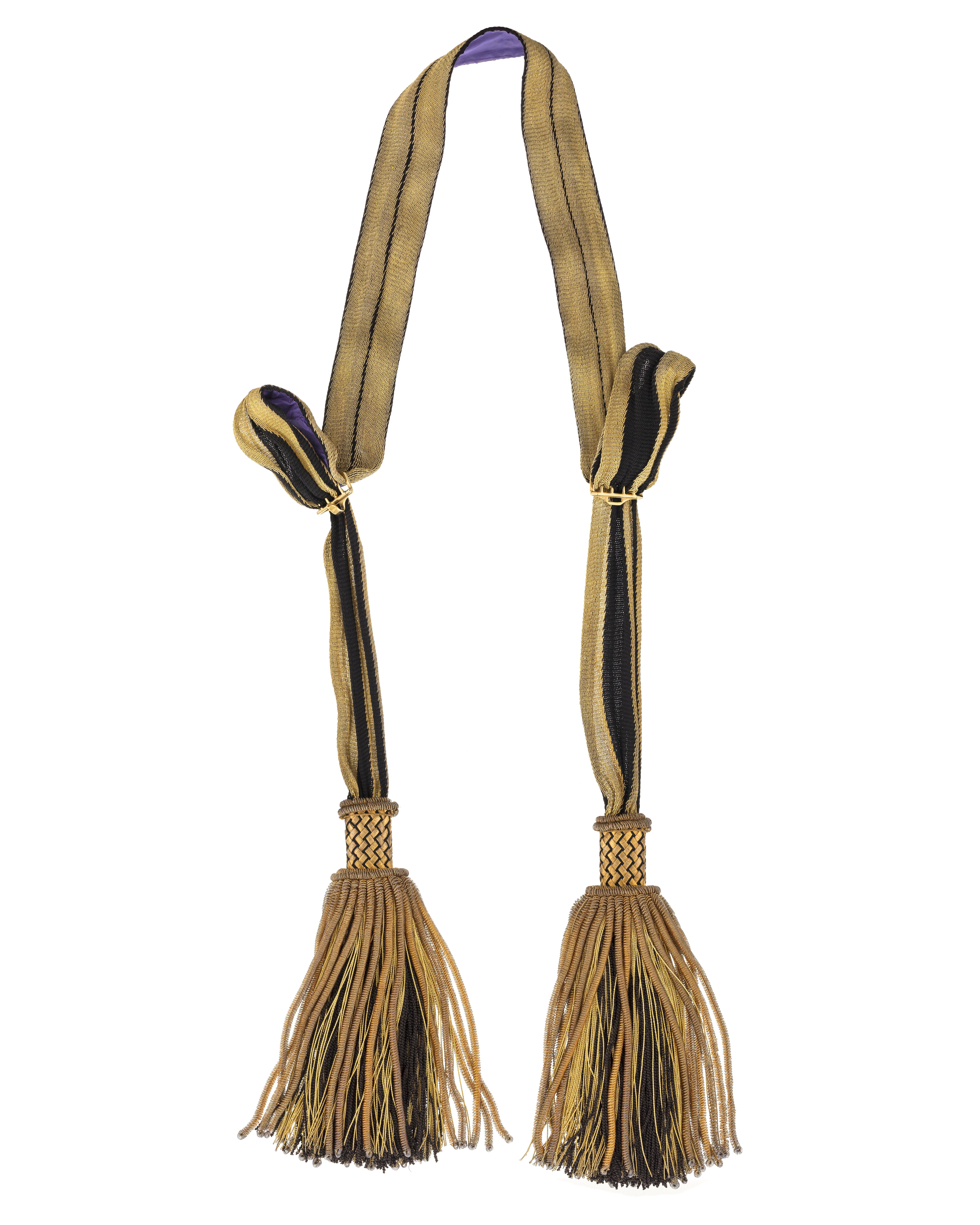 Skärp av virkad guldtråd med smal rand utmed mitten av svart silke. Foder av lila siden. Öppna tofsar av grova buljoner med svart silke innanför.